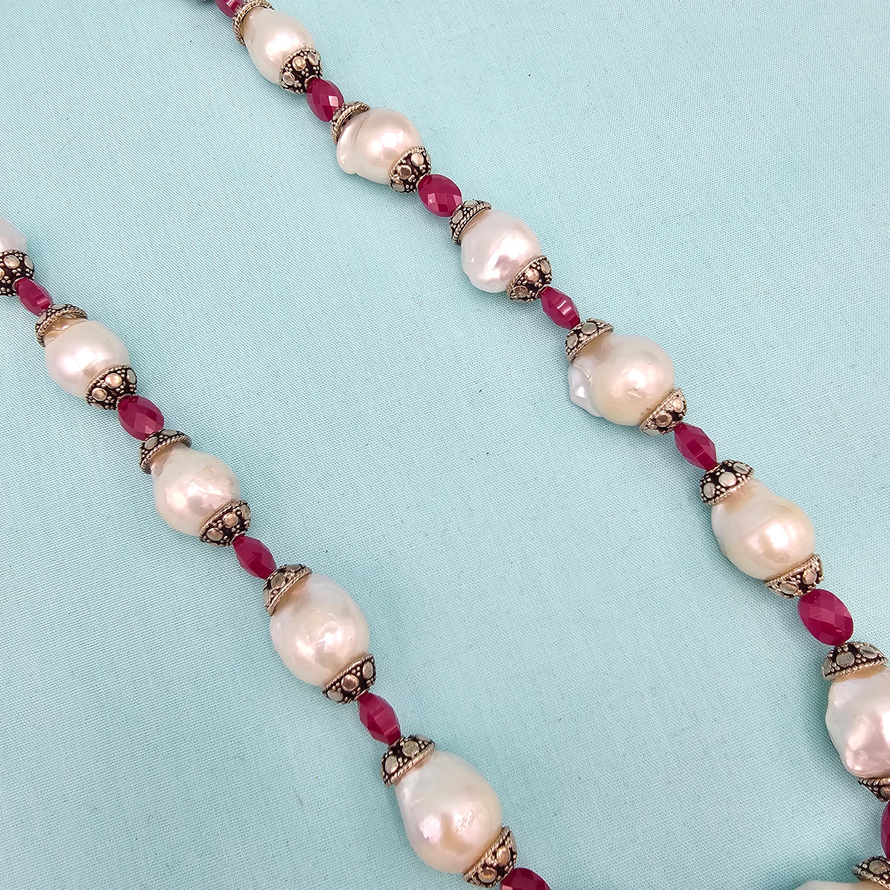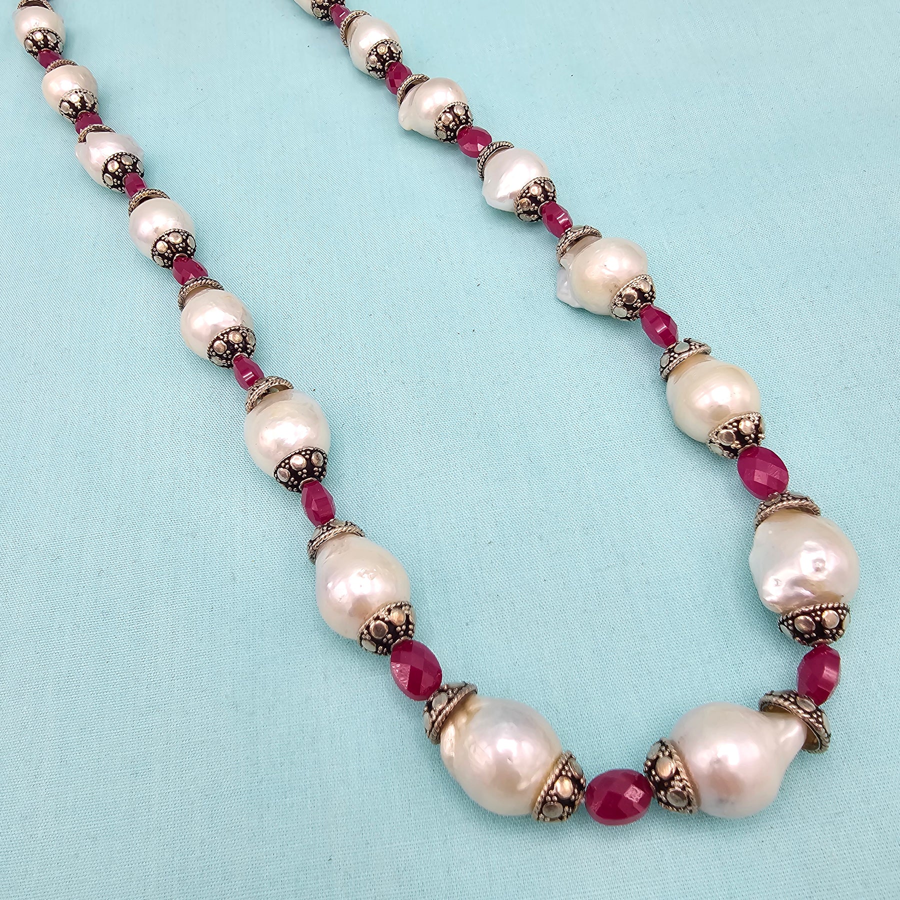 Elevate your style with this elegant Baroque Pearl and Ruby Beads Chain combined with silver caps, a timeless accessory that blends classic charm with vibrant color. Each piece is handcrafted using natural baroque pearls, known for their organic shapes and lustrous glow, paired with premium ruby beads for a touch of rich, royal red.