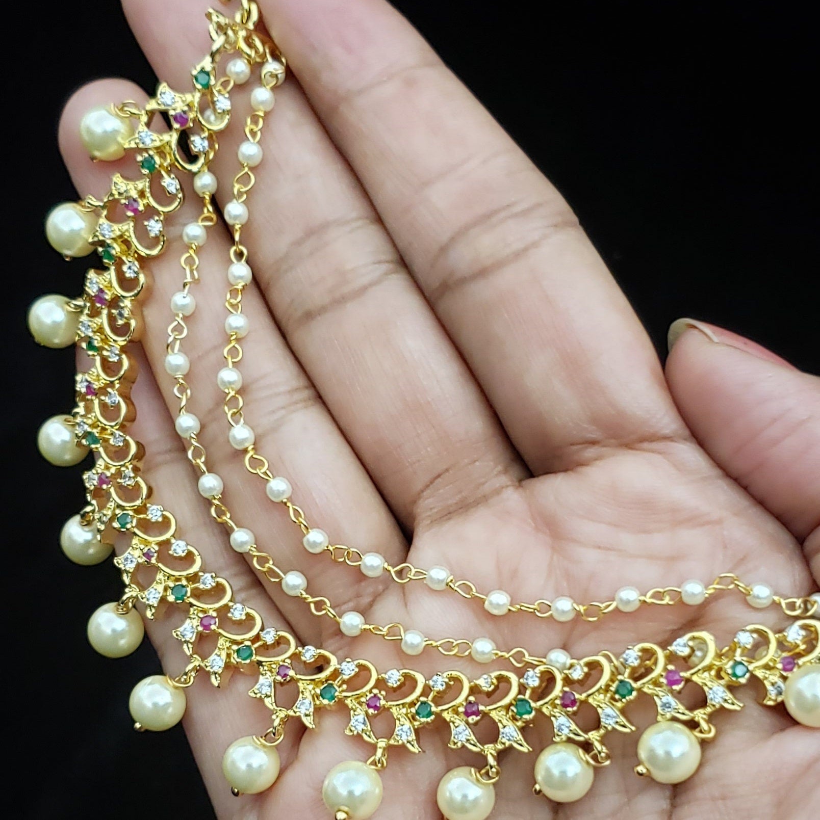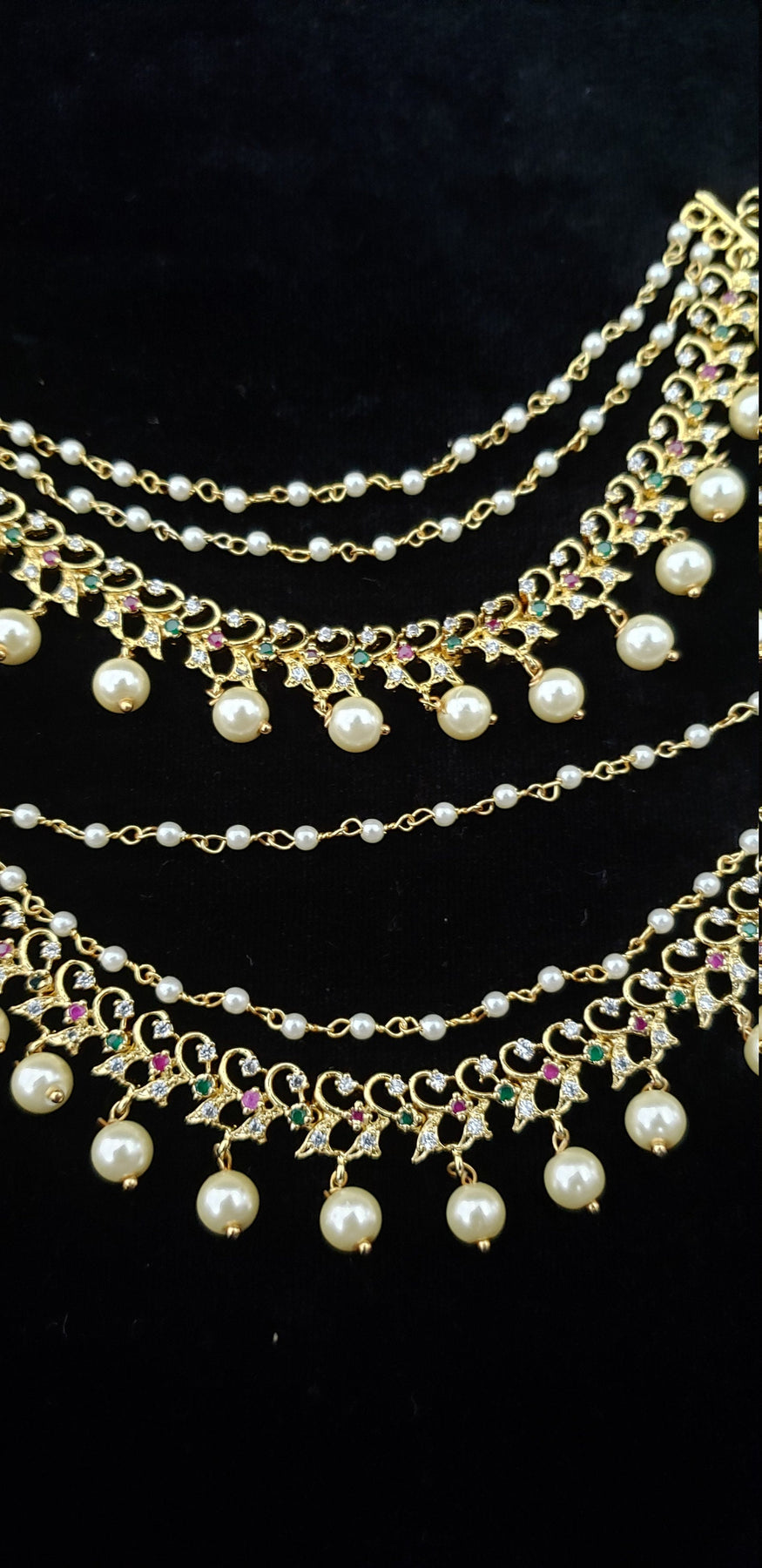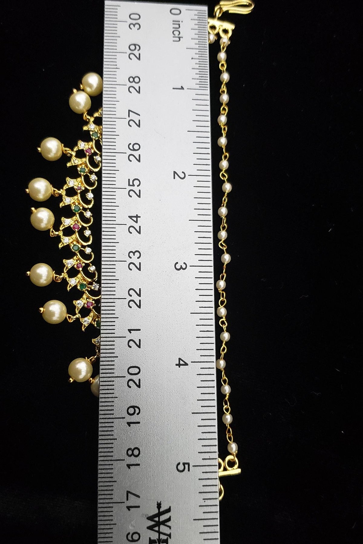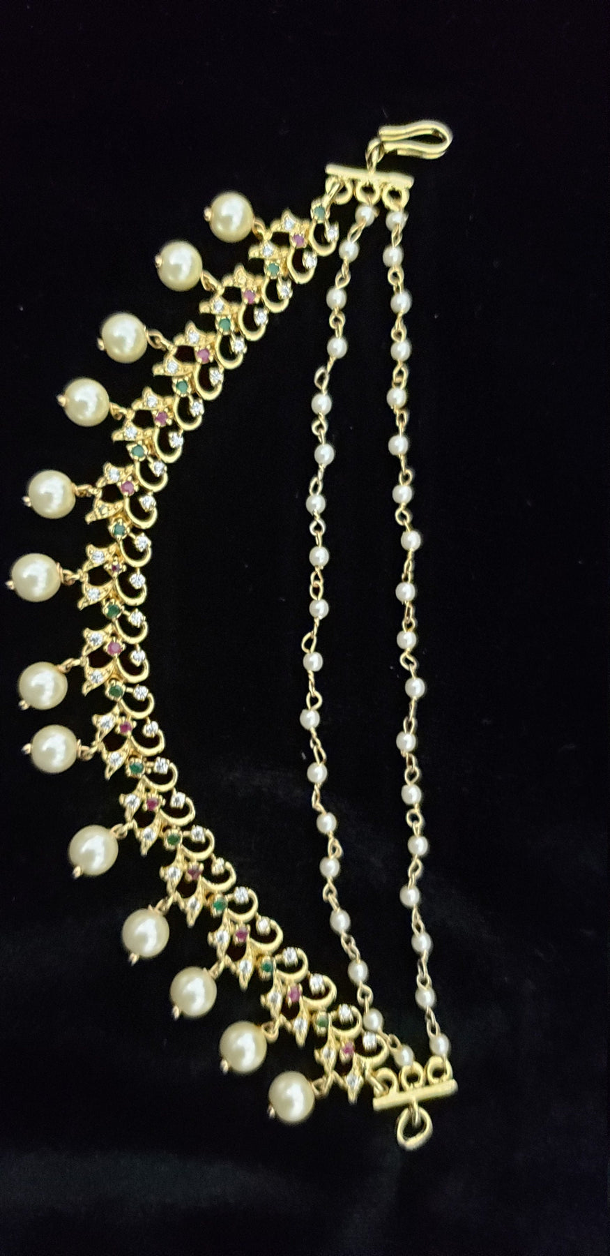 These Chempaswaralu are elegantly designed, from the house of glam to add a hint of ethnic beauty to any look. Representing a classic fusion of exquisite craftsmanship and feminine elegance, this set will definitely be a treasured inclusion in every woman's jewelry collection. The gold finish further enhances a long-lasting shine and sparkling sense.