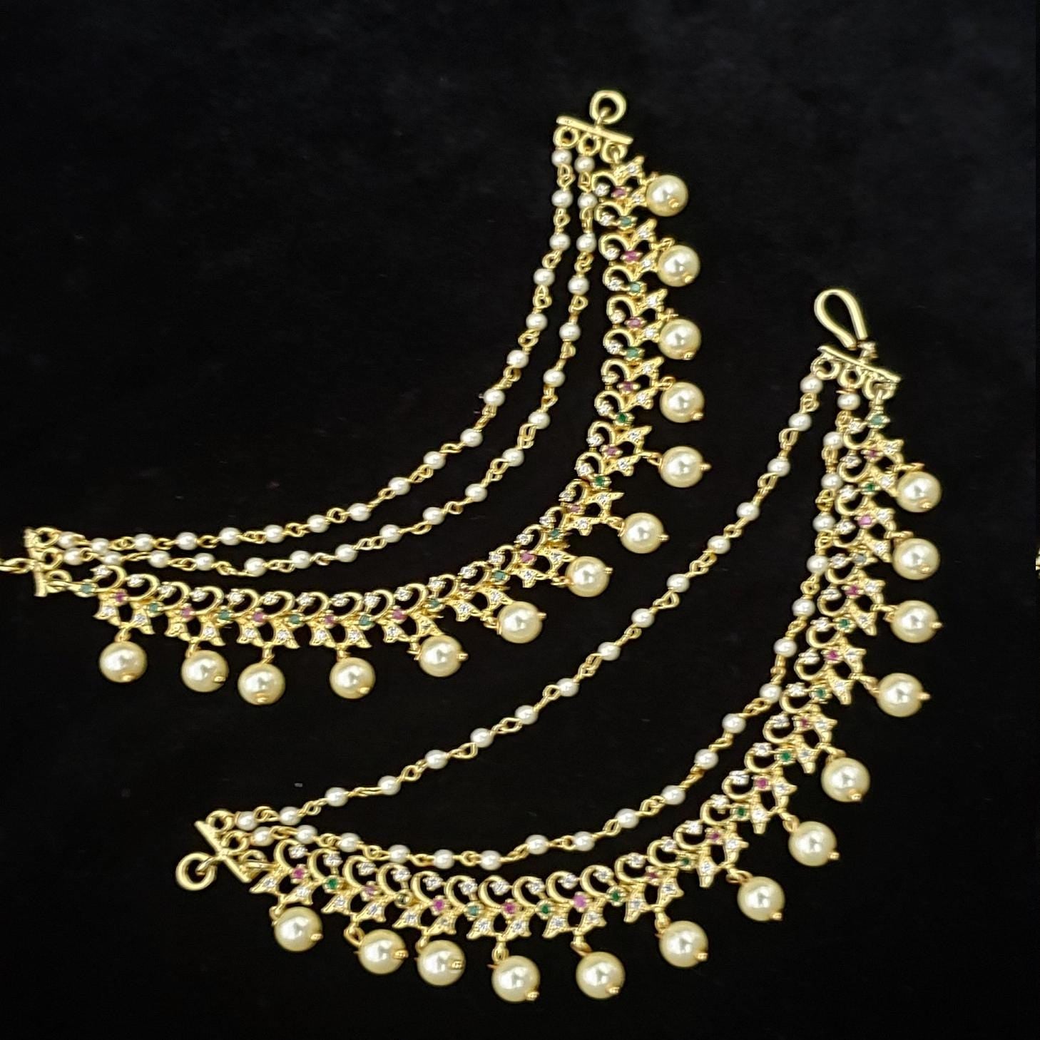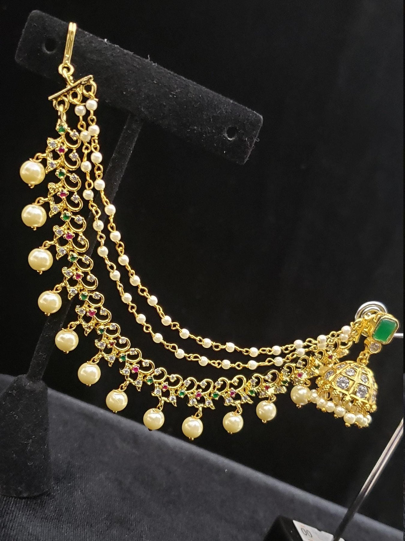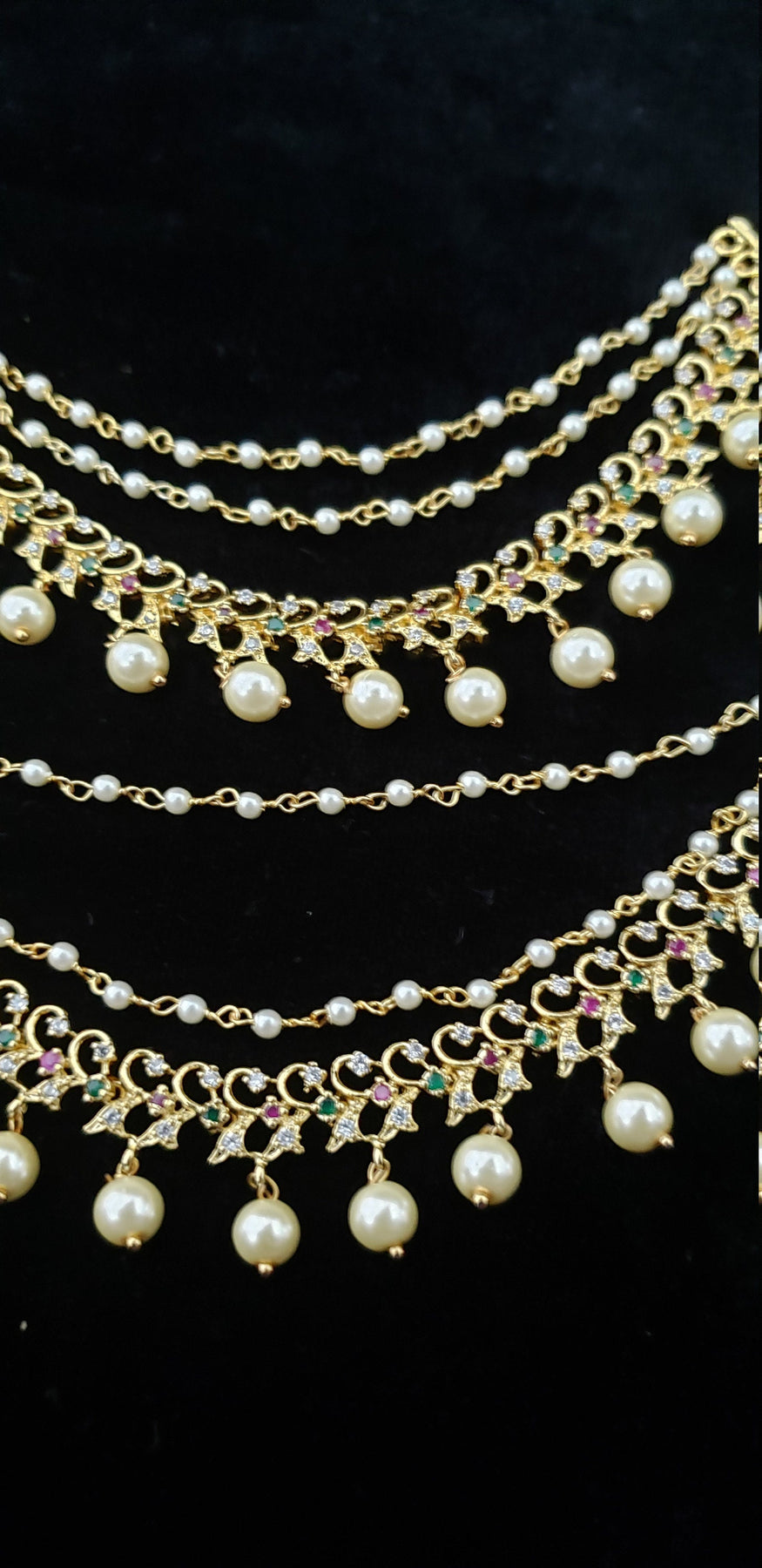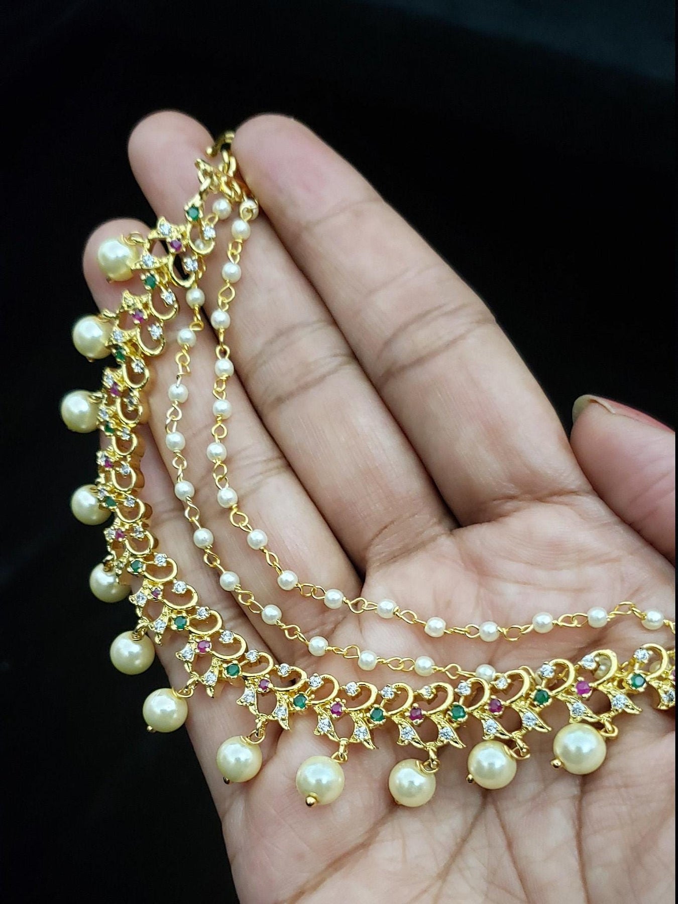 These Chempaswaralu are elegantly designed, from the house of glam to add a hint of ethnic beauty to any look. Representing a classic fusion of exquisite craftsmanship and feminine elegance, this set will definitely be a treasured inclusion in every woman's jewelry collection. The gold finish further enhances a long-lasting shine and sparkling sense.