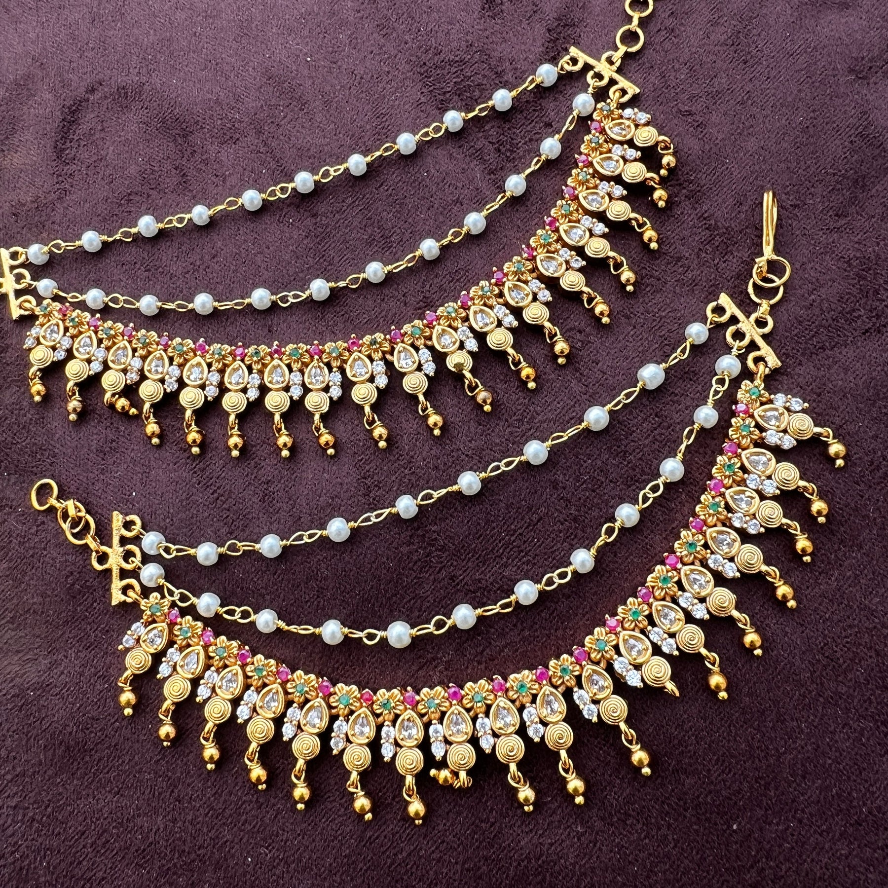 These Chempaswaralu are elegantly designed, from the house of glam to add a hint of ethnic beauty to any look. Representing a classic fusion of exquisite craftsmanship and feminine elegance, this set will definitely be a treasured inclusion in every woman's jewelry collection. The gold finish further enhances a long-lasting shine and sparkling sense.
