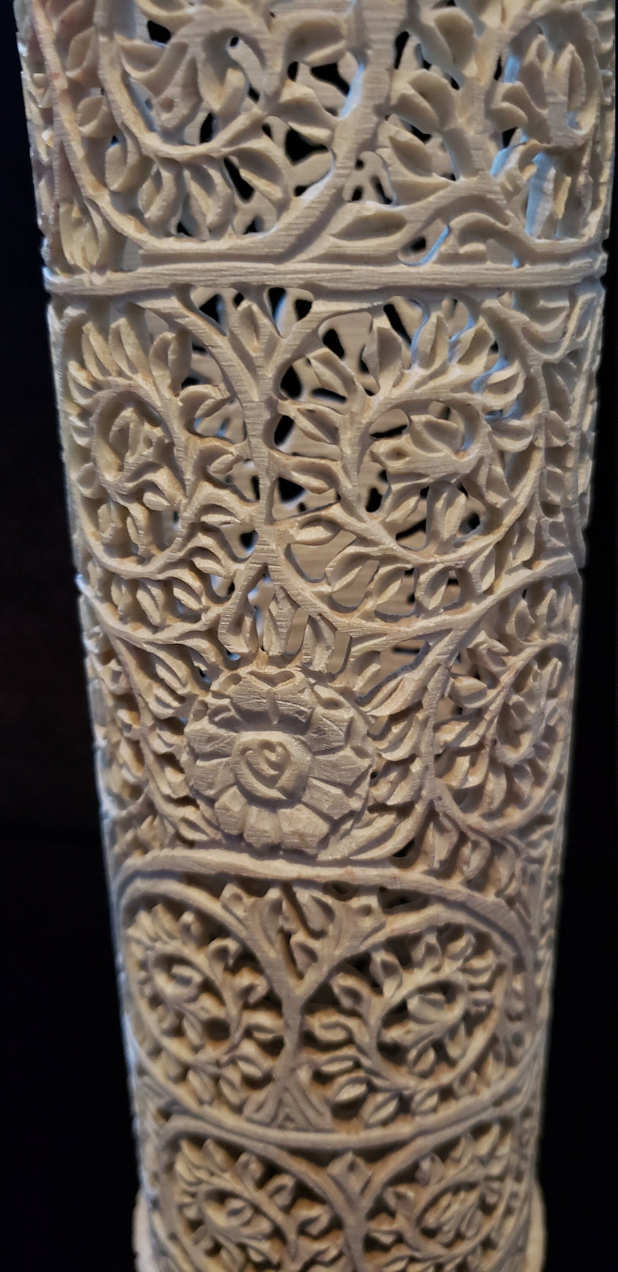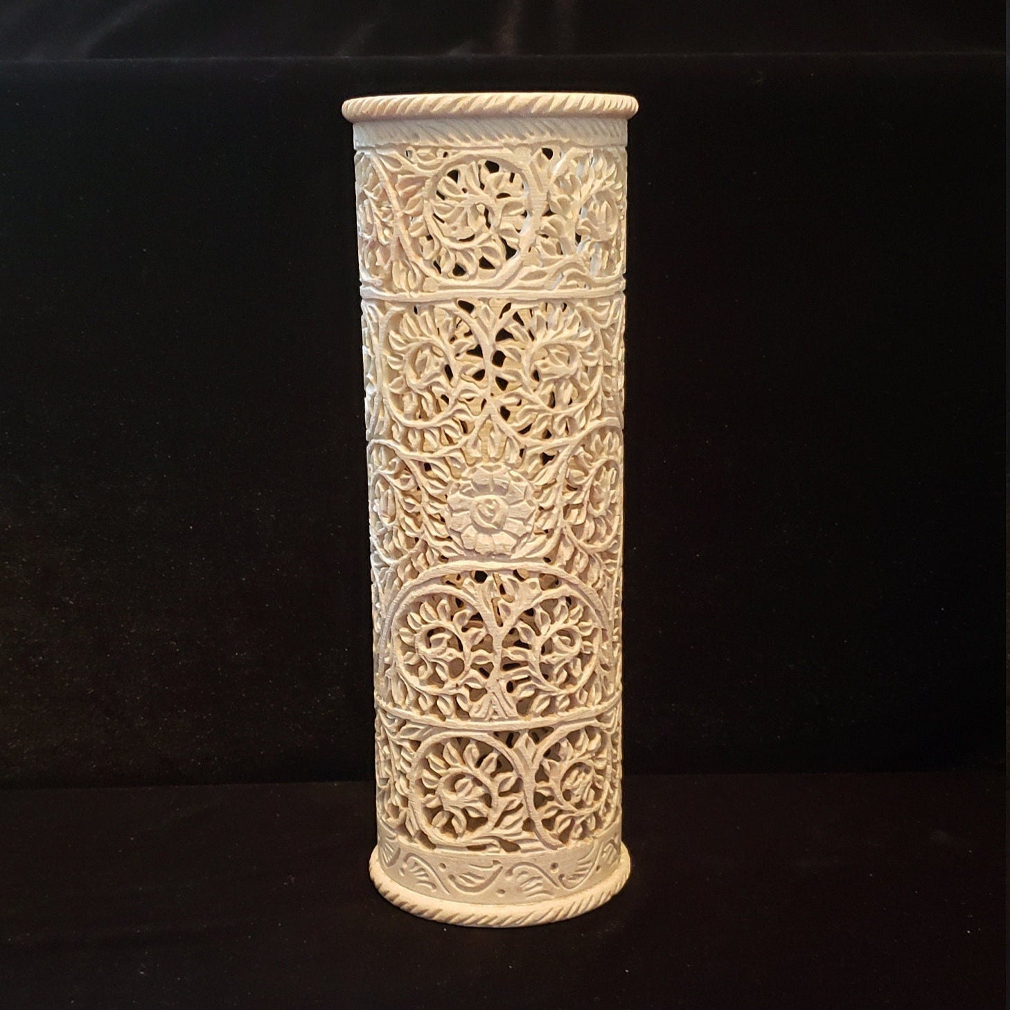 Floral patterns in this item are the attractions of this candle holder/ Flower vase . This beautiful soapstone vase will enhance your office, home, indoor or outdoor space. . Amazing carving and sculpting by hand. Timeless floral motifs.