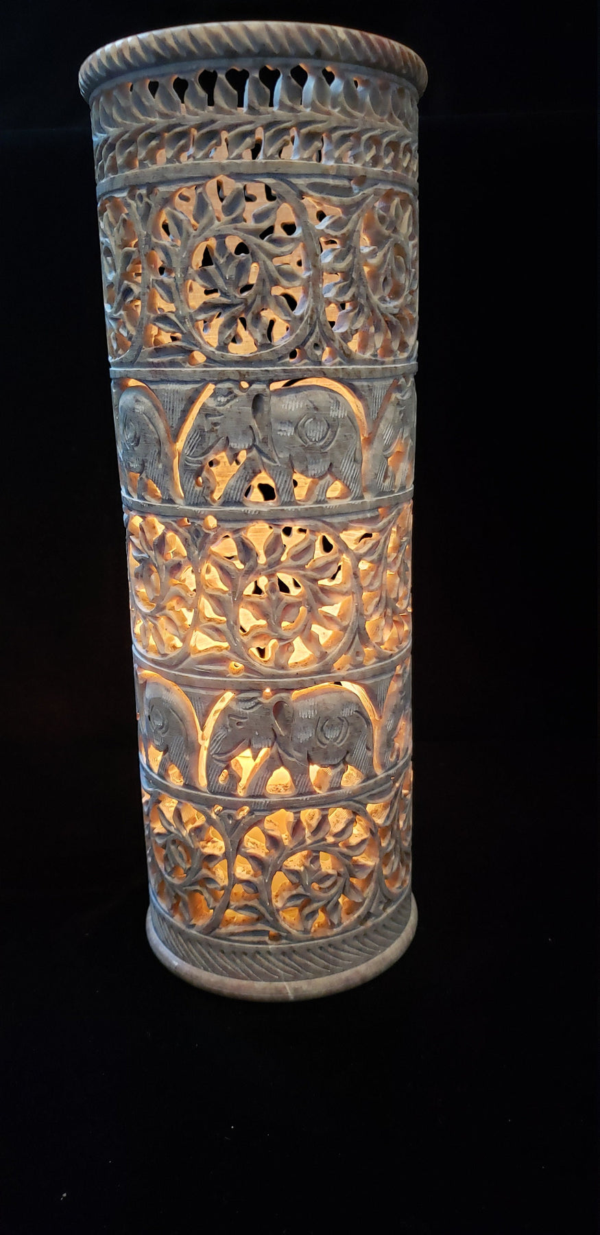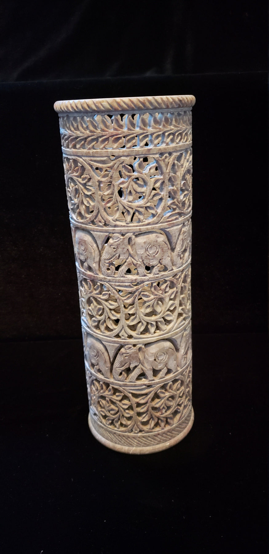 Floral patterns in this item are the attractions of this candle holder/ Flower vase . This beautiful soapstone vase will enhance your office, home, indoor or outdoor space. . Amazing carving and sculpting by hand. Timeless floral motifs.