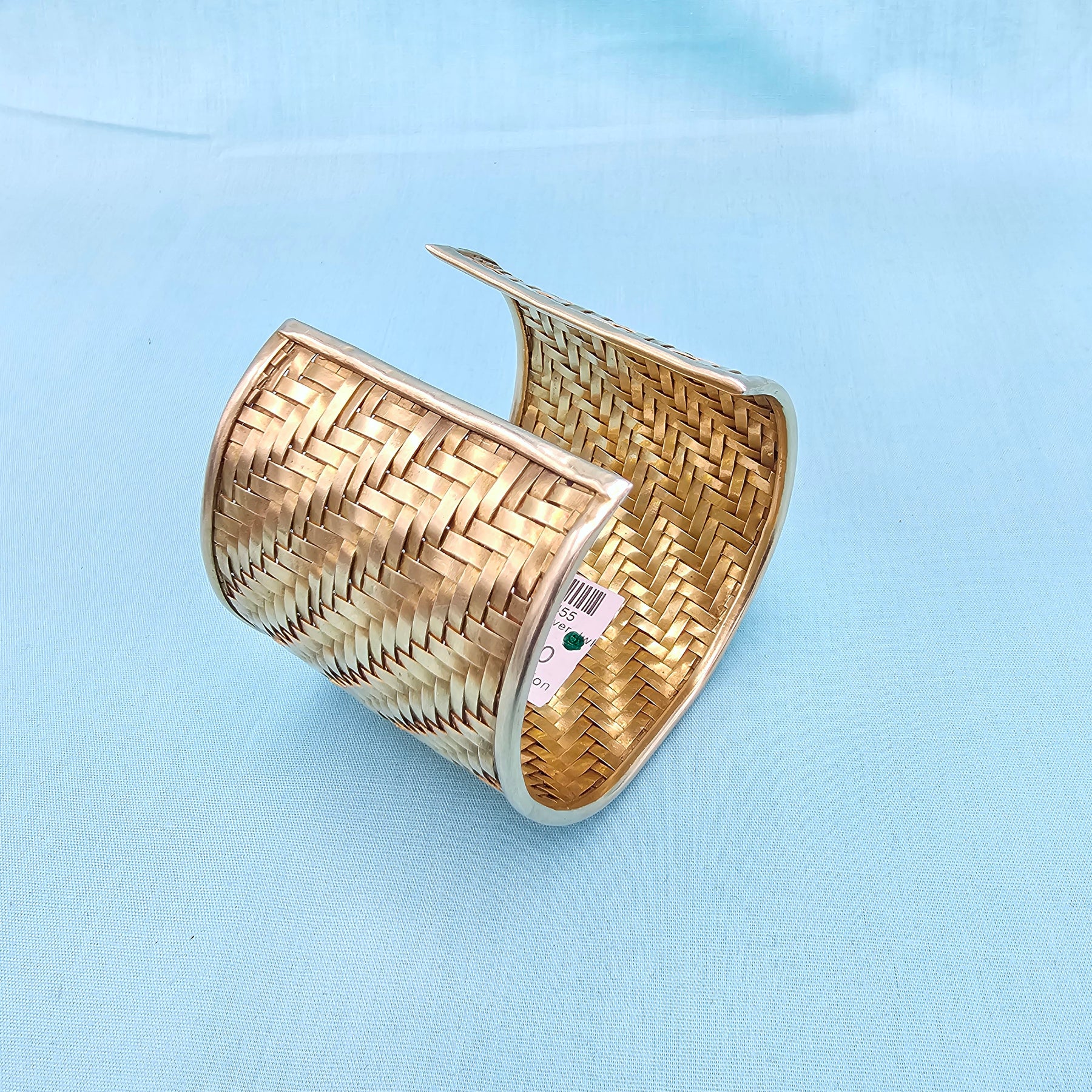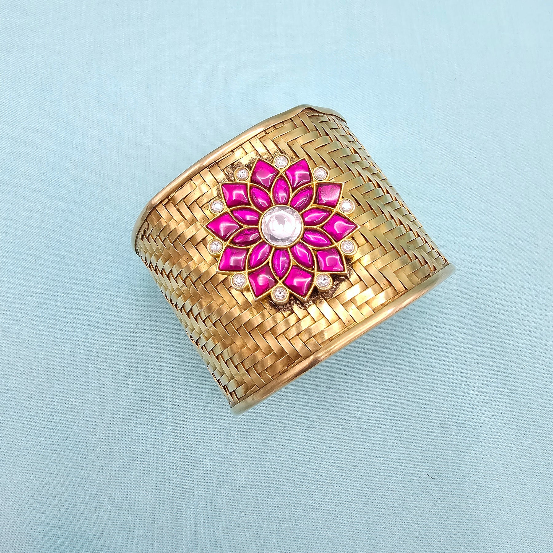 92.5 Silver Gold color Kundan flower broad bangle, silver kada weaving pattern. One size fits many. Adjustable as per hand size.