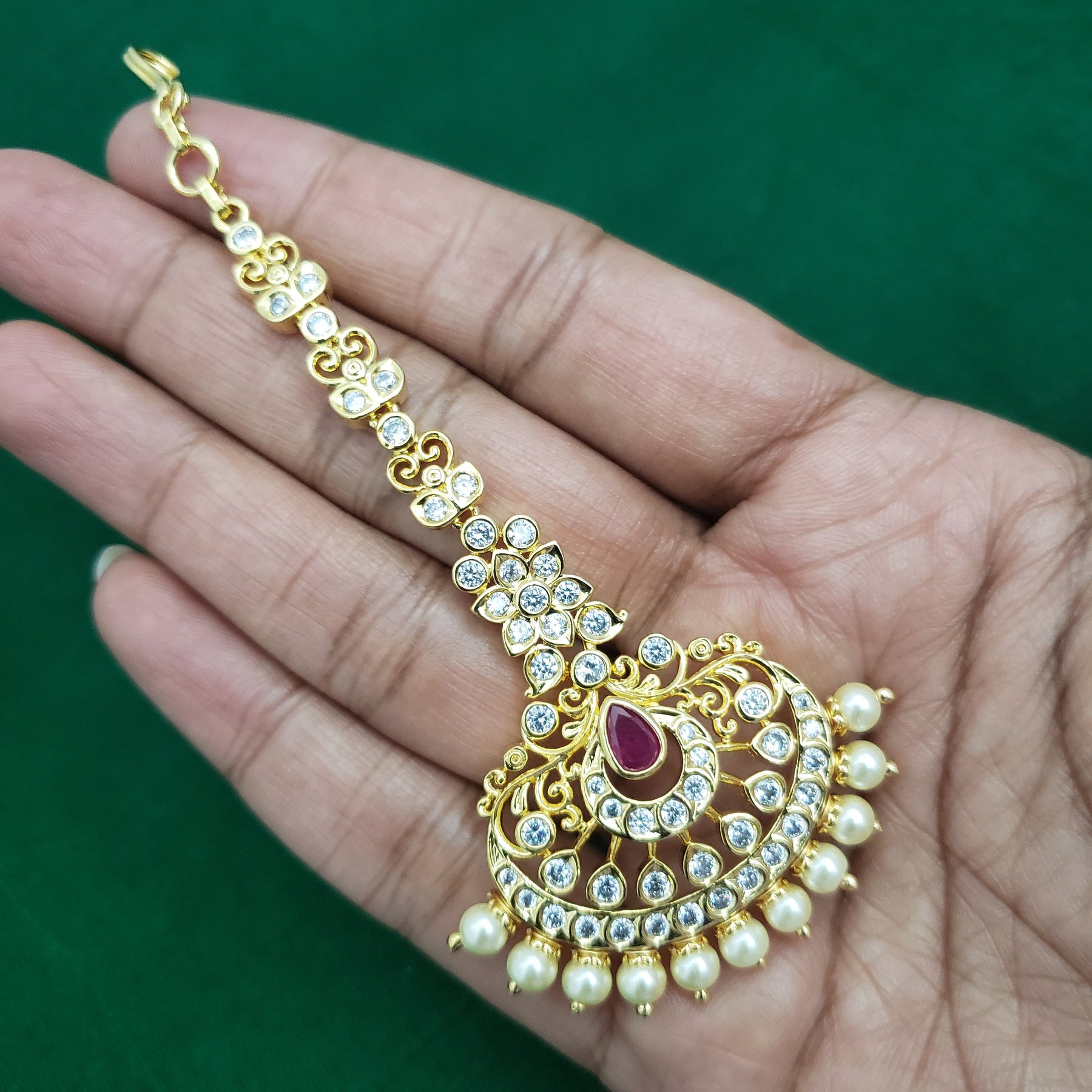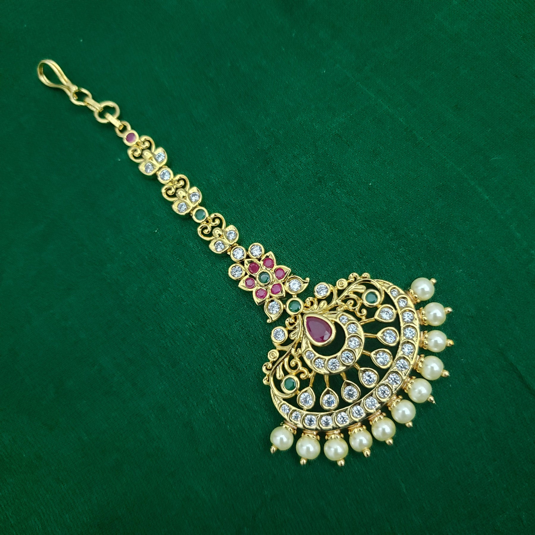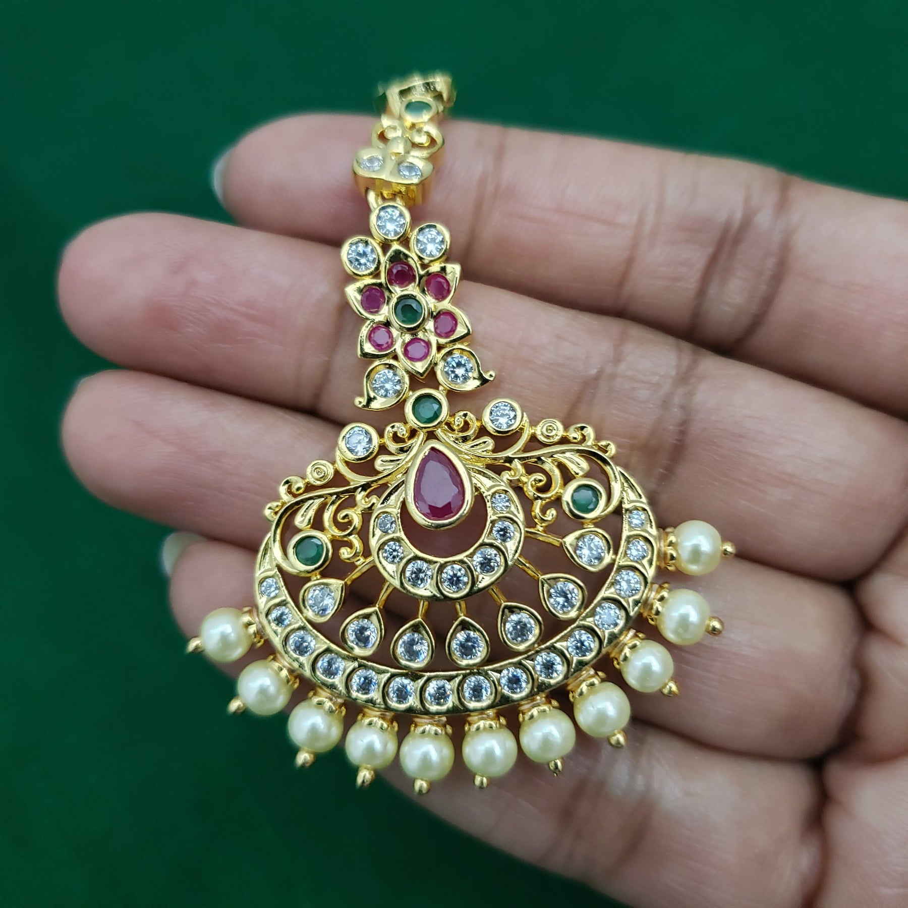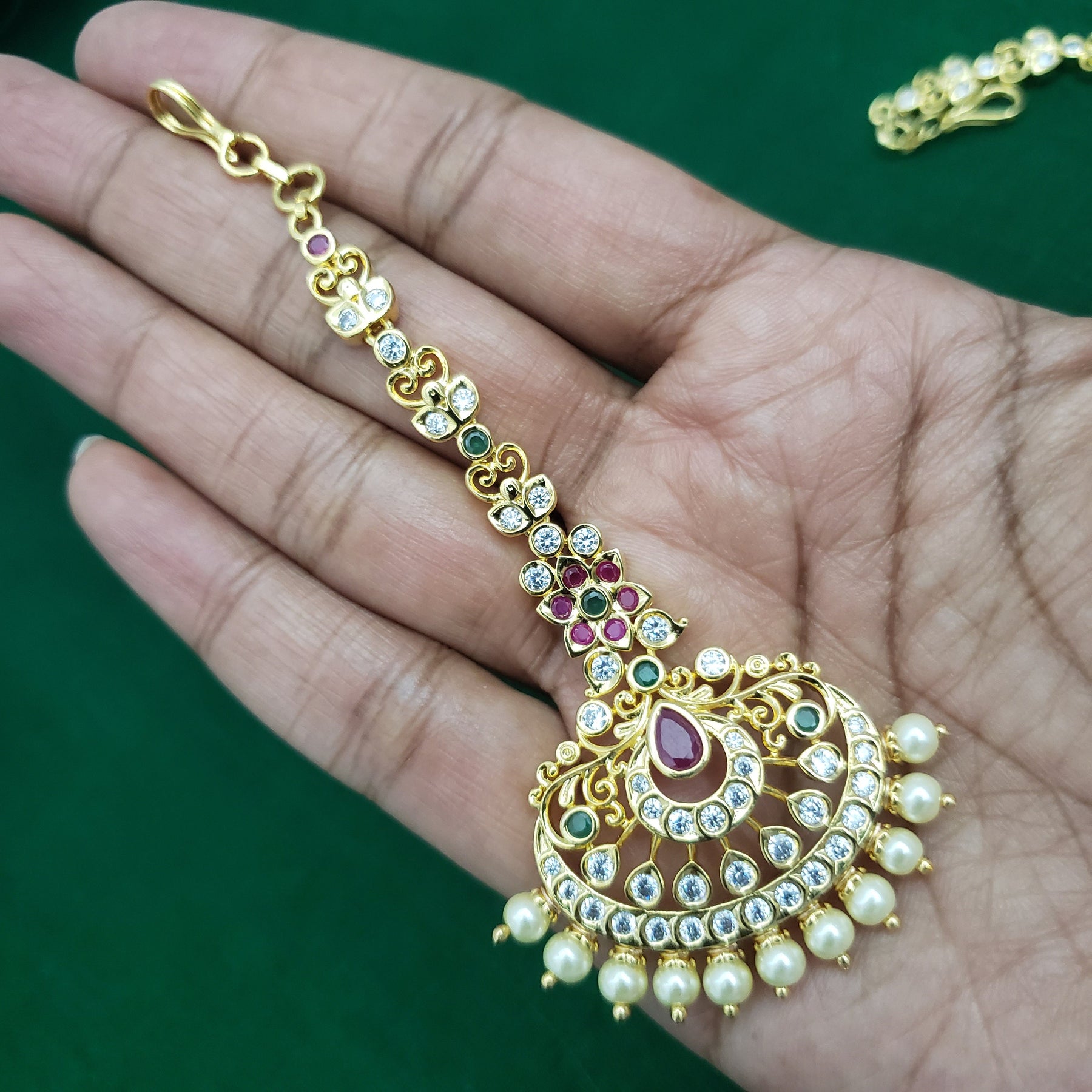 When you adorn mang tikka on your forehead, it will bring out the real beauty of an Indian lady. The Mang Tikka has semiprecious Emerald, Ruby, embedded in them. This intricately designed " tikka" would surely glamorize any occasion.