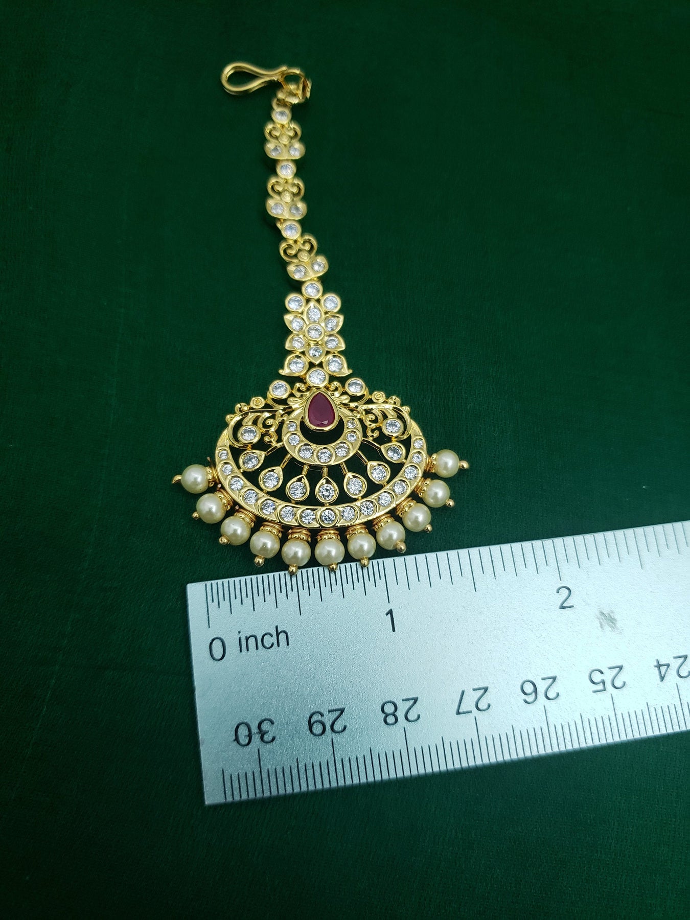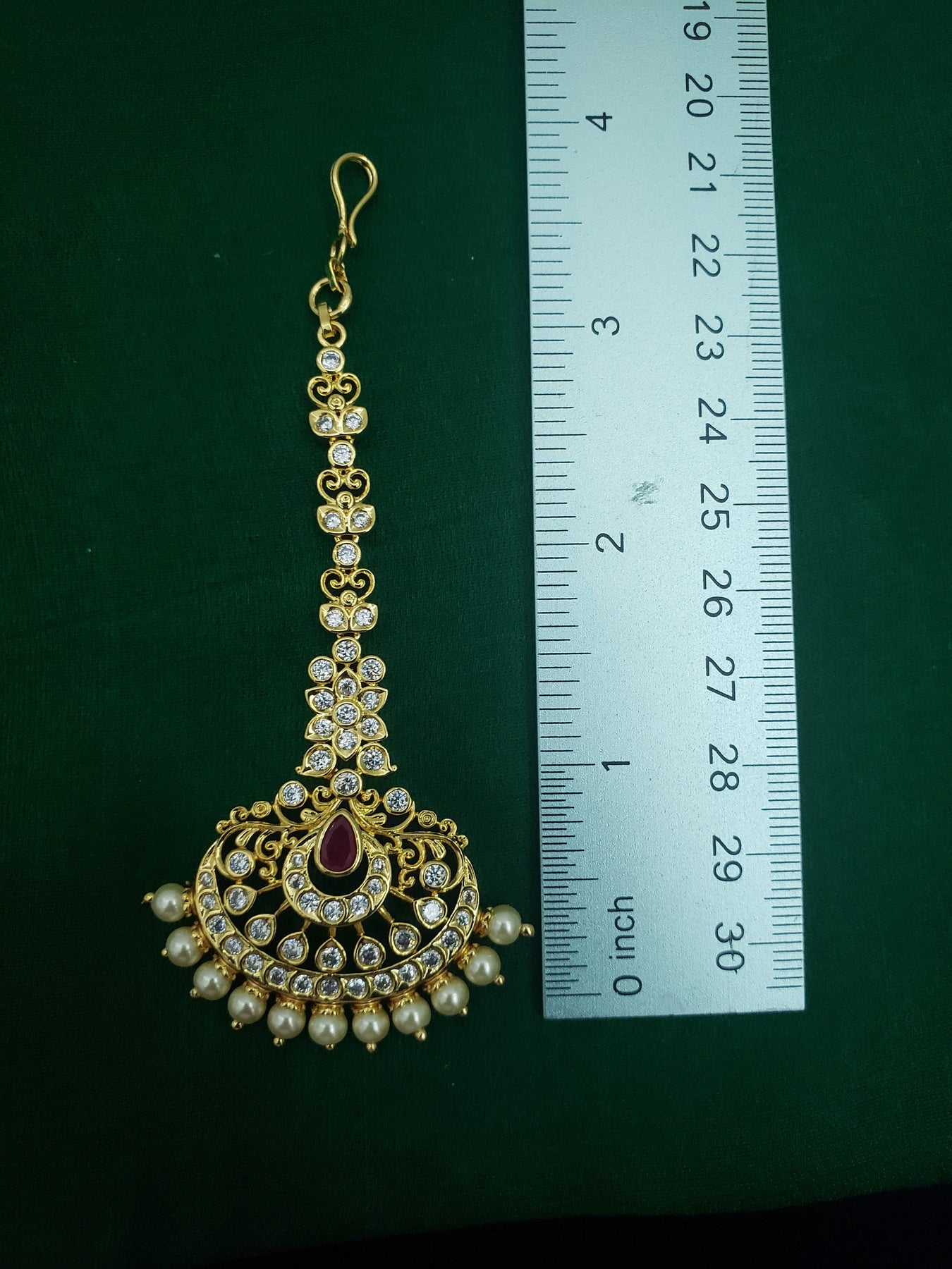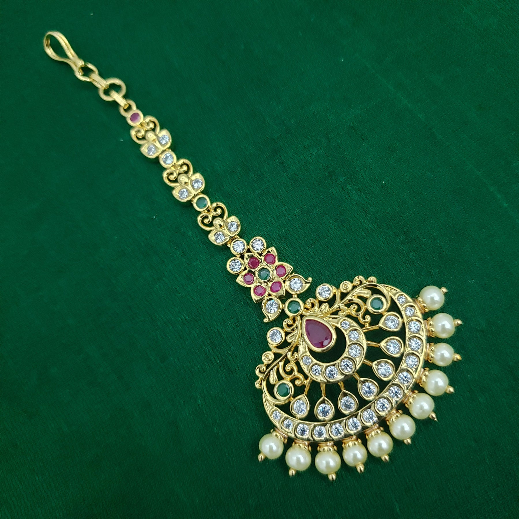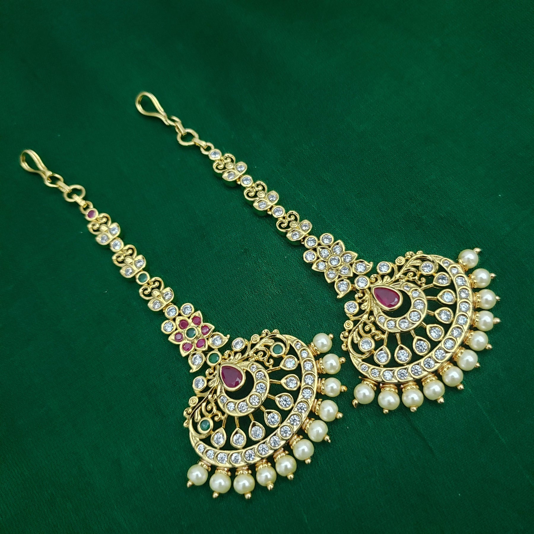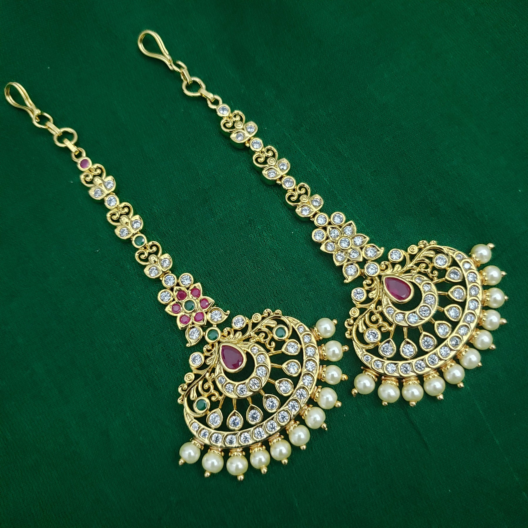 When you adorn mang tikka on your forehead, it will bring out the real beauty of an Indian lady. The Mang Tikka has semiprecious Emerald, Ruby, embedded in them. This intricately designed " tikka" would surely glamorize any occasion.