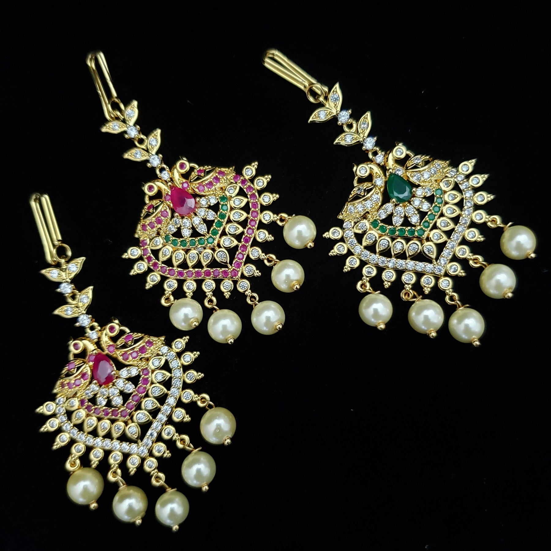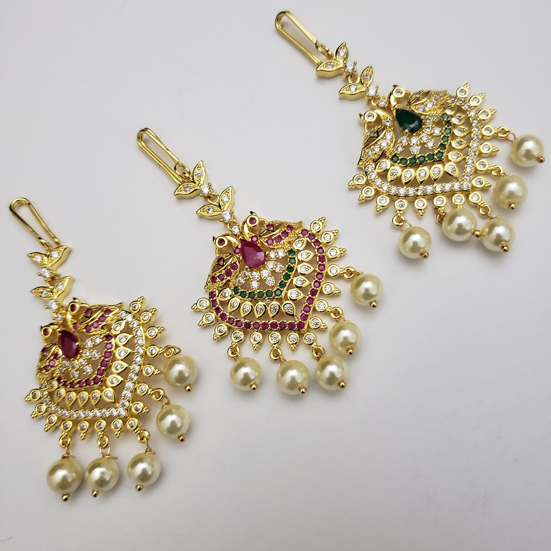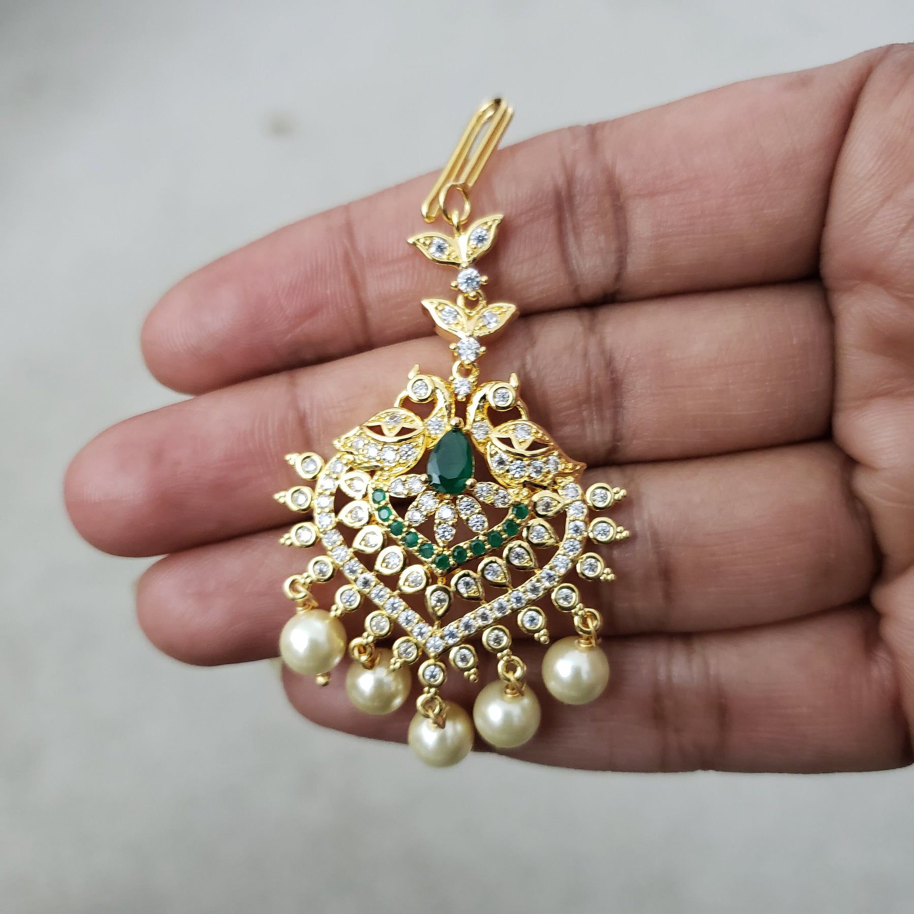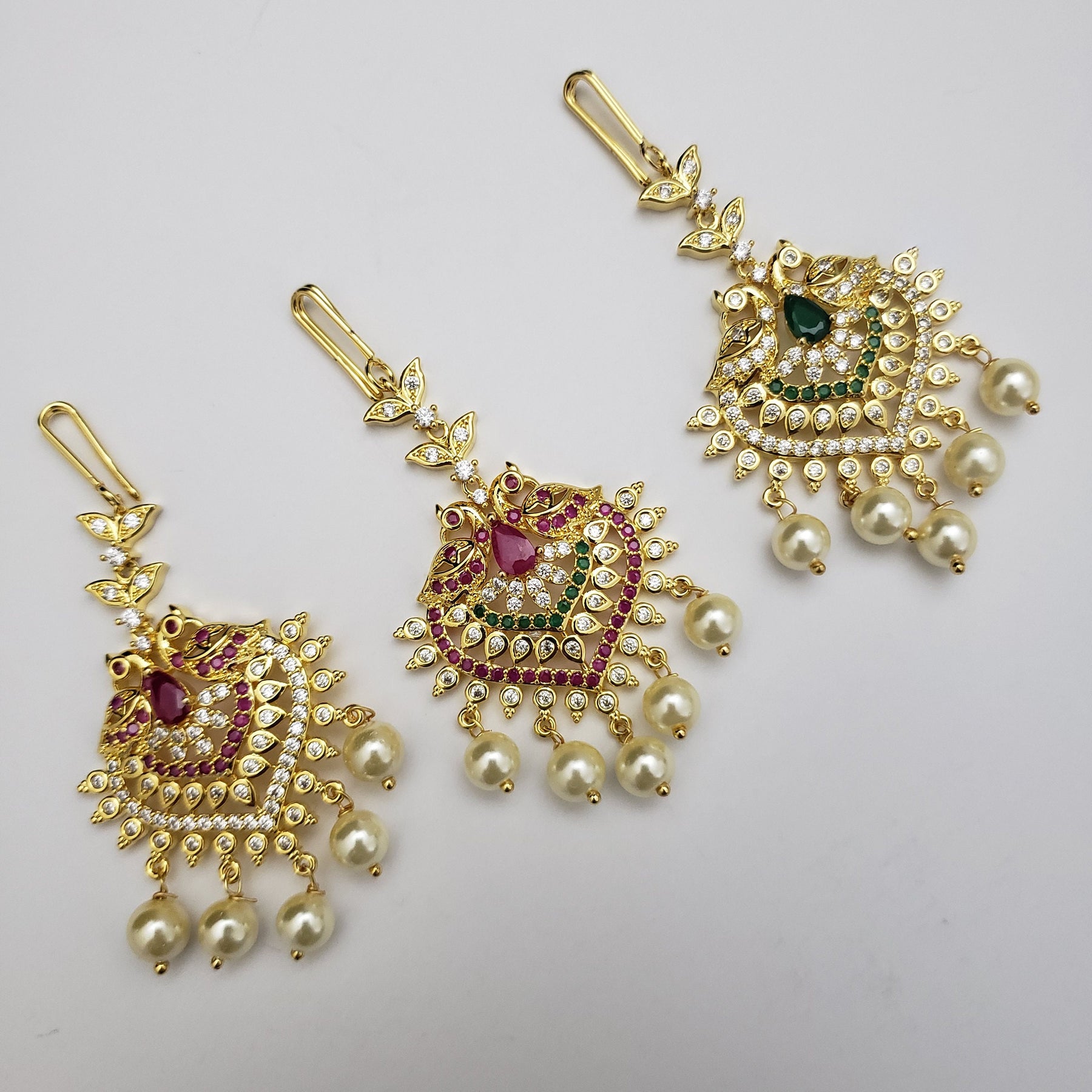 When you adorn mang tikka on your forehead, it will bring out the real beauty of an Indian lady. The Mang Tikka has semiprecious Emerald, Ruby, embedded in them. This intricately designed " tikka" would surely glamorize any occasion.