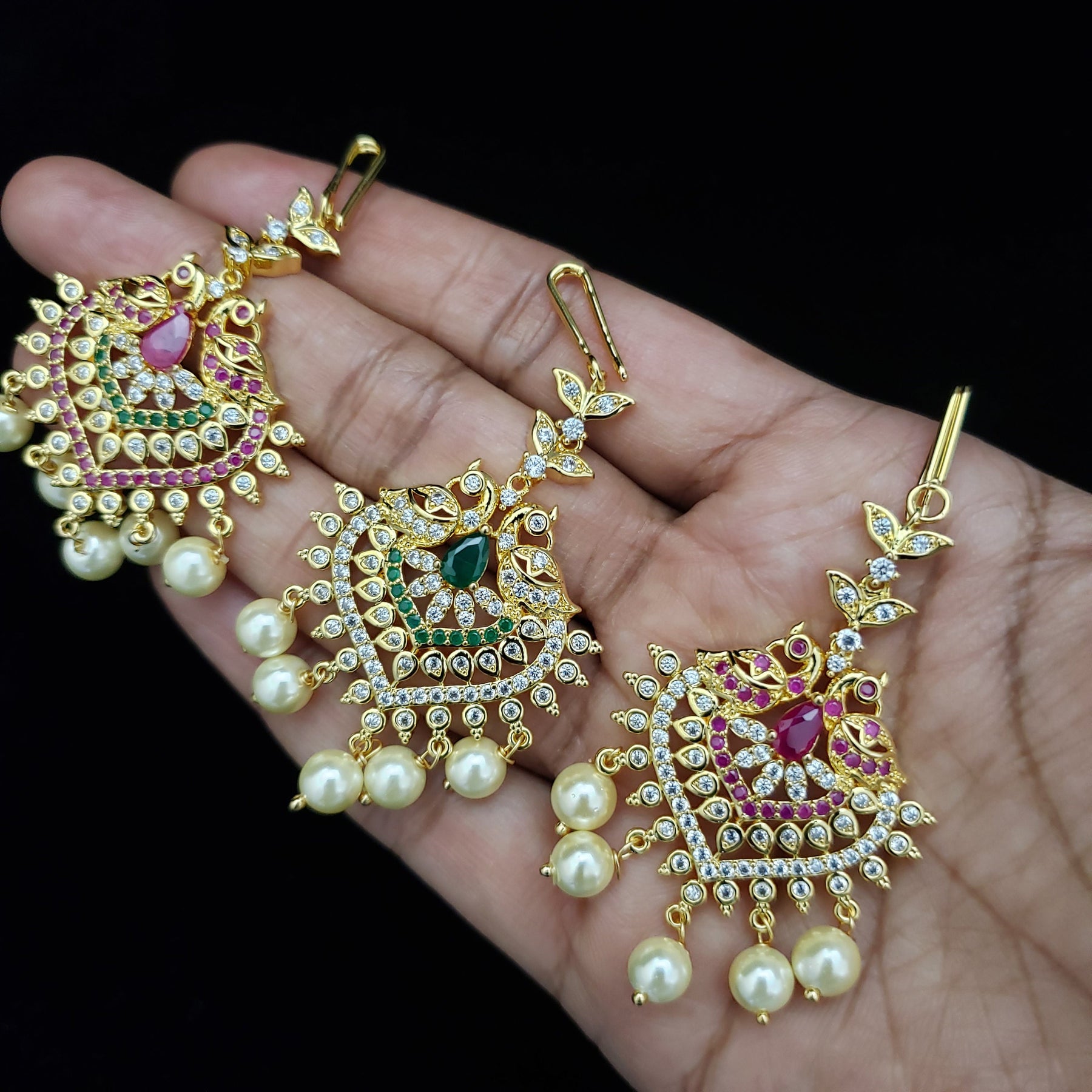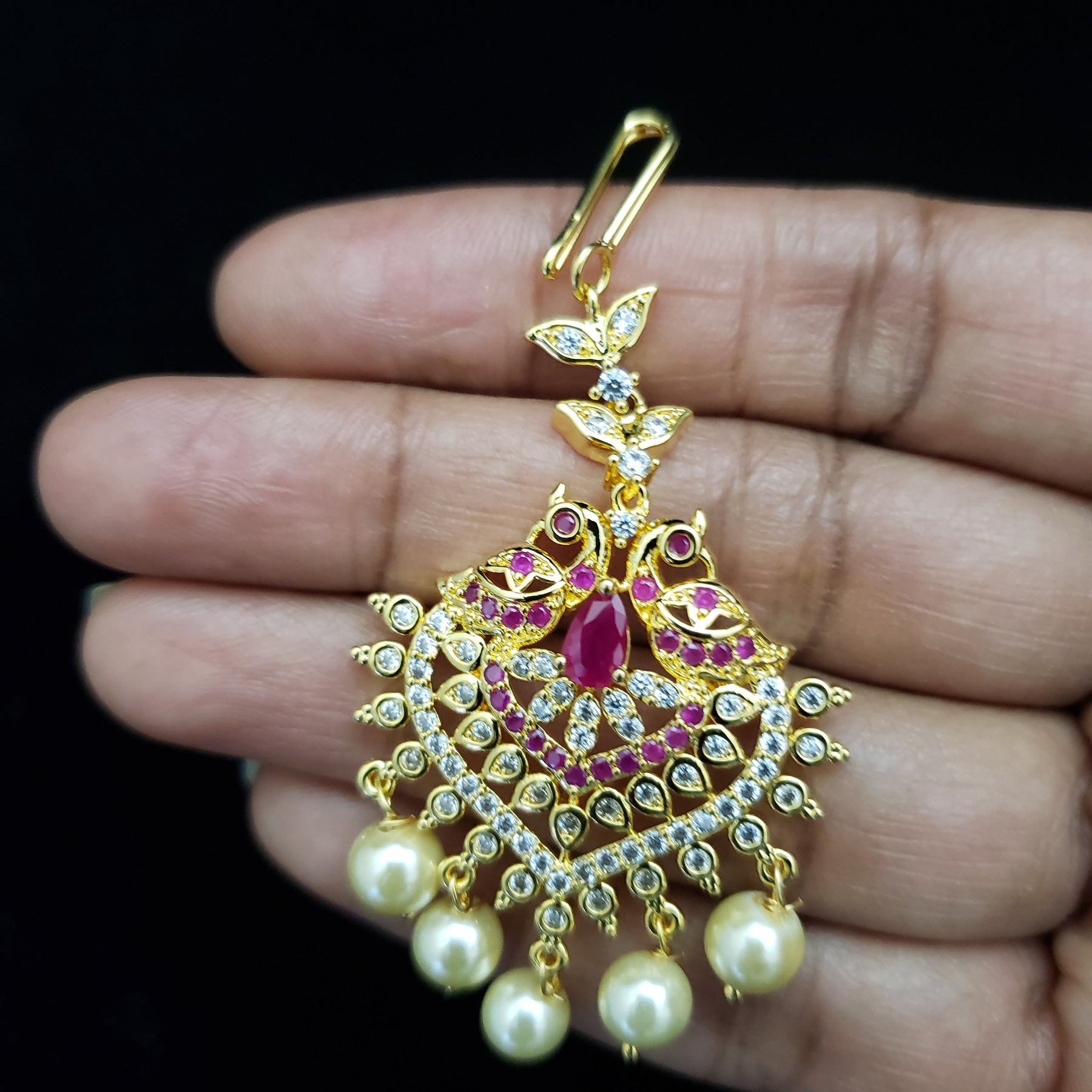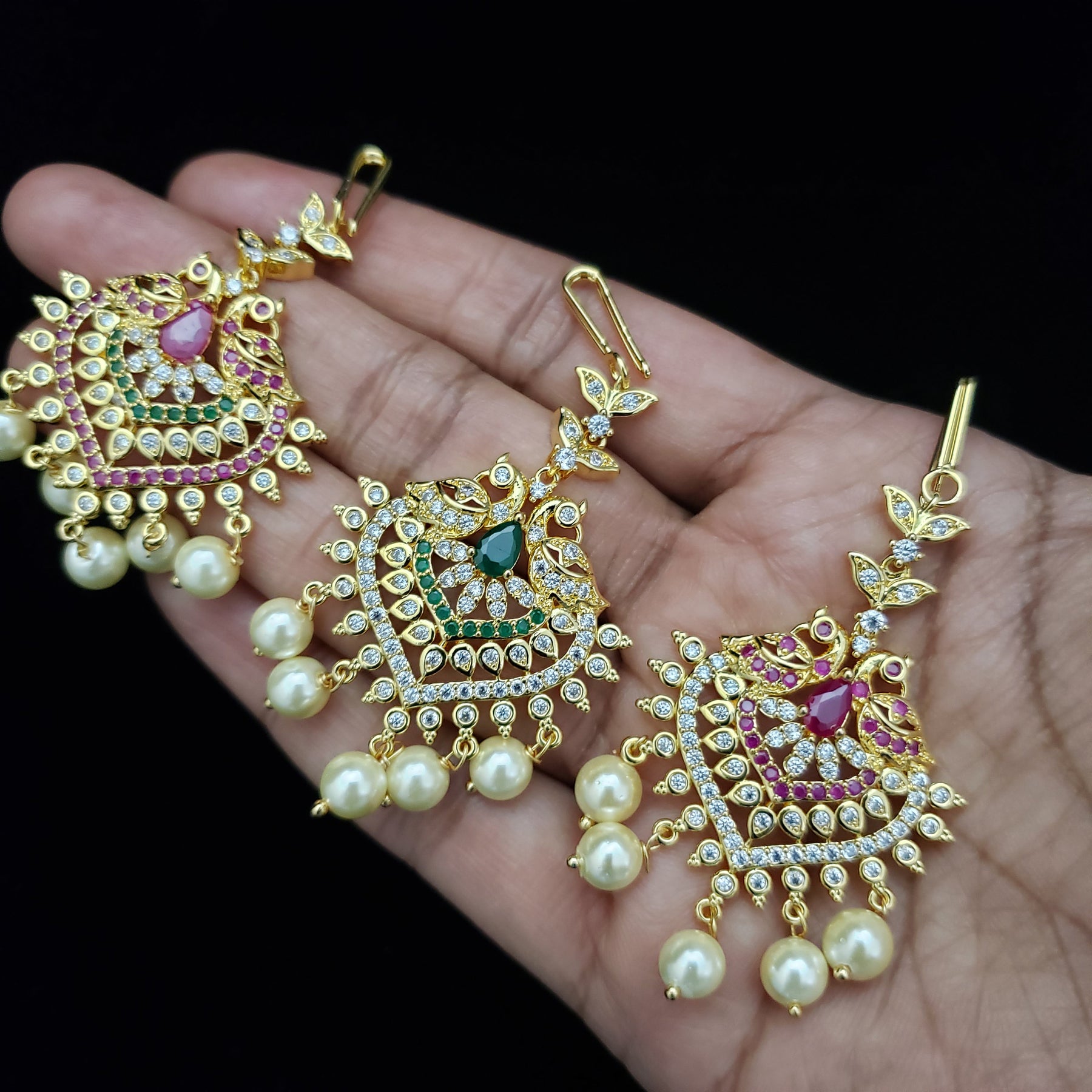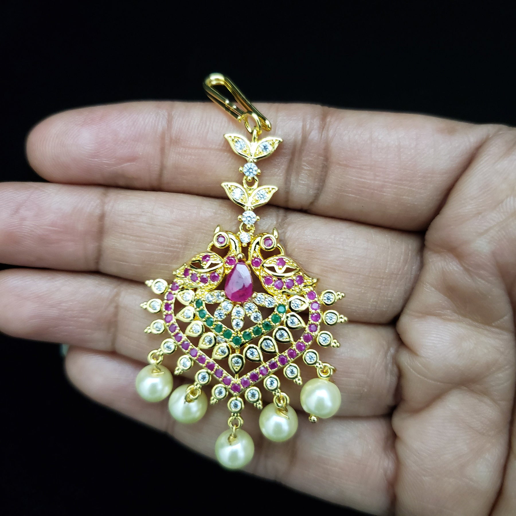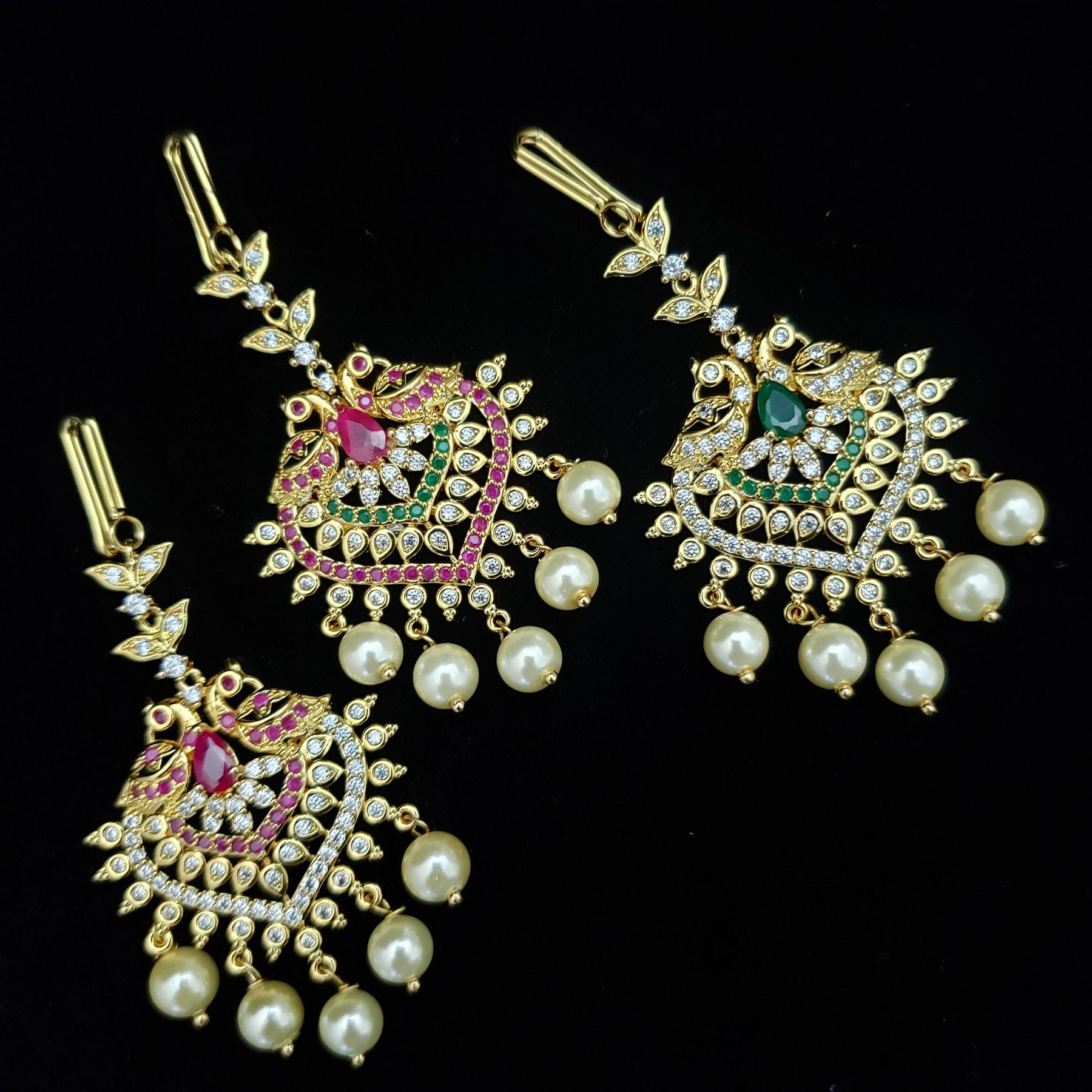 When you adorn mang tikka on your forehead, it will bring out the real beauty of an Indian lady. The Mang Tikka has semiprecious Emerald, Ruby, embedded in them. This intricately designed " tikka" would surely glamorize any occasion.