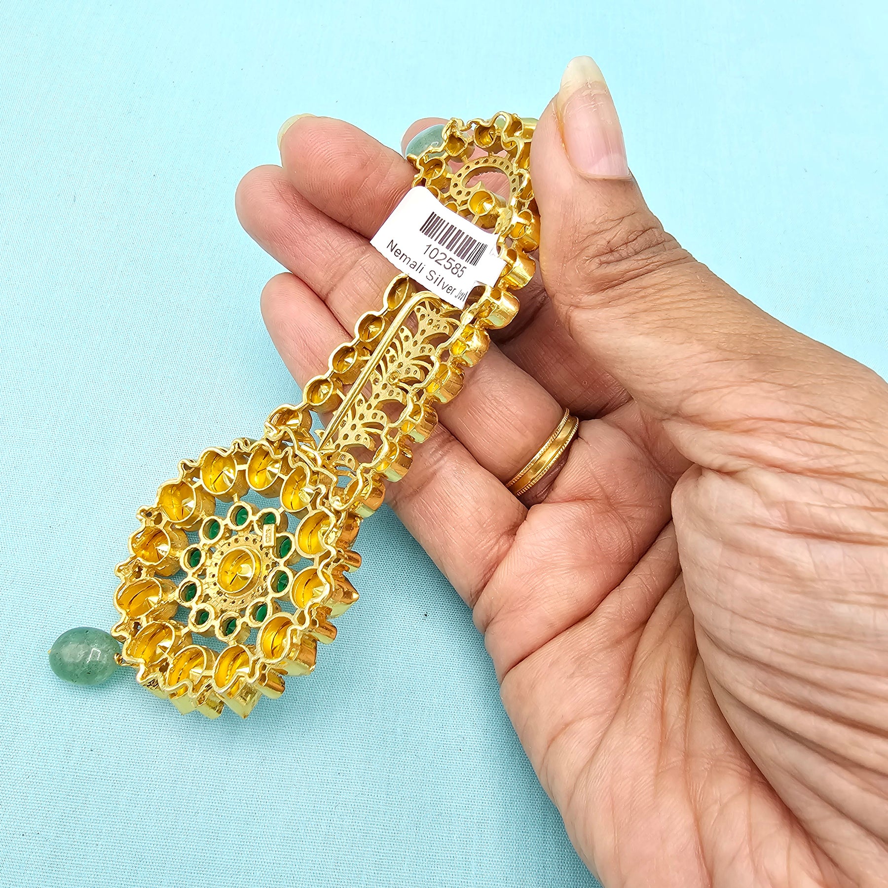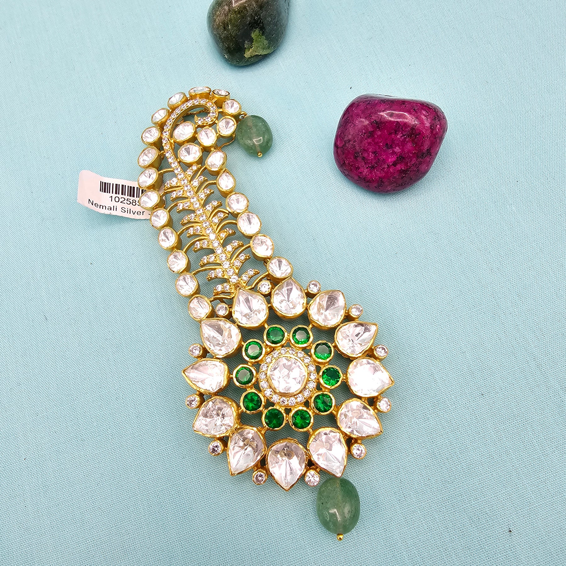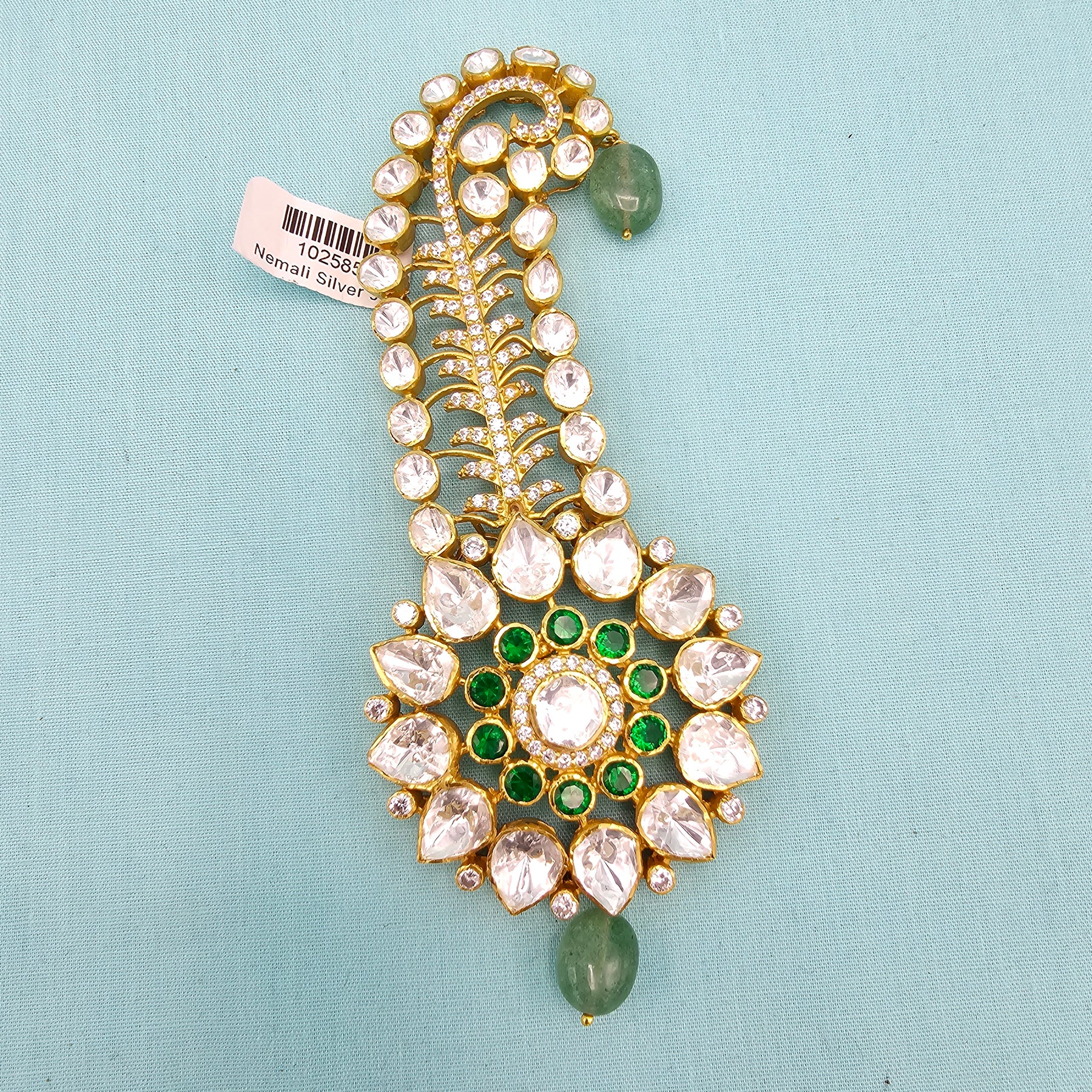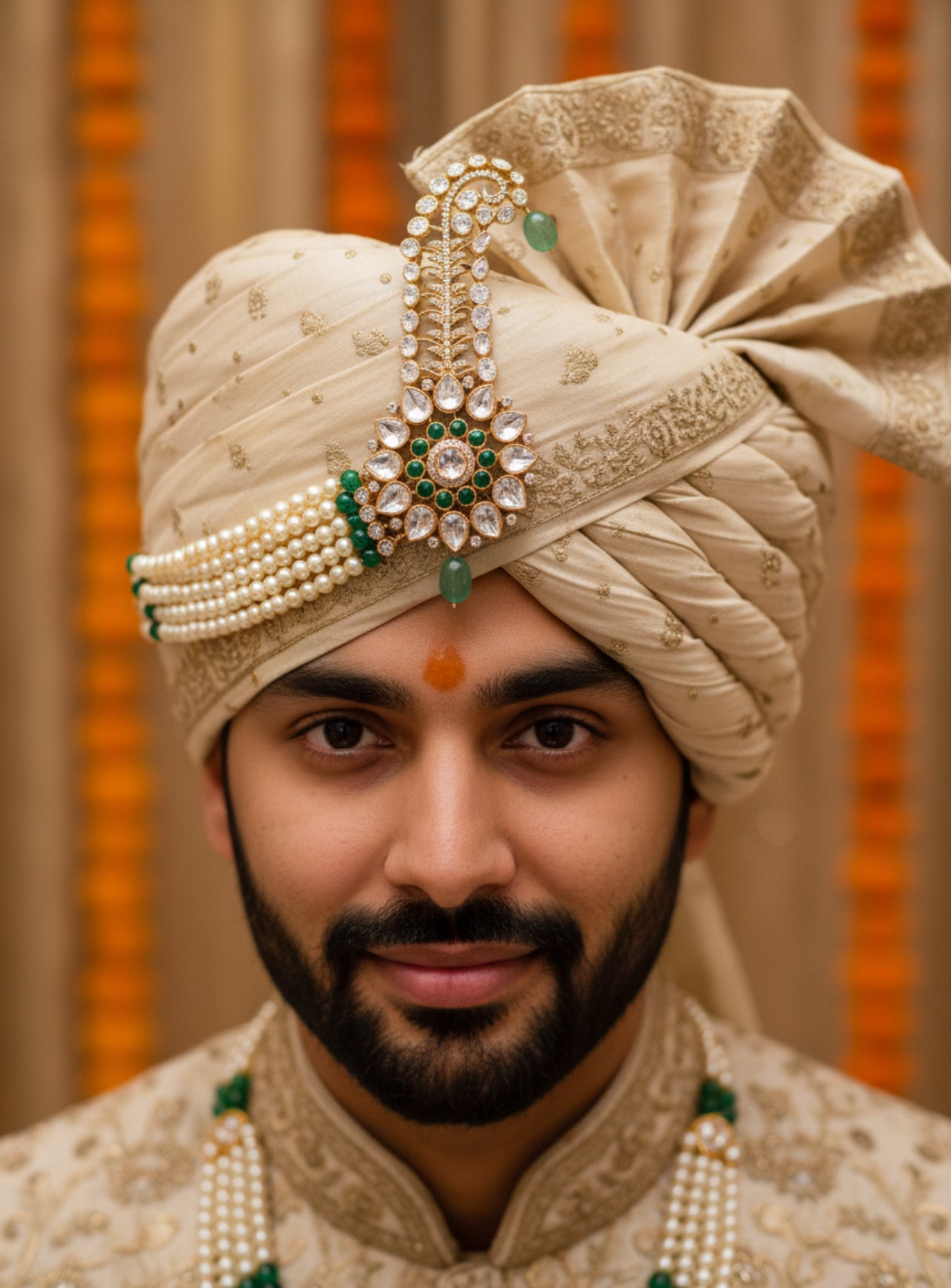 Elevate your wedding or festive look with this handcrafted silver moissanite Pagidi jewelry, designed especially for Indian grooms. This elegant piece adds a royal touch when worn on the Pagidi (turban), creating a majestic and timeless appearance.