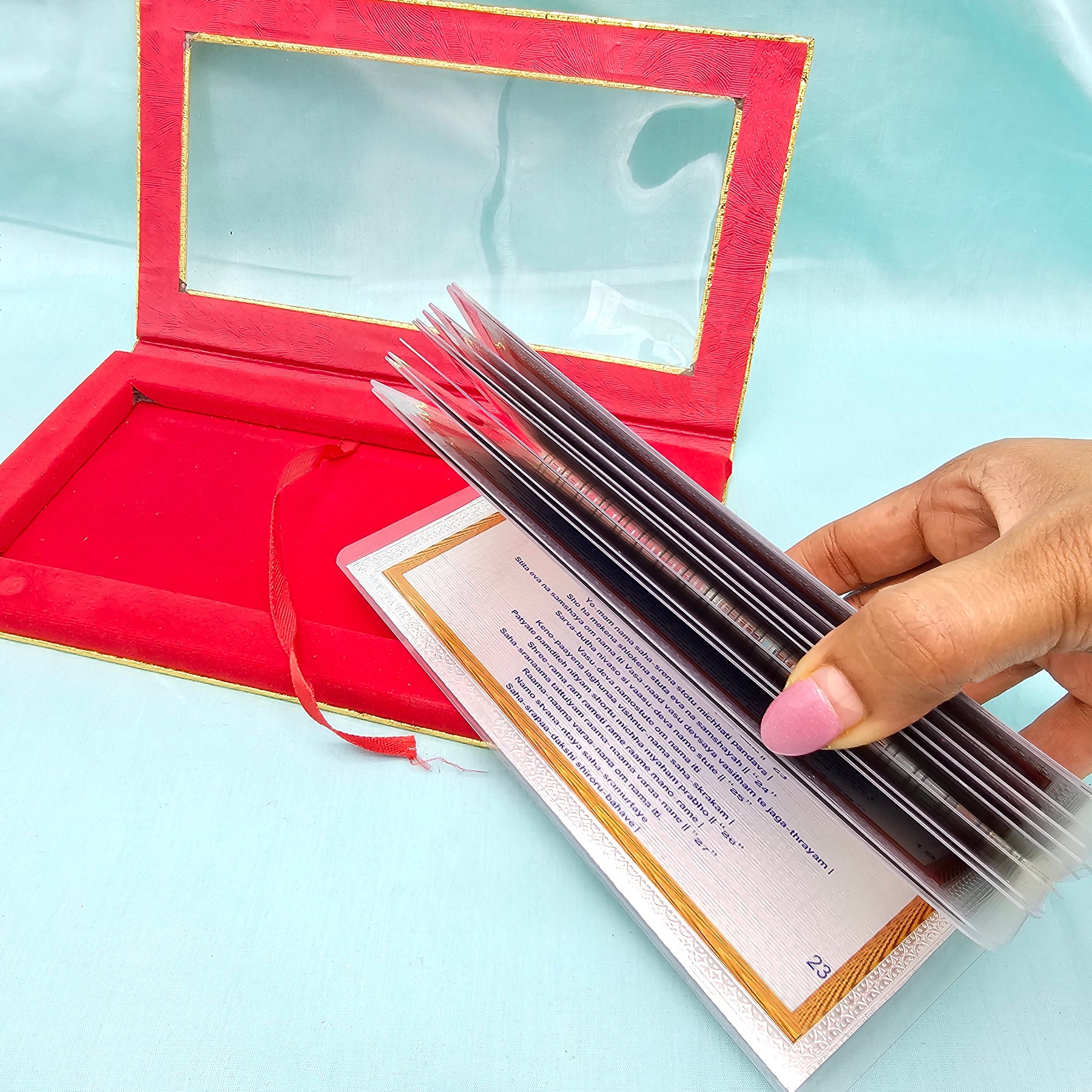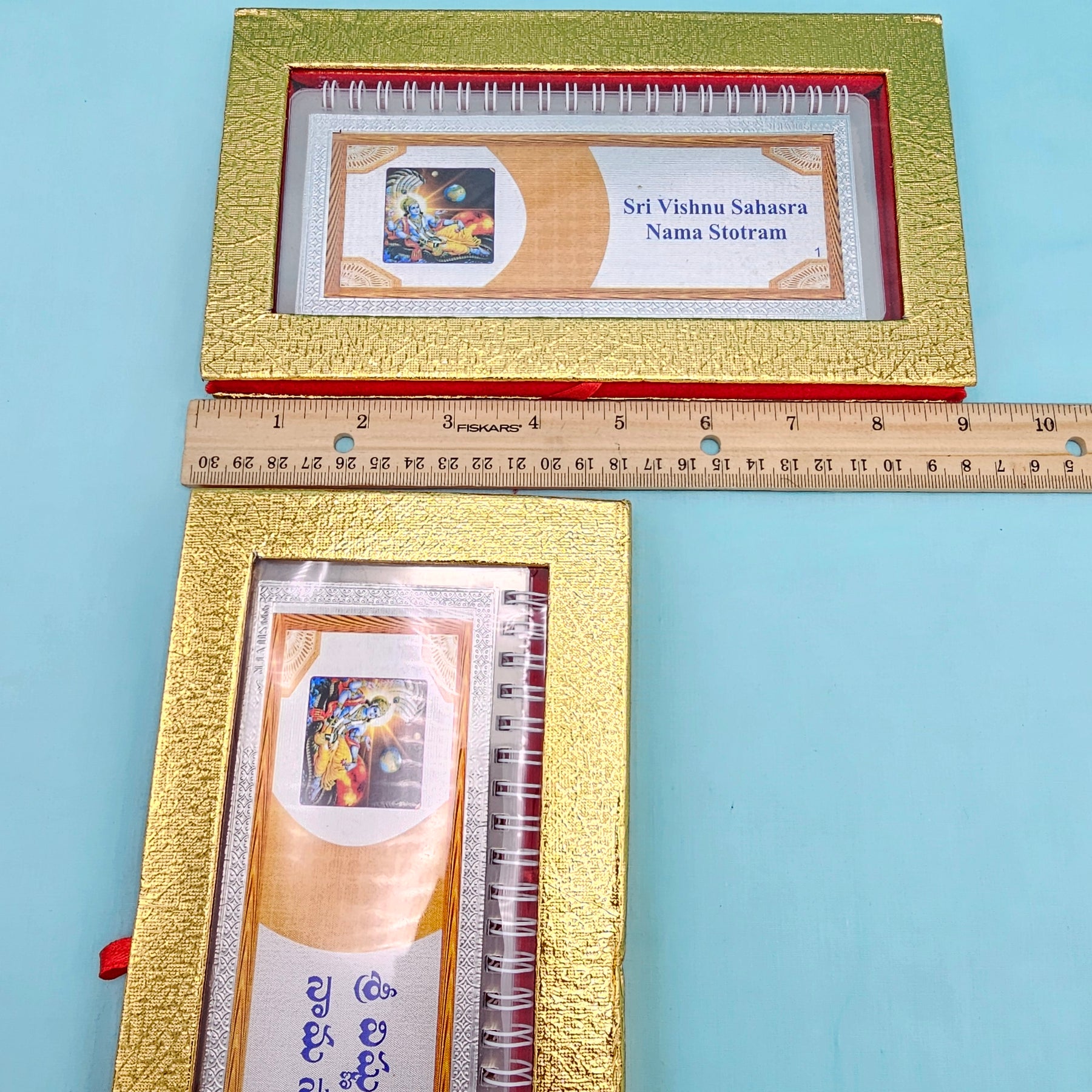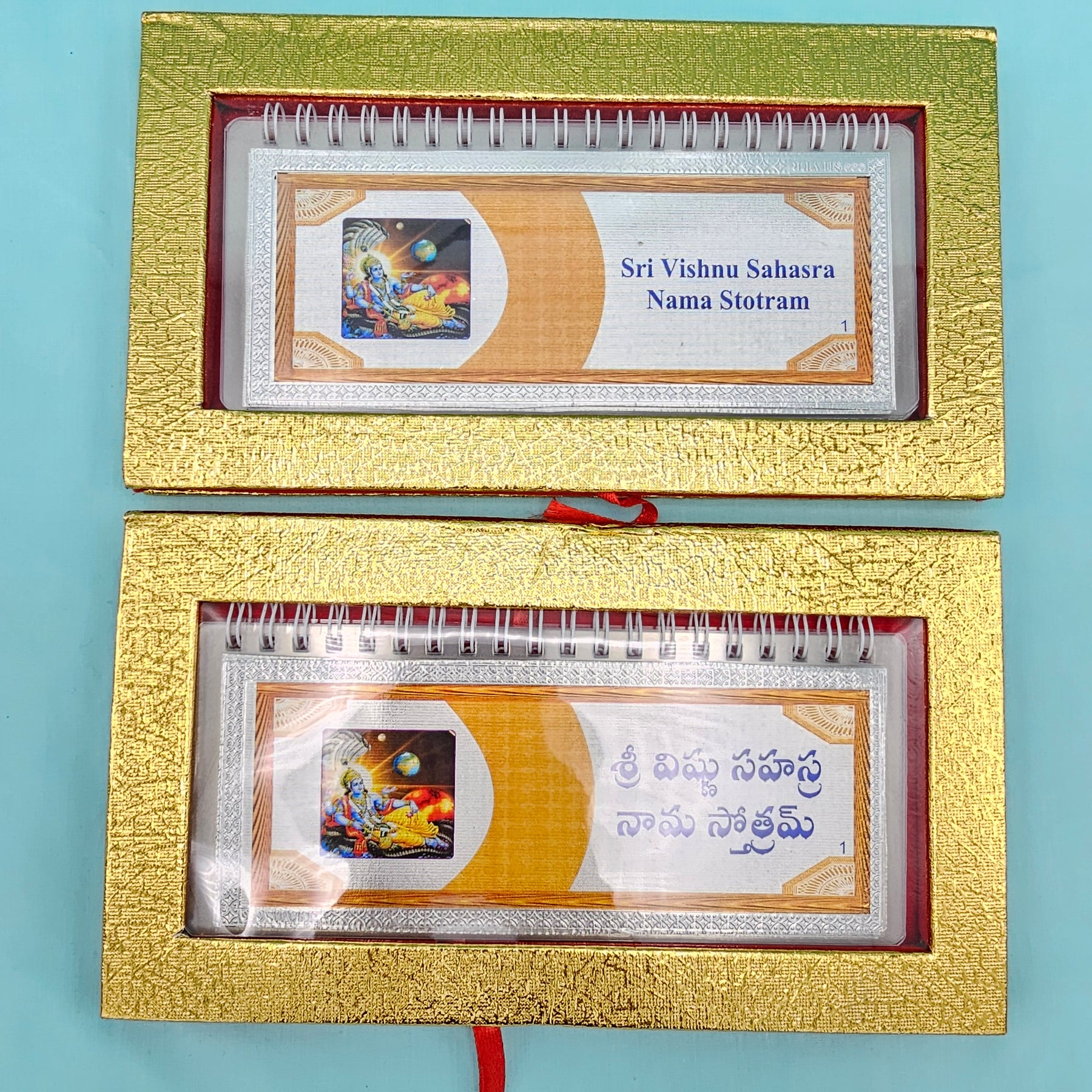 Bring divine blessings into every home with our 99.9 pure silver foil Shri Vishnu Sahasra Nama Statrama book. Each page is beautifully embossed in 99.9 silver foil, making it a cherished spiritual keepsake and an auspicious addition to any Pooja room. It is packed in a well crafted red velvet cover to keep your book safe and cherished for ever.