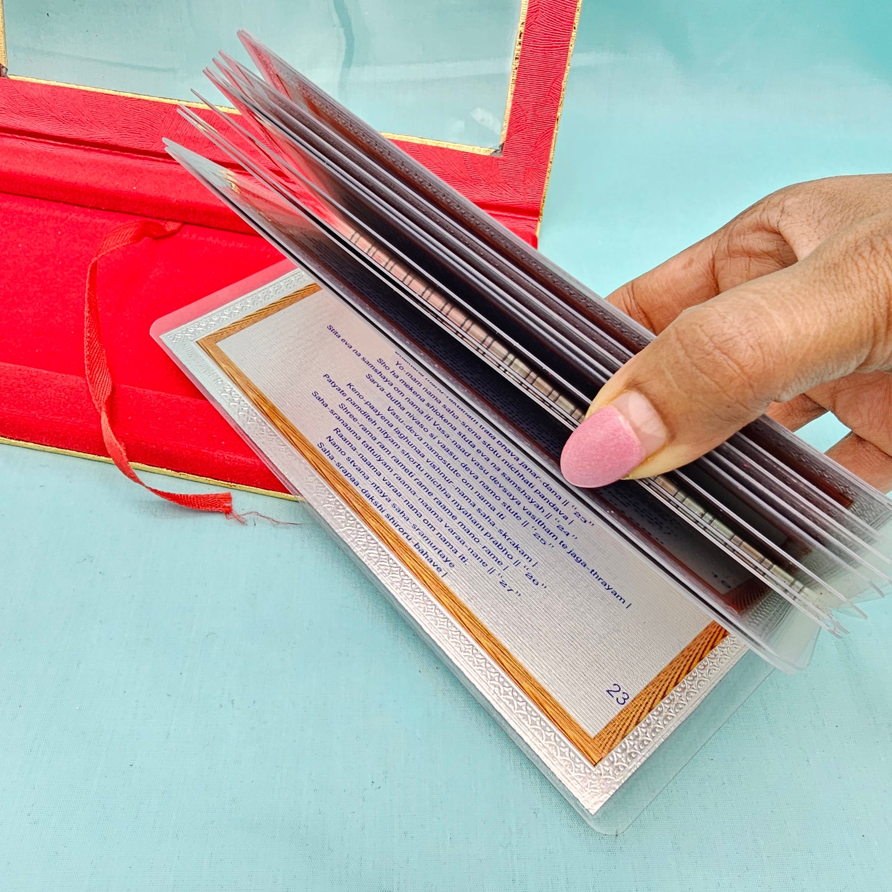 Bring divine blessings into every home with our 99.9 pure silver foil Shri Lakshmi Sahasra Nama Pooja book. Each page is beautifully embossed in 99.9 silver foil, making it a cherished spiritual keepsake and an auspicious addition to any Pooja room. It is packed in a well crafted red velvet cover to keep your book safe and cherished for ever.