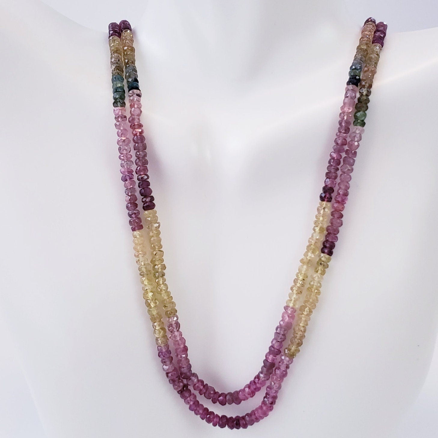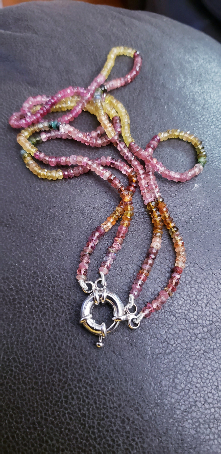 Tourmalines are given a center stage to turn on their full-color show. From dark greens to yellows and pinks, tourmaline has it all. The 2 strands multicolor necklace is eager to transmit to you this gemstones' qualities: tourmaline attracts inspiration, compassion, tolerance and prosperity.