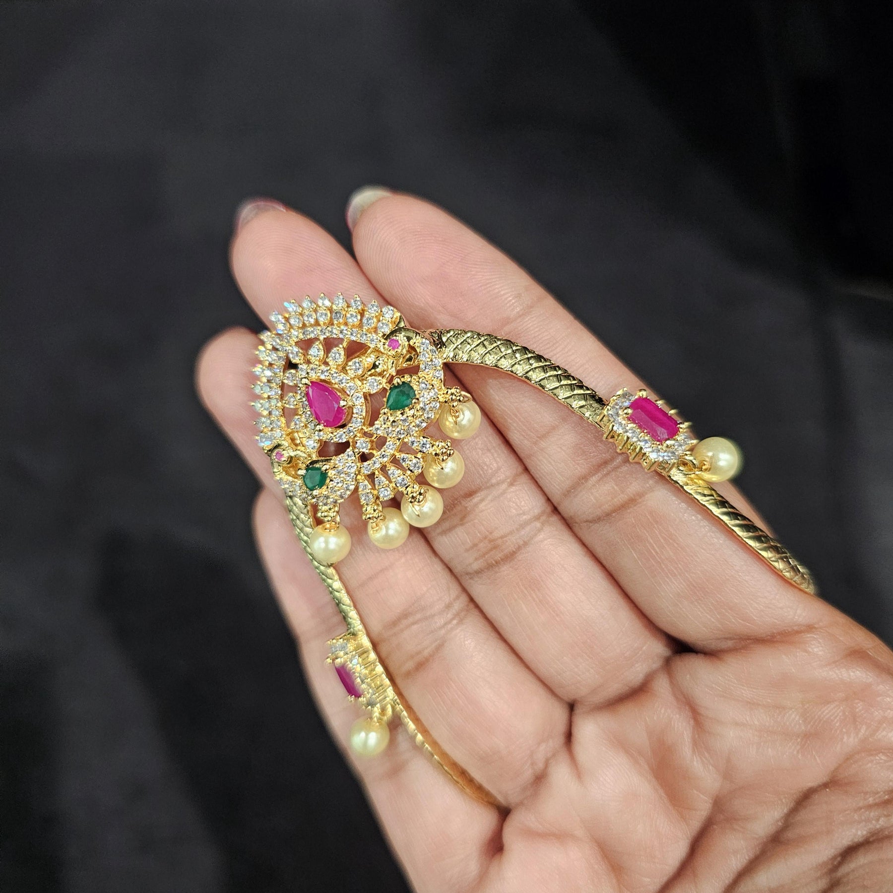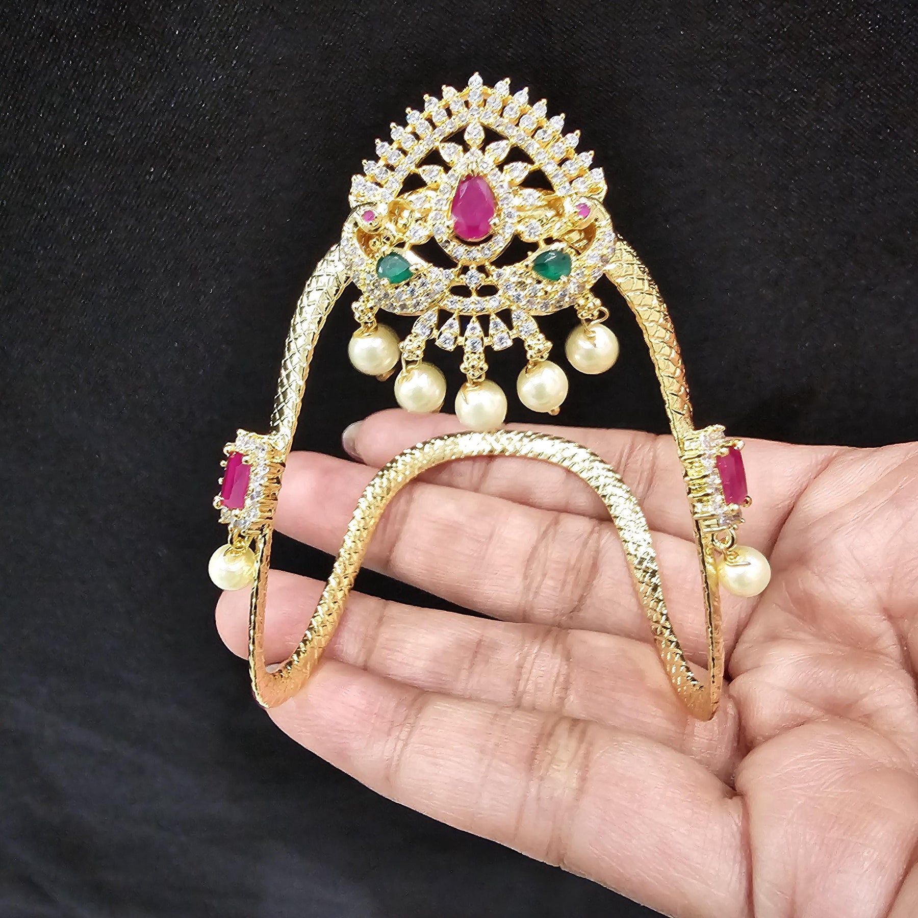 Exclusive gold design with fine finish stonework armlet. It's adjustable by stretching it a little to fit it between your arm and elbow.