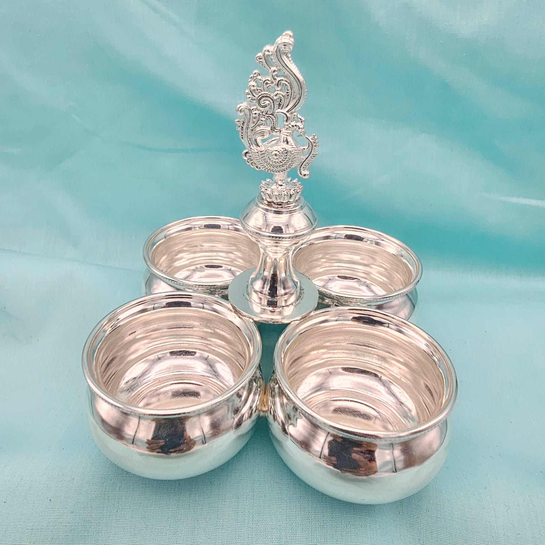 92.5 Pure Silver haldi/ turmeric/ kumkum holder aesthetically crafted by our artisans. This gorgeous 3 cup kumkum box makes this an ideal gift or for decorating your pooja room.This kumkum box comes with a free shipping offer.