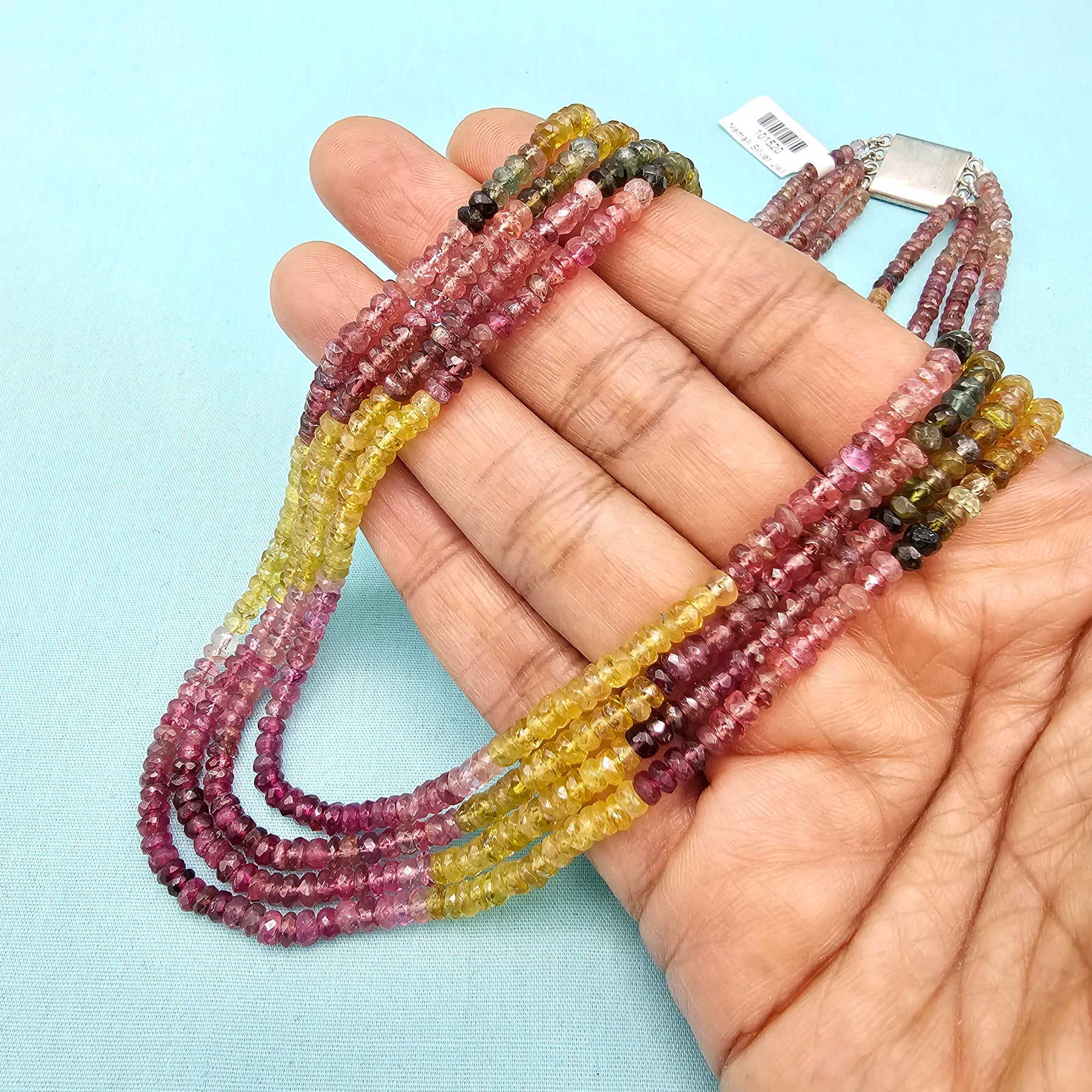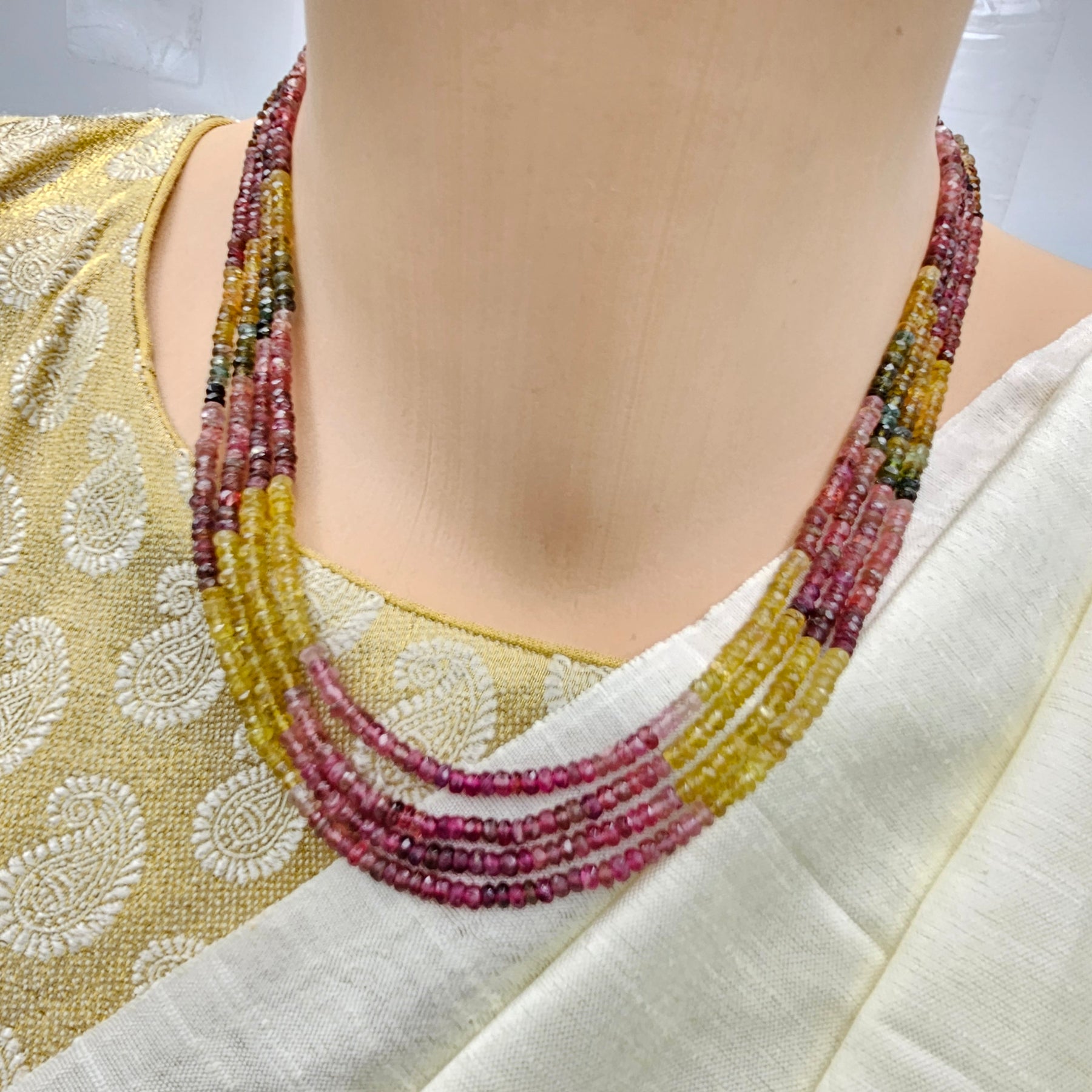 Tourmalines are given a center stage to turn on their full-color show. From dark greens to yellows and pinks, tourmaline has it all. The 4 strands multicolor necklace is eager to transmit to you this gemstones' qualities: tourmaline attracts inspiration, compassion, tolerance, and prosperity.