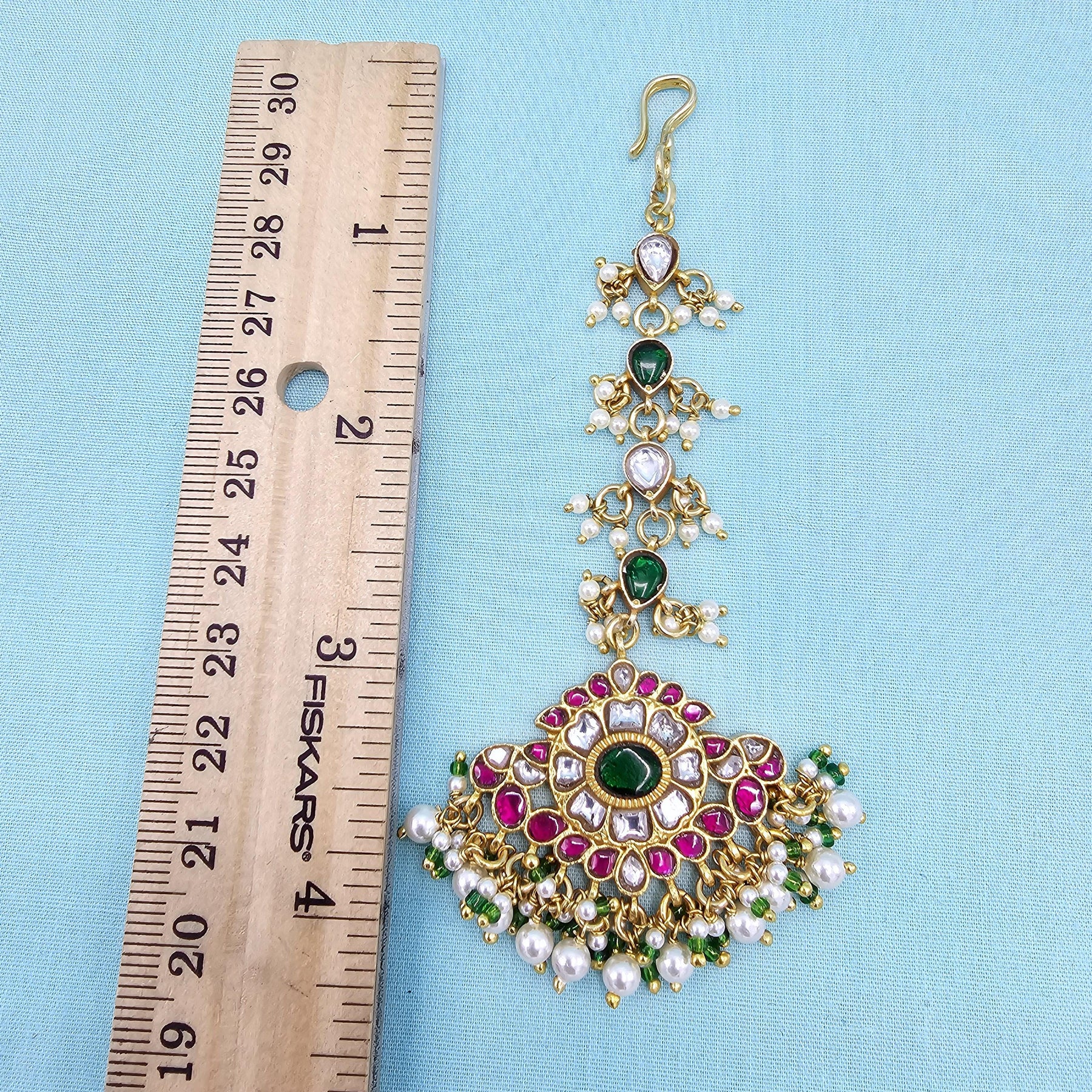 When you adorn maang tikka on your forehead and it will steel the show. This silver Mang Tikka has pink, green and white kundans. This intricately designed " tikka" would surely glamorize any occasion. They give a glamorous outlook to the traditional outfits.