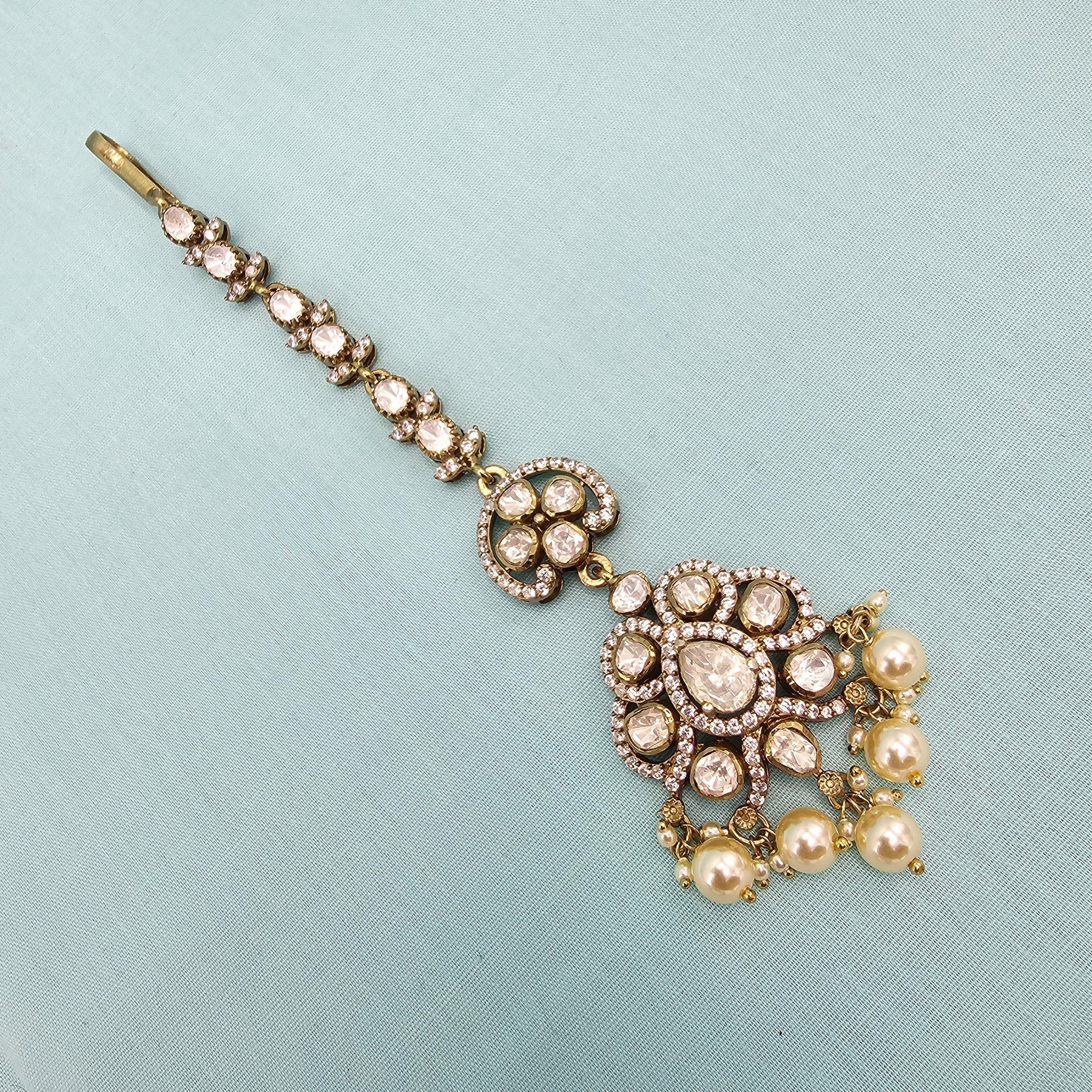 When you adorn maang tikka on your forehead and it will steel the show. This silver Mang Tikka has pink, green and white kundans. This intricately designed " tikka" would surely glamorize any occasion. They give a glamorous outlook to the traditional outfits.