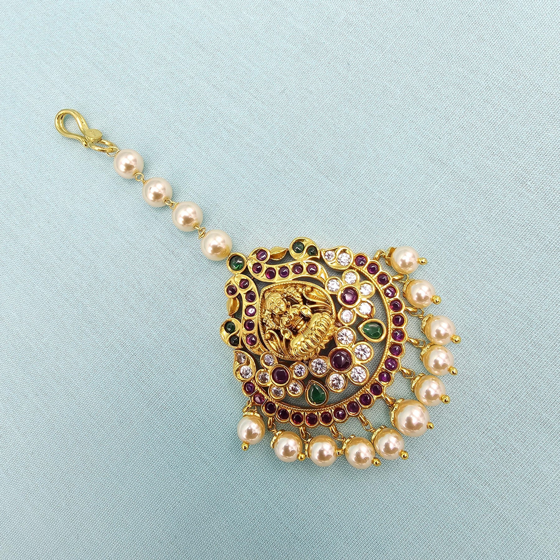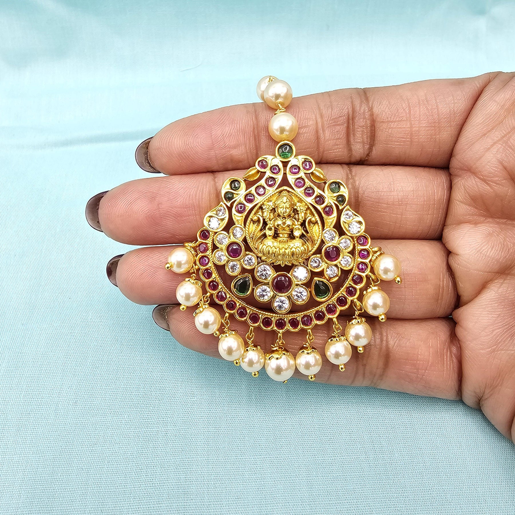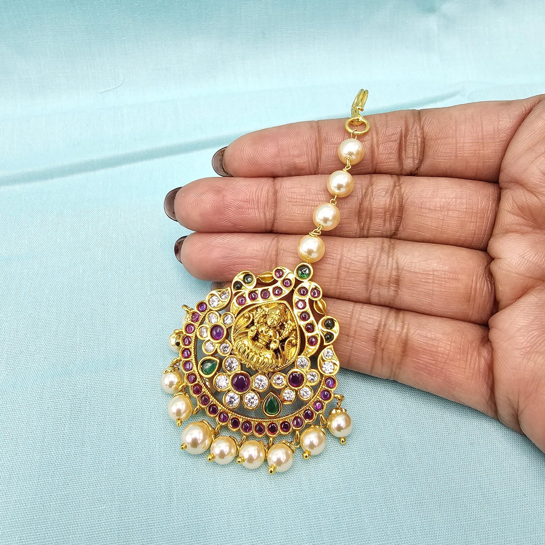 When you adorn maang tikka on your forehead and it will steel the show. This silver Mang Tikka has pink, green and white kundans. This intricately designed " tikka" would surely glamorize any occasion. They give a glamorous outlook to the traditional outfits.