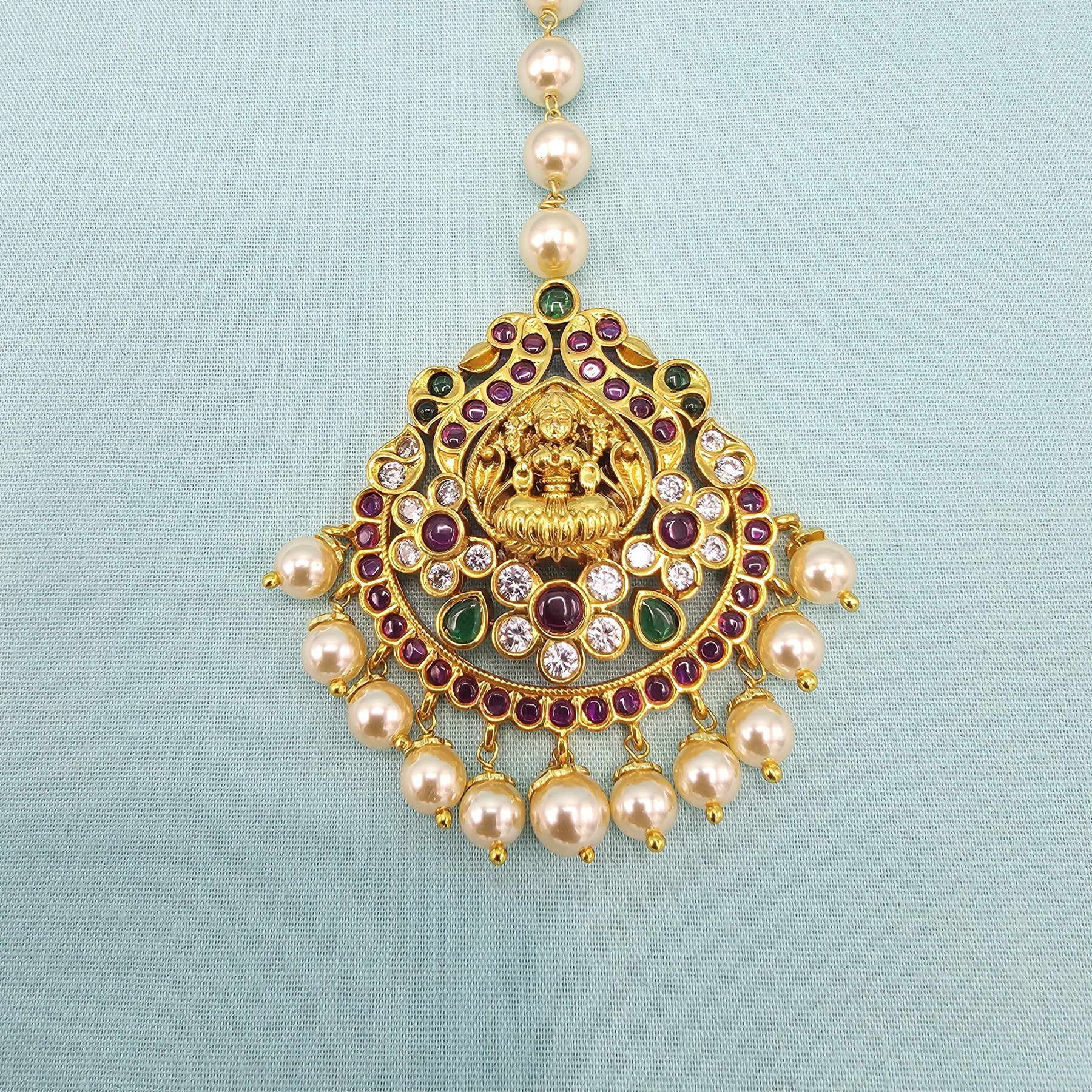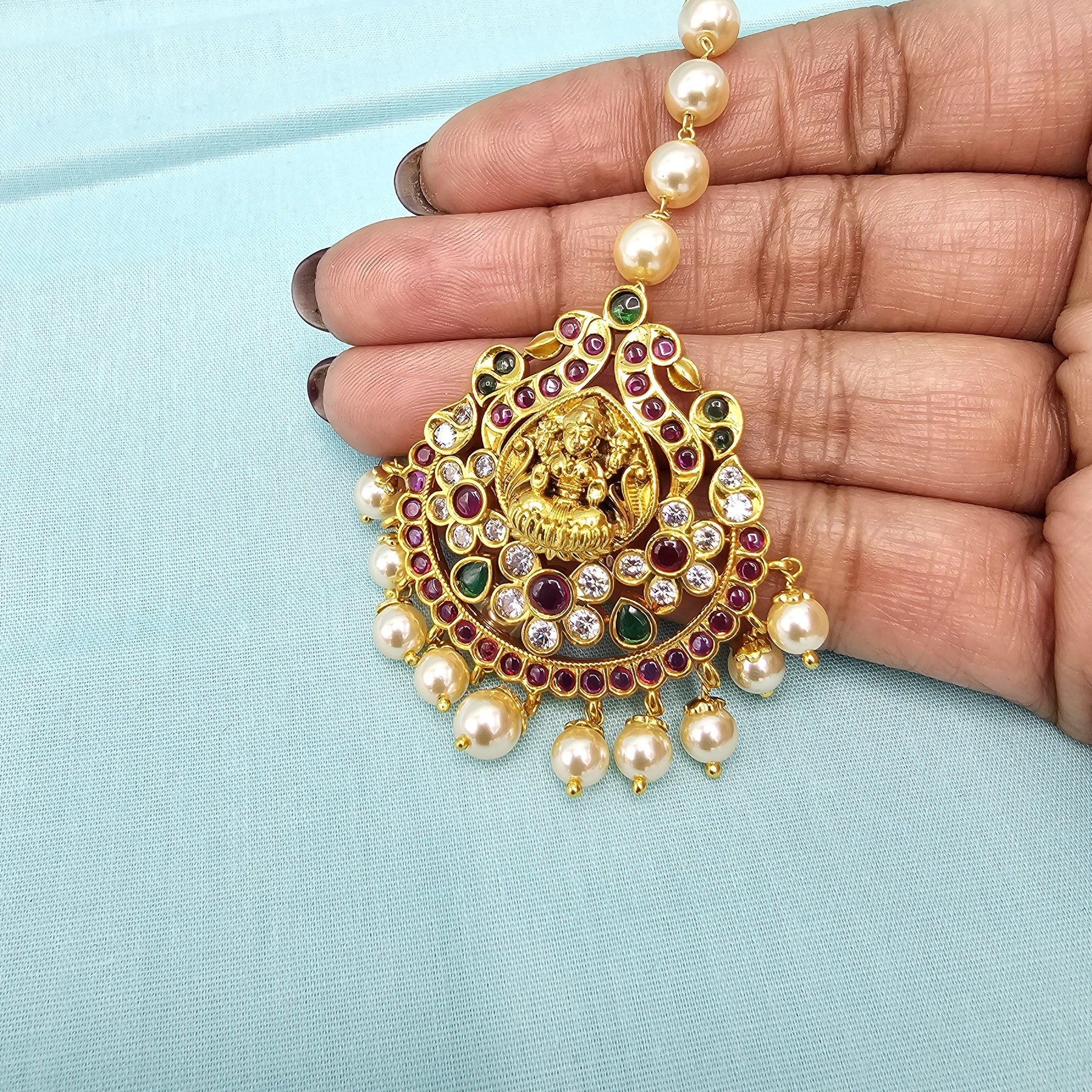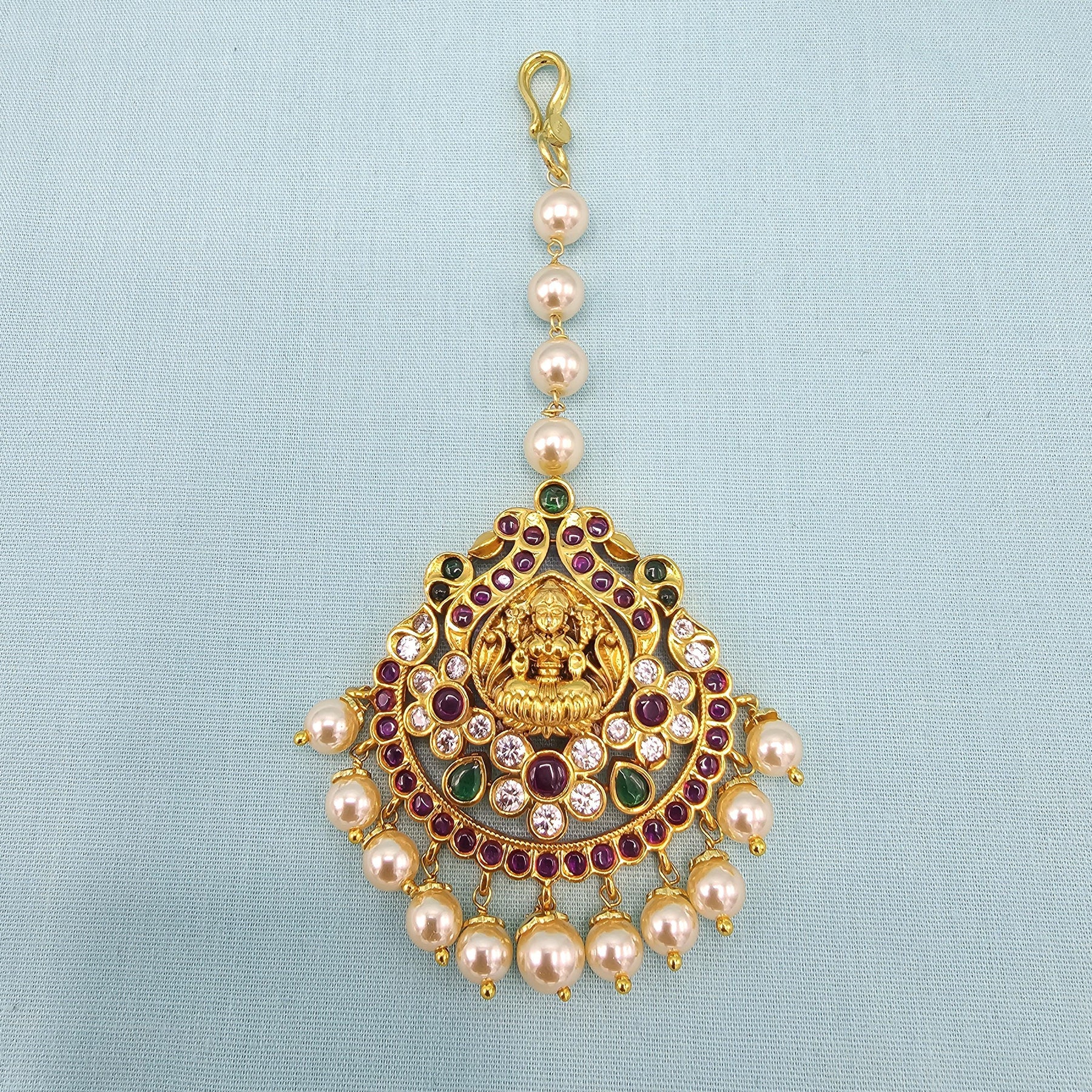 When you adorn maang tikka on your forehead and it will steel the show. This silver Mang Tikka has pink, green and white kundans. This intricately designed " tikka" would surely glamorize any occasion. They give a glamorous outlook to the traditional outfits.