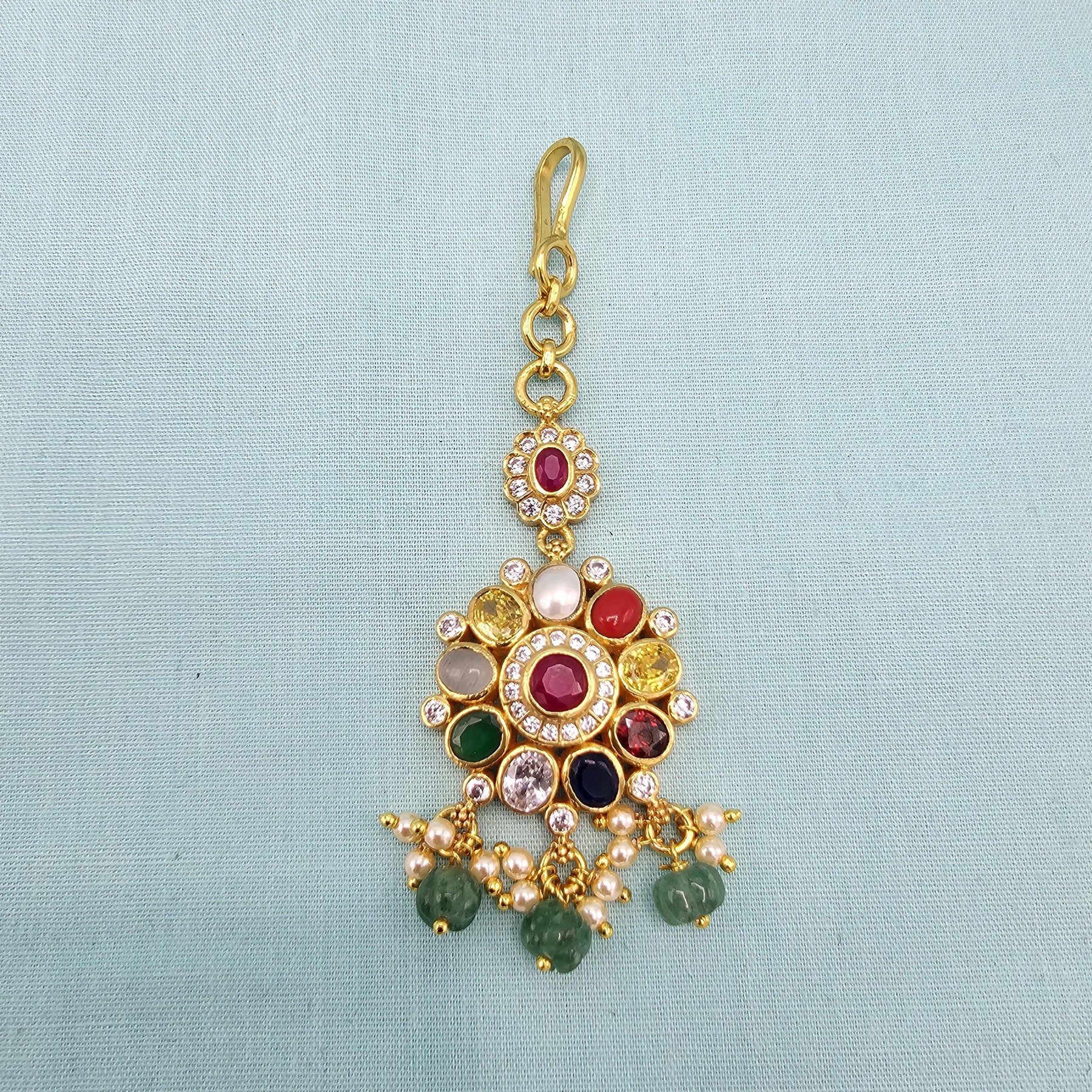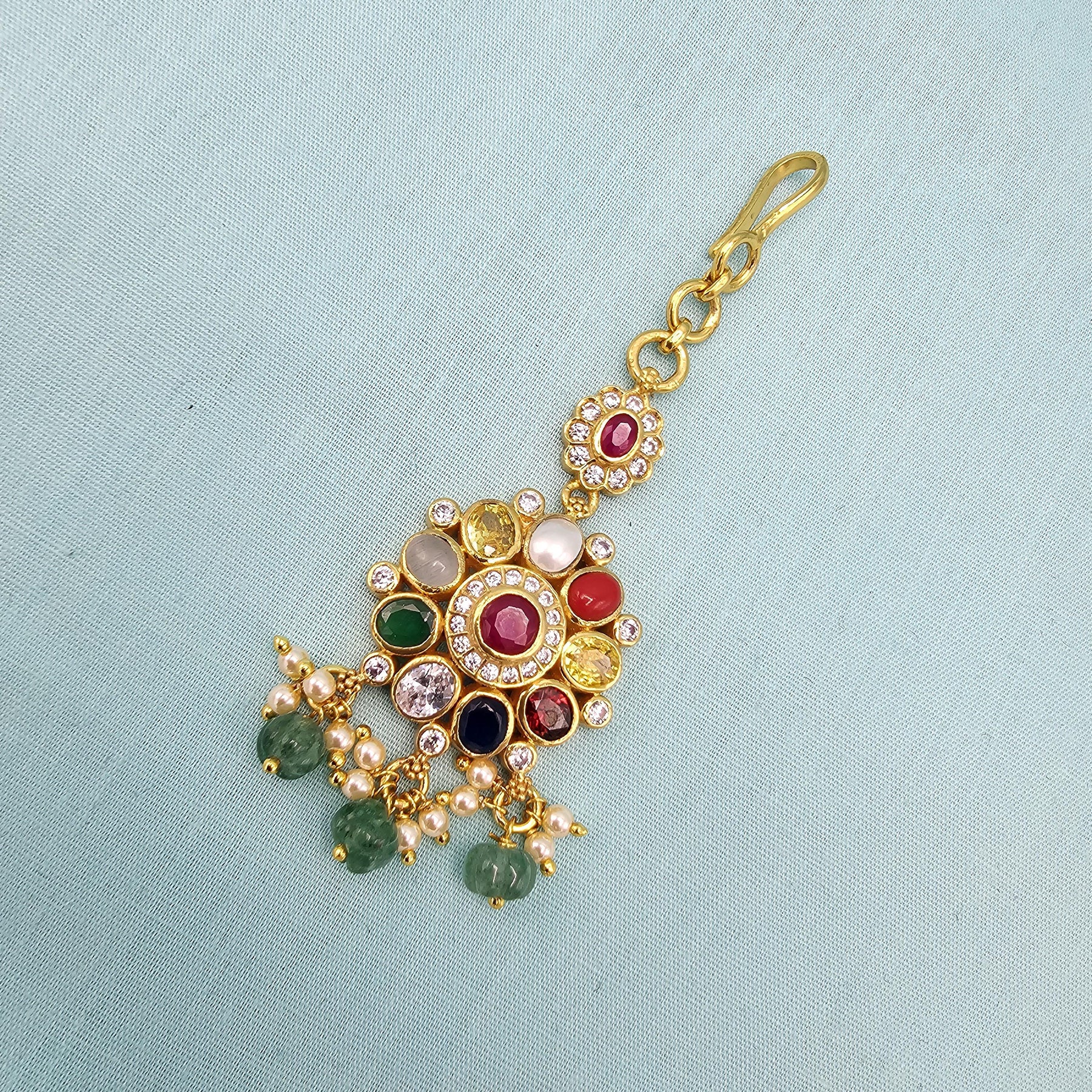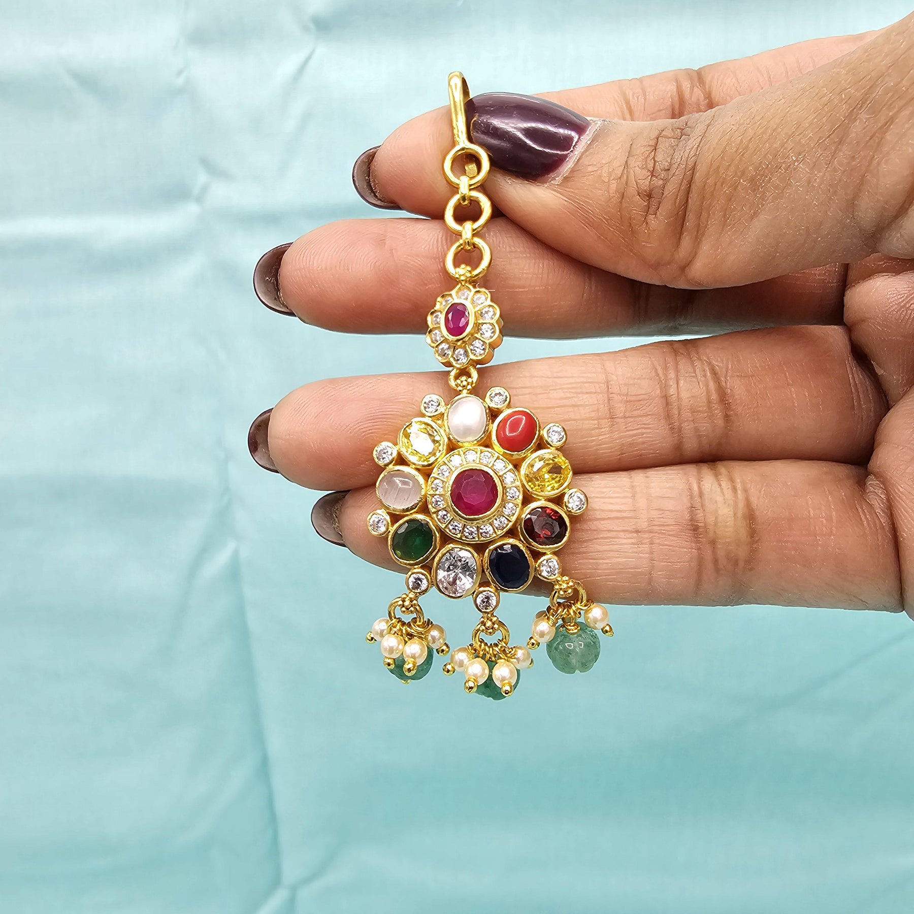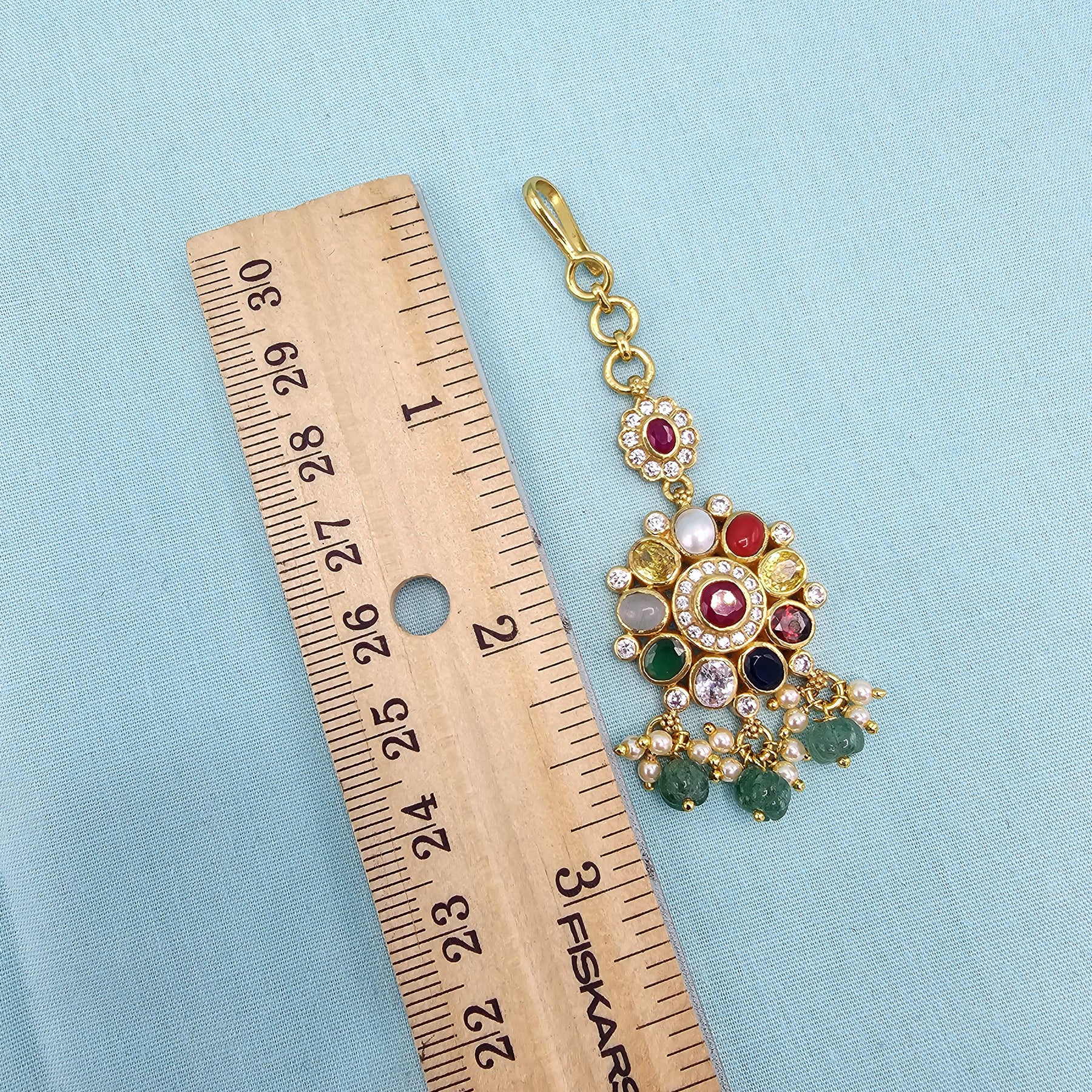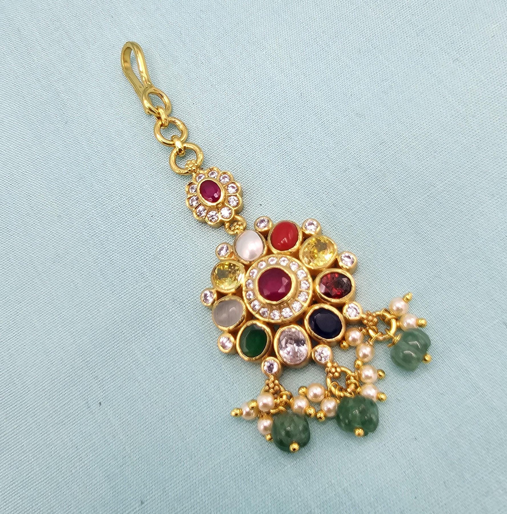 When you adorn maang tikka on your forehead and it will steel the show. This silver Mang Tikka has pink, green and white kundans. This intricately designed " tikka" would surely glamorize any occasion. They give a glamorous outlook to the traditional outfits.