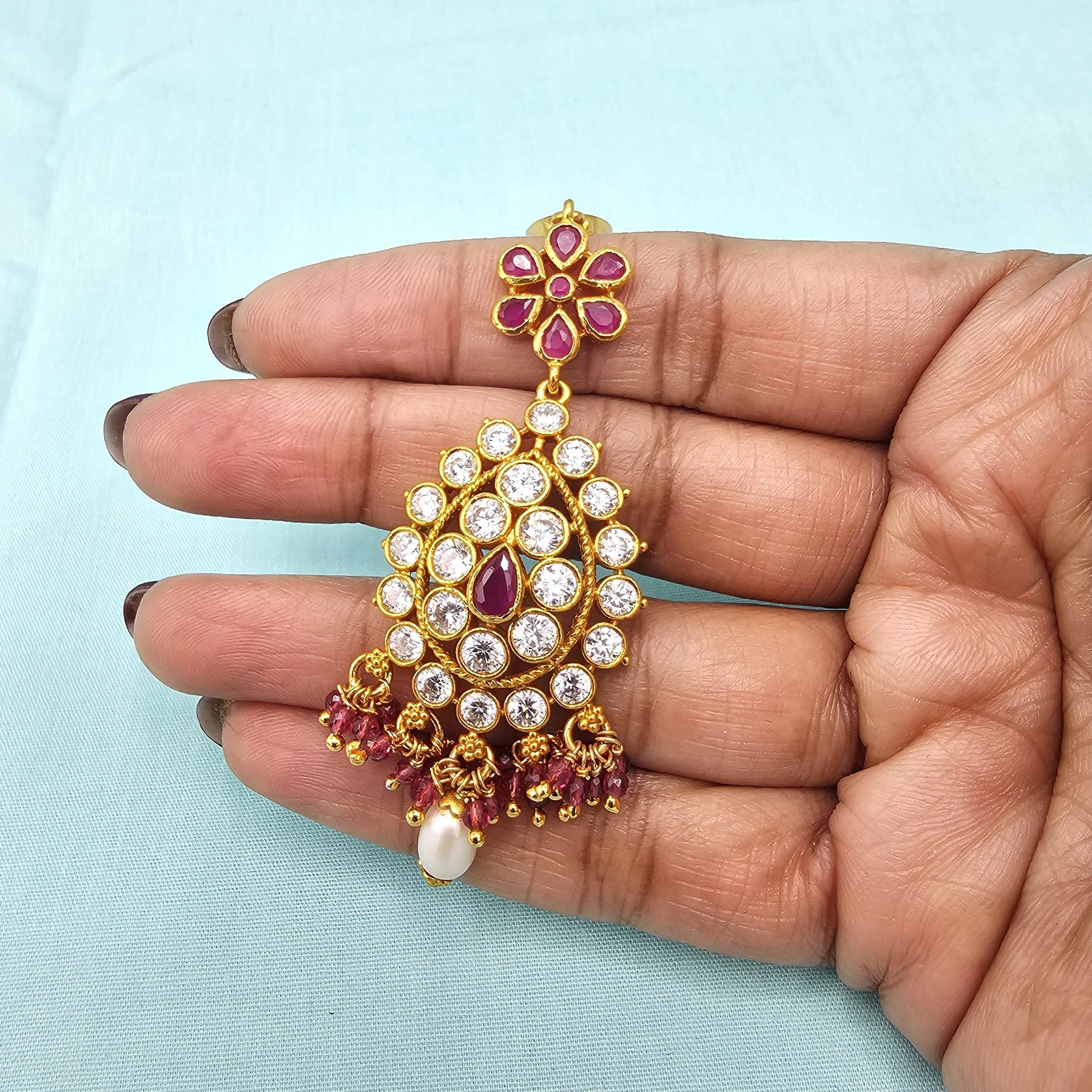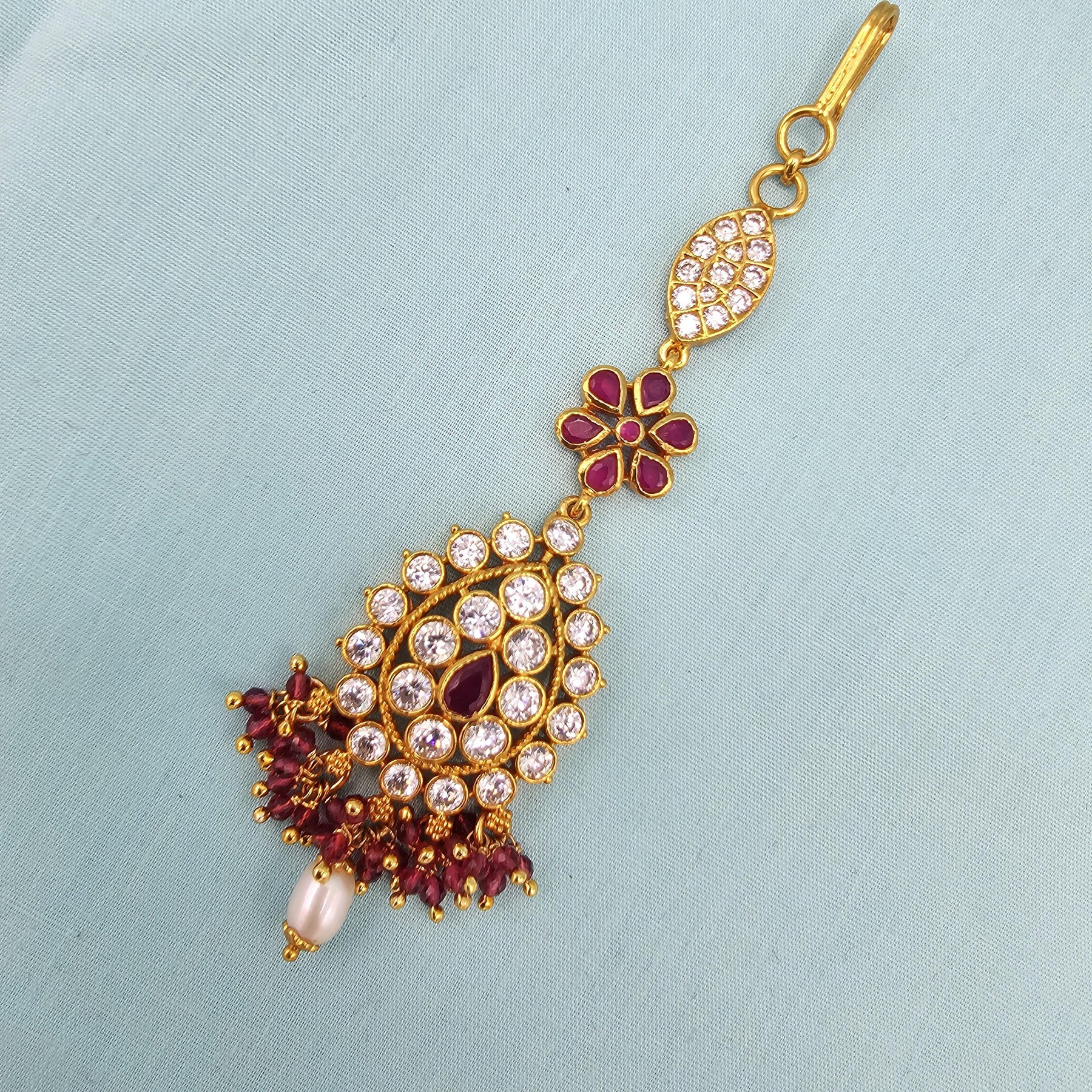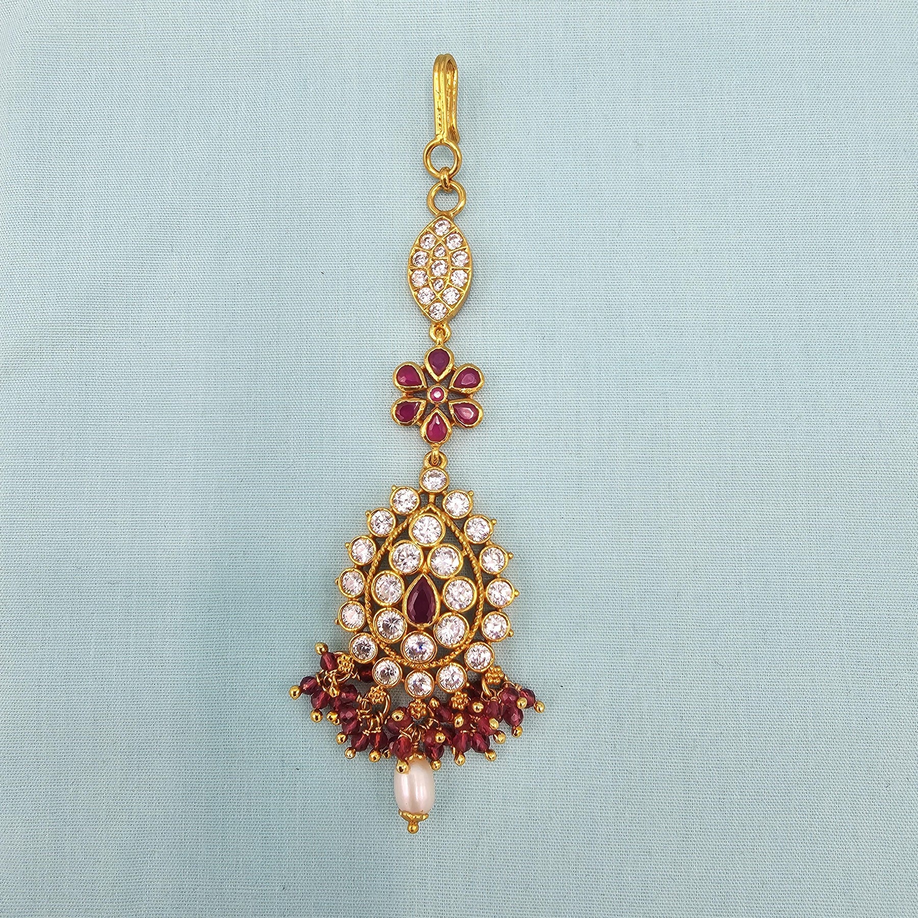 When you adorn maang tikka on your forehead and it will steel the show. This silver Mang Tikka has pink, green and white kundans. This intricately designed " tikka" would surely glamorize any occasion. They give a glamorous outlook to the traditional outfits.