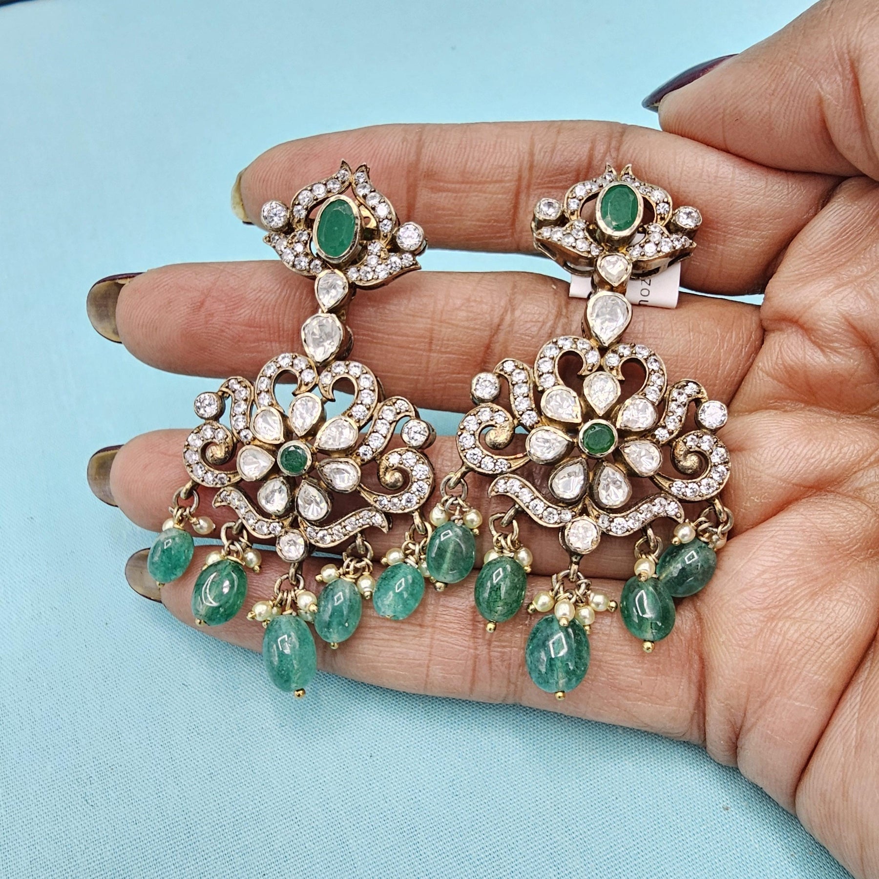 92.5 victorian Jhumka, Moissanite Jhumka, green beads Jhumka, Indian traditional jhumka, Silver earrings