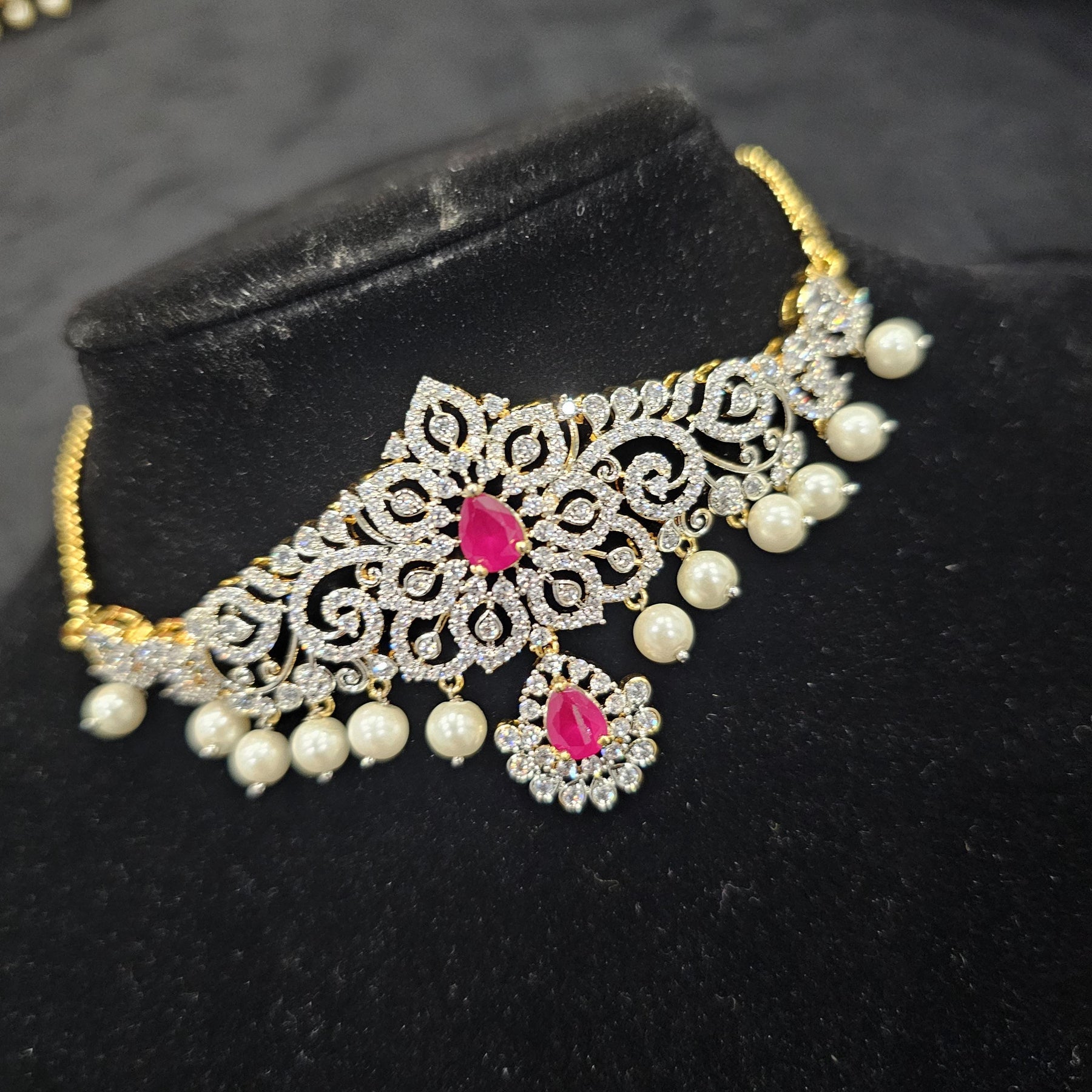 Stones: Cubic Zirconia, Semiprecious Ruby and Pearls