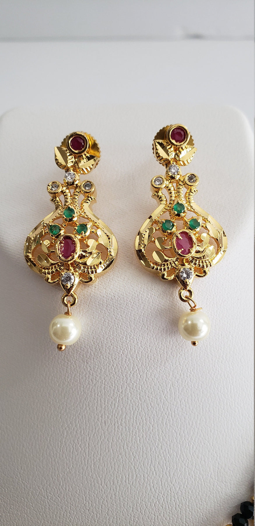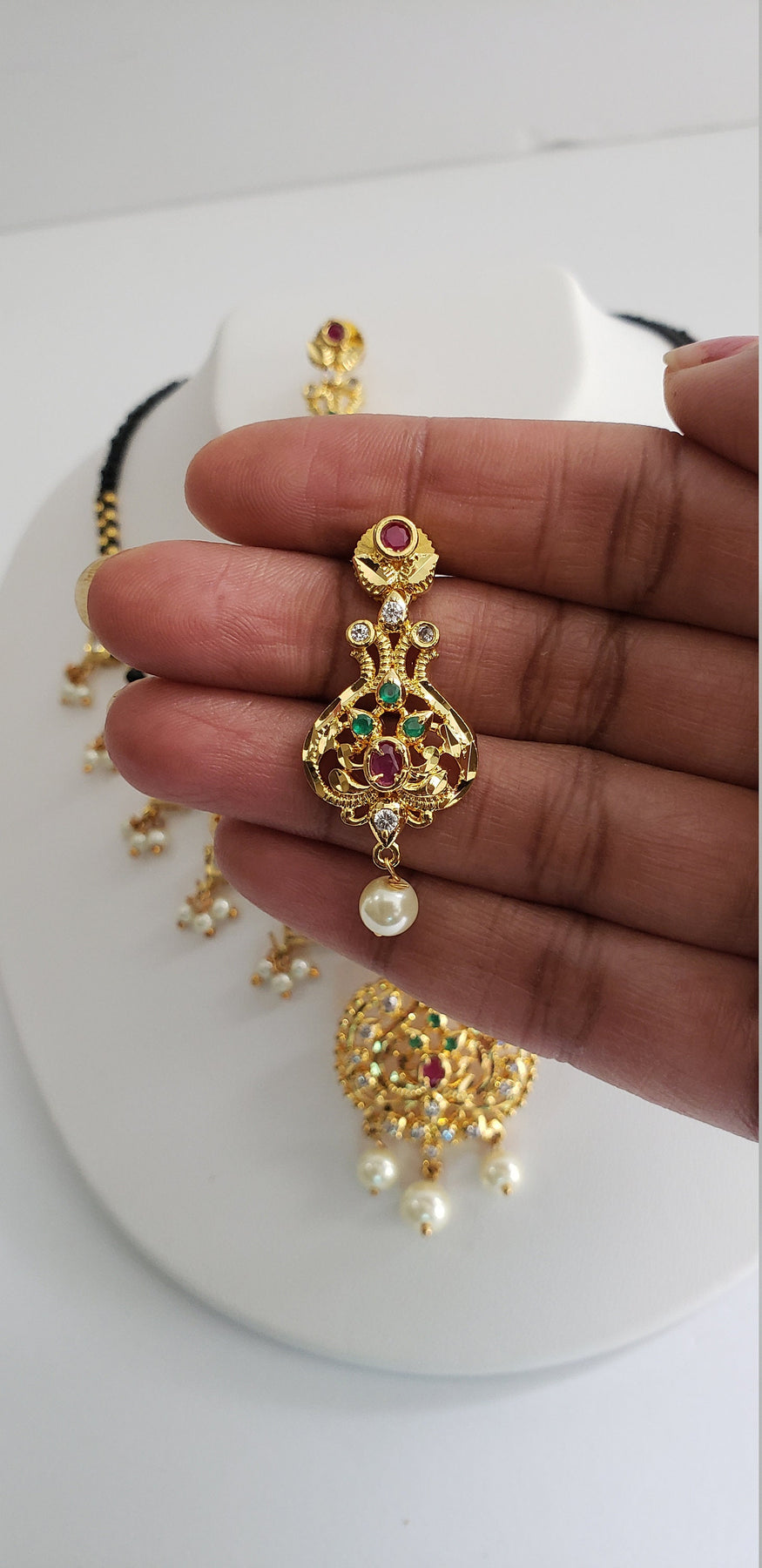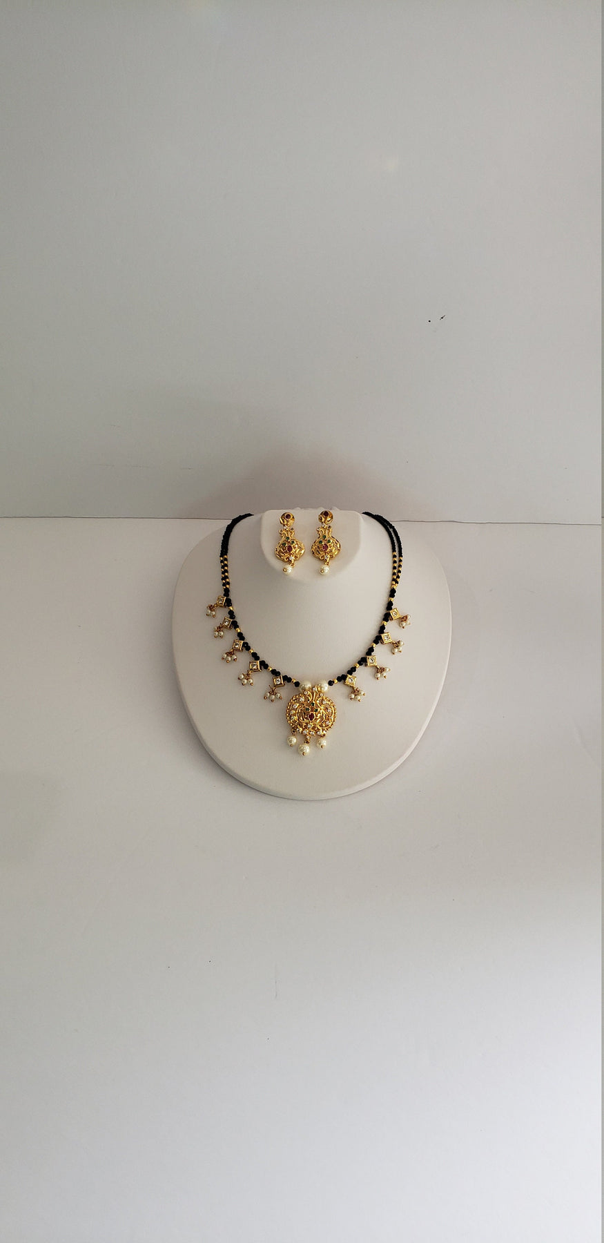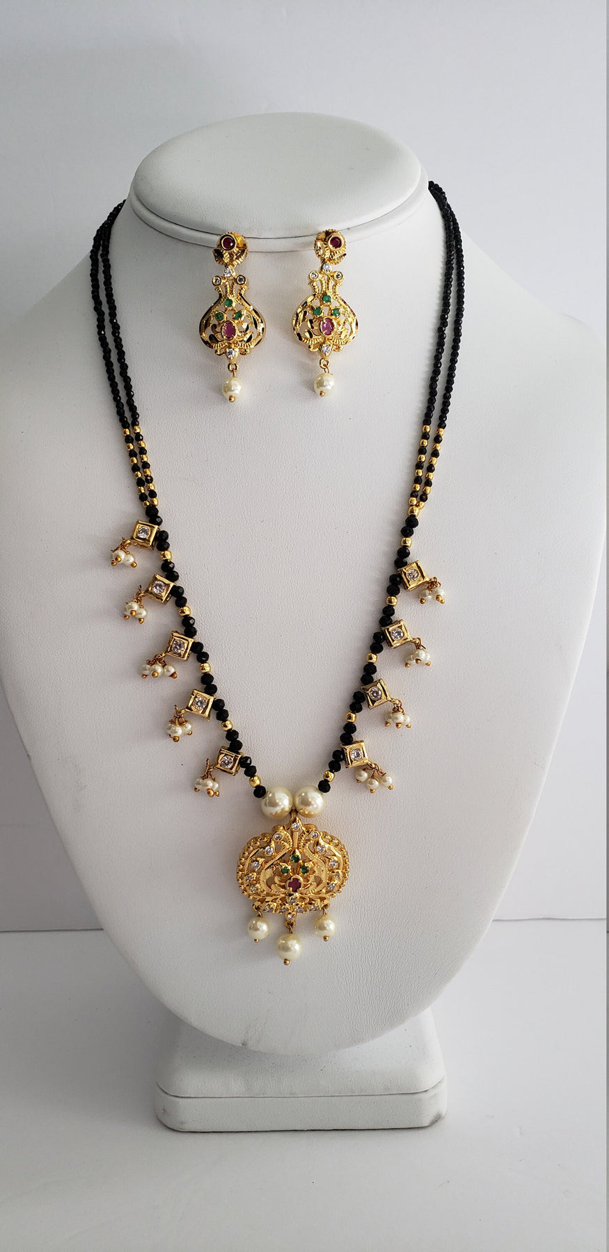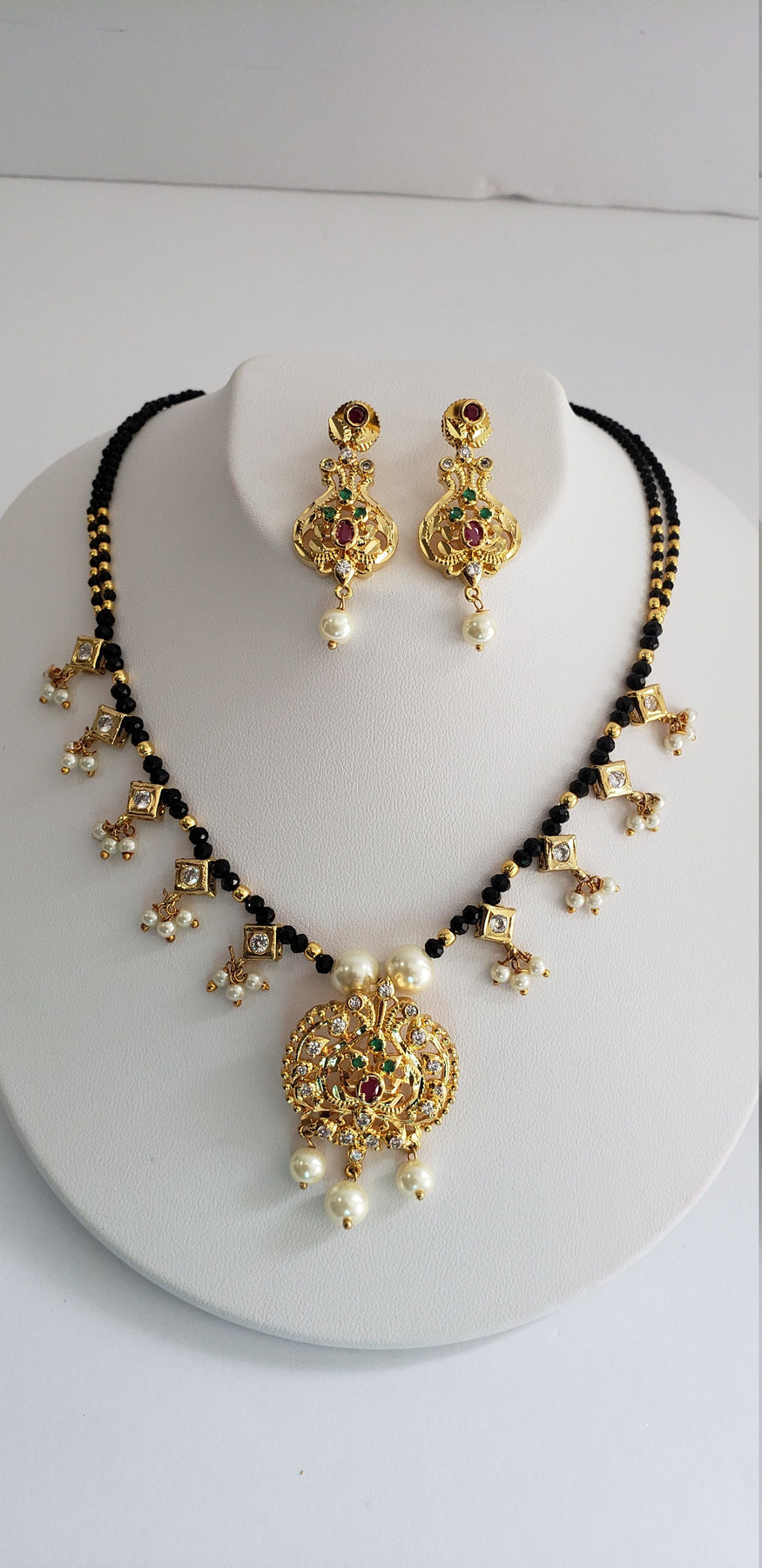Each piece is handcrafted and made to orders. All the raw material used in this product is of high quality and is handcrafted with love. This beautiful traditional Indian necklace with black beads is handmade. Pendants studded with High quality CZ stones.