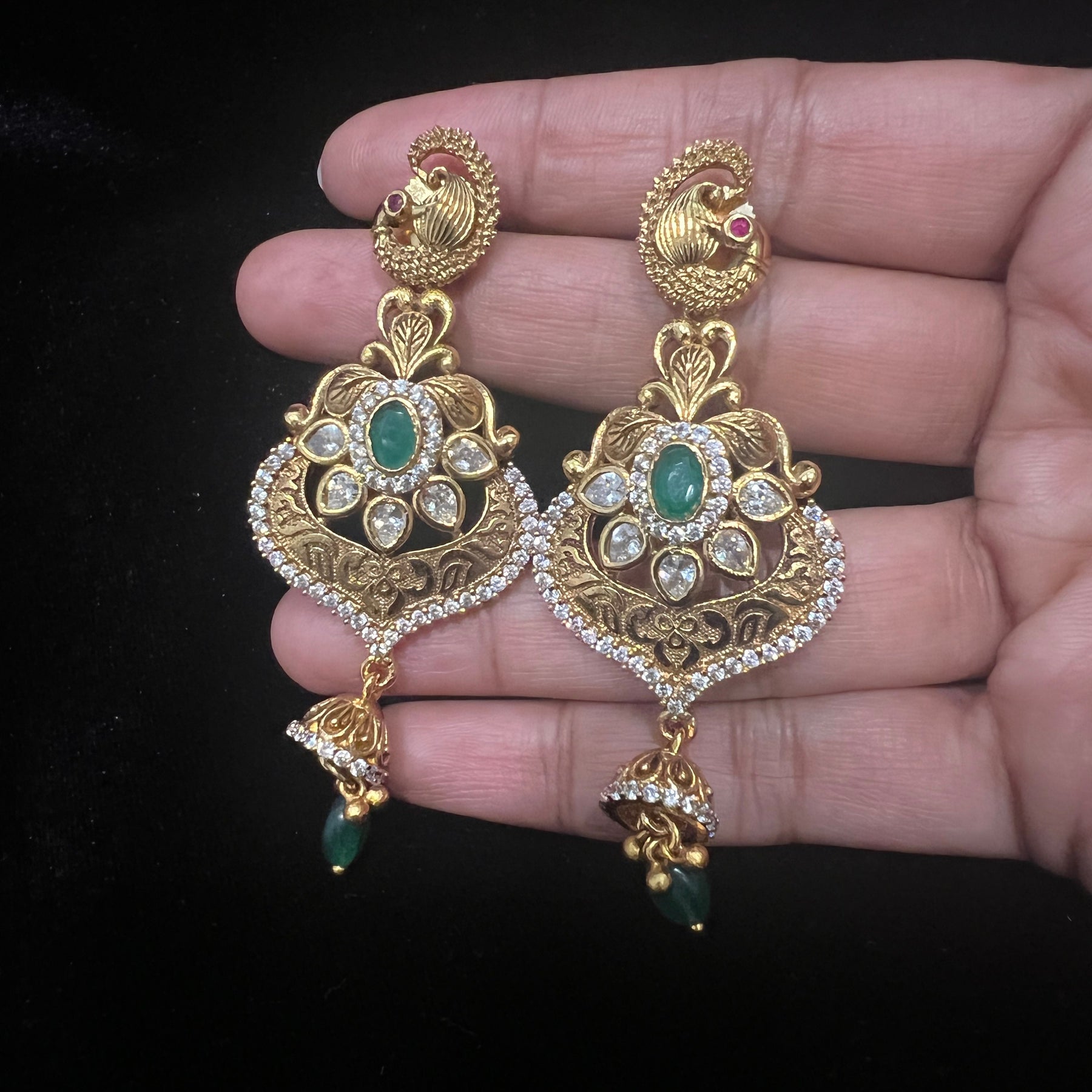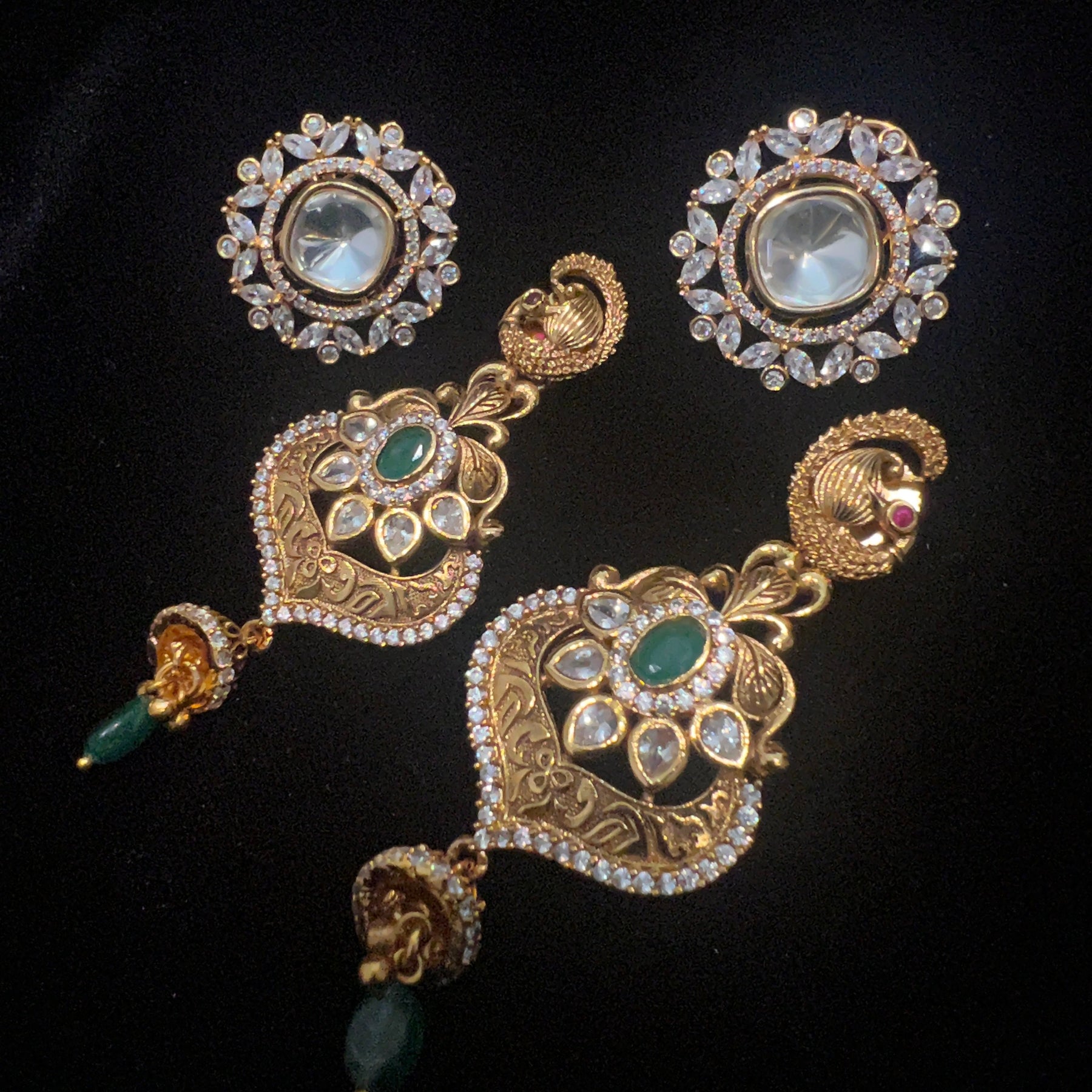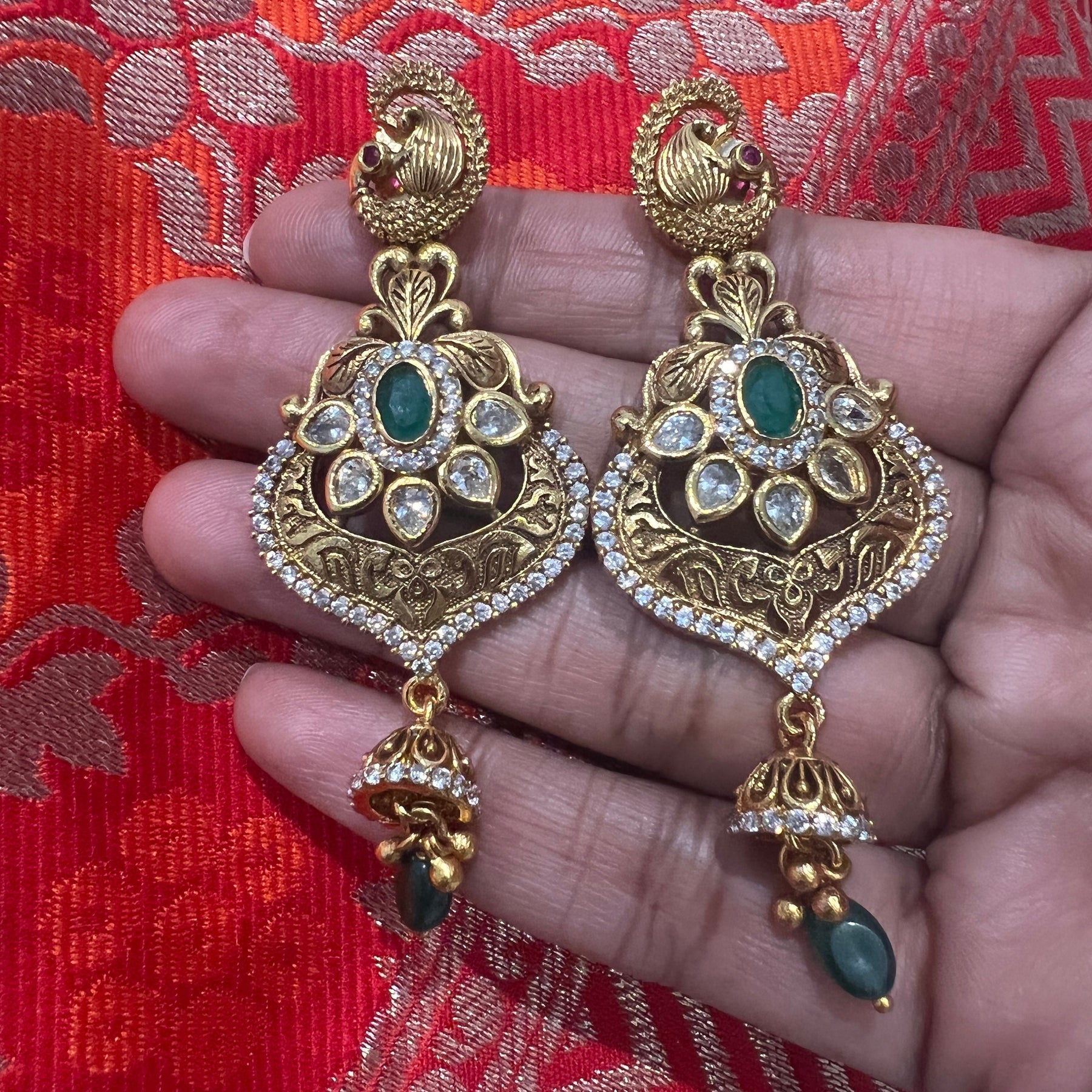 Handmade Indian Temple Jewelry, best to wear it for traditional ceremonies or Indian wedding. This bridal jewelry has an ethnic finish. It has Cubic Zircon stones with semi precious ruby and emeralds. It is a Bollywood style one gram jewelry. There are long and short patterns of Indian jewelry in Kundan, Pearls, CZ, American Diamond, ruby, emerald, Polki, kemp to suit every occasion of South Indian and North Indian weddings.