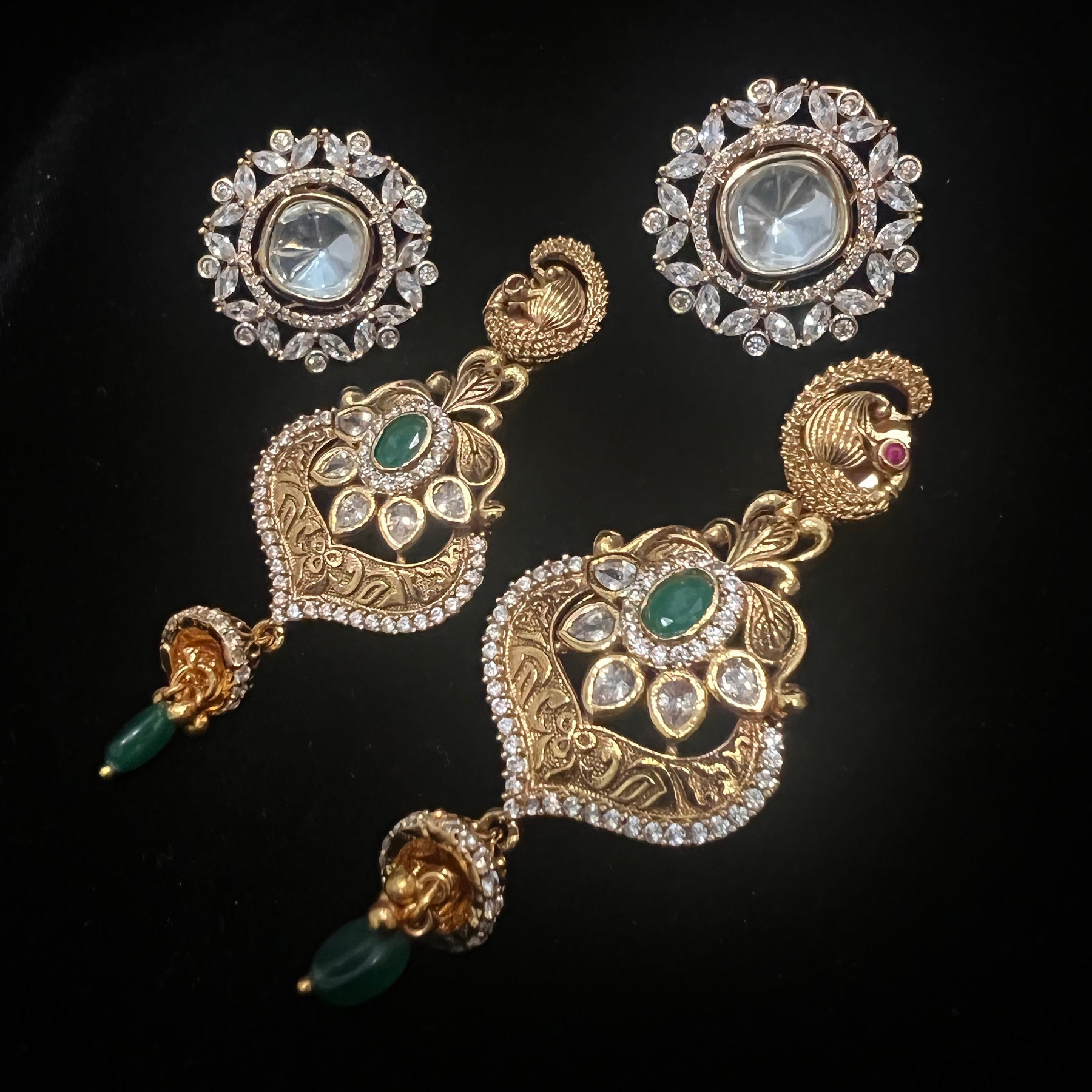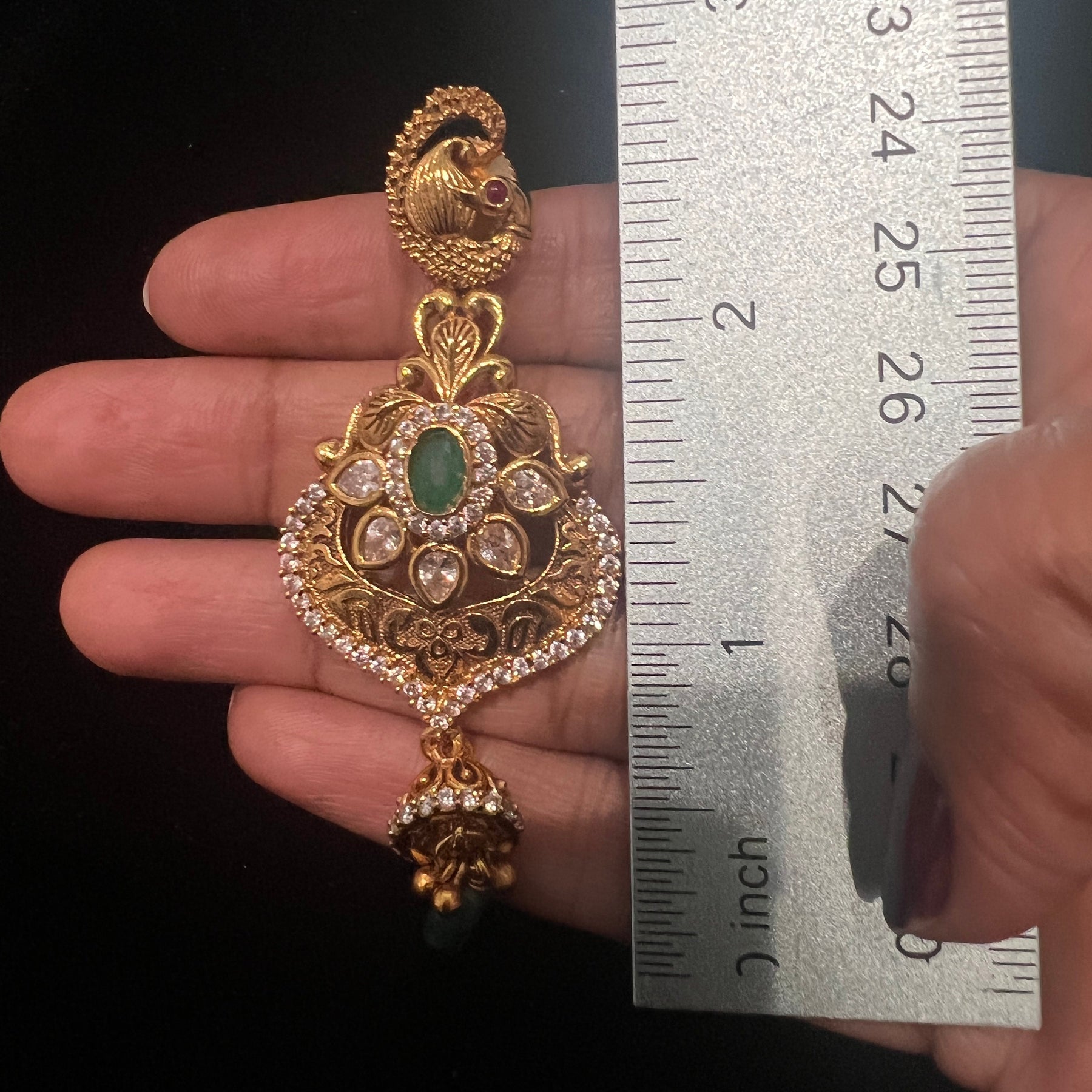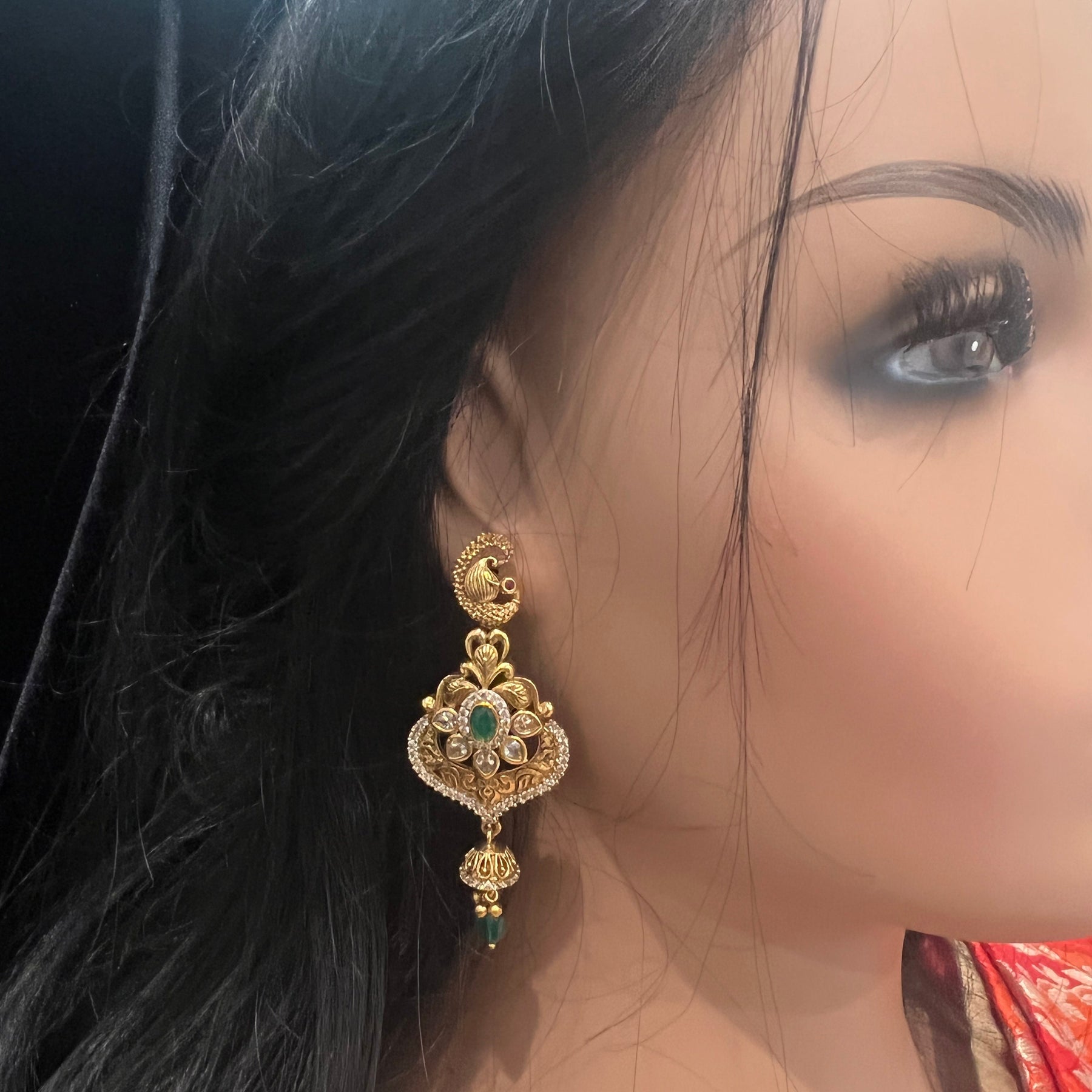 Handmade Indian Temple Jewelry, best to wear it for traditional ceremonies or Indian wedding. This bridal jewelry has an ethnic finish. It has Cubic Zircon stones with semi precious ruby and emeralds. It is a Bollywood style one gram jewelry. There are long and short patterns of Indian jewelry in Kundan, Pearls, CZ, American Diamond, ruby, emerald, Polki, kemp to suit every occasion of South Indian and North Indian weddings.