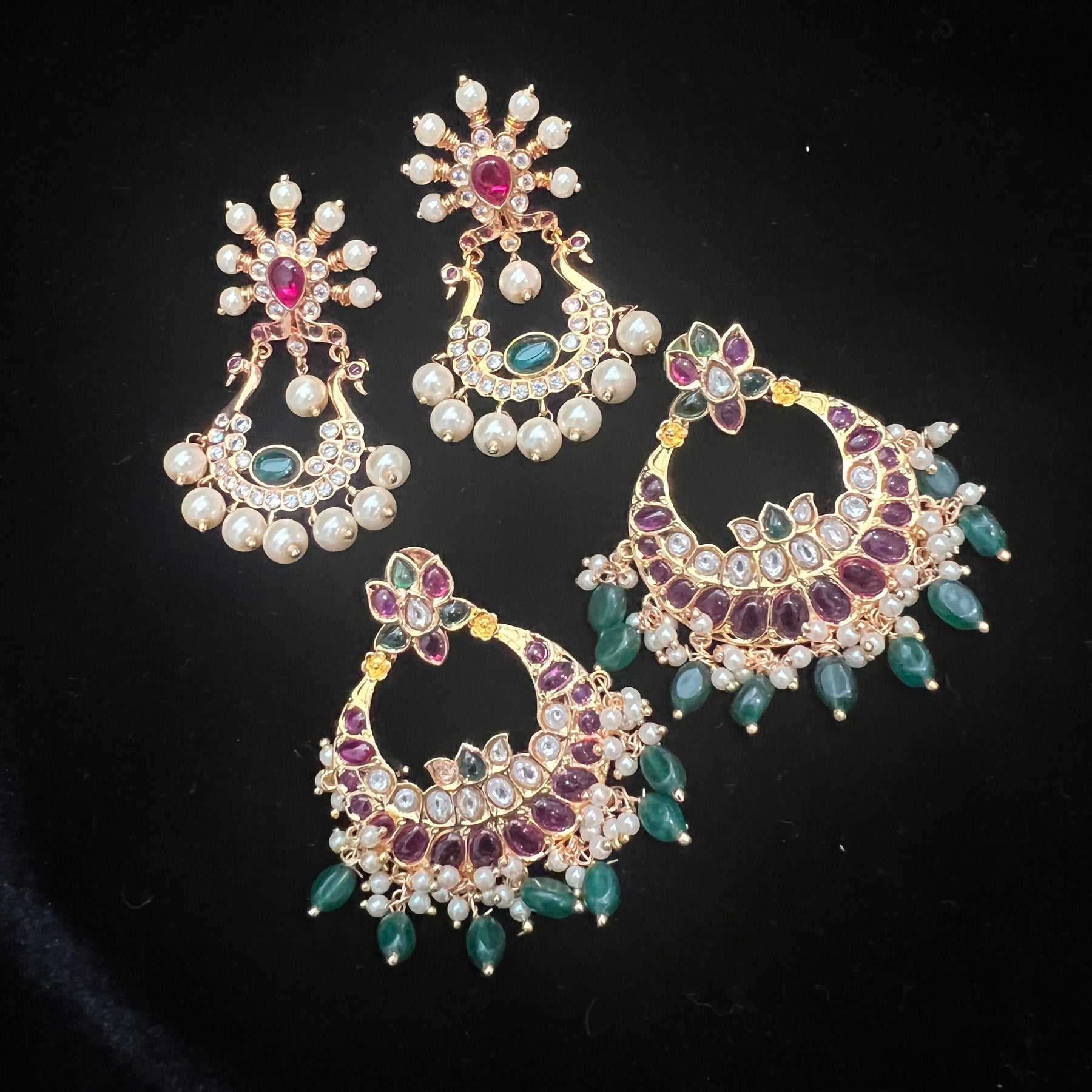 Handmade Indian Temple Jewelry, best to wear it for traditional ceremonies or Indian wedding. This bridal jewelry has ethnic finish. It has Cubic Zircon stones with ruby and emeralds. It is a Bollywood style one gram jewelry. There are long and short patterns of Indian jewelry in Kundan, Pearls, CZ, American Diamond , ruby, emerald, Polki, kemp to suit every occasion of South Indian and North Indian weddings.