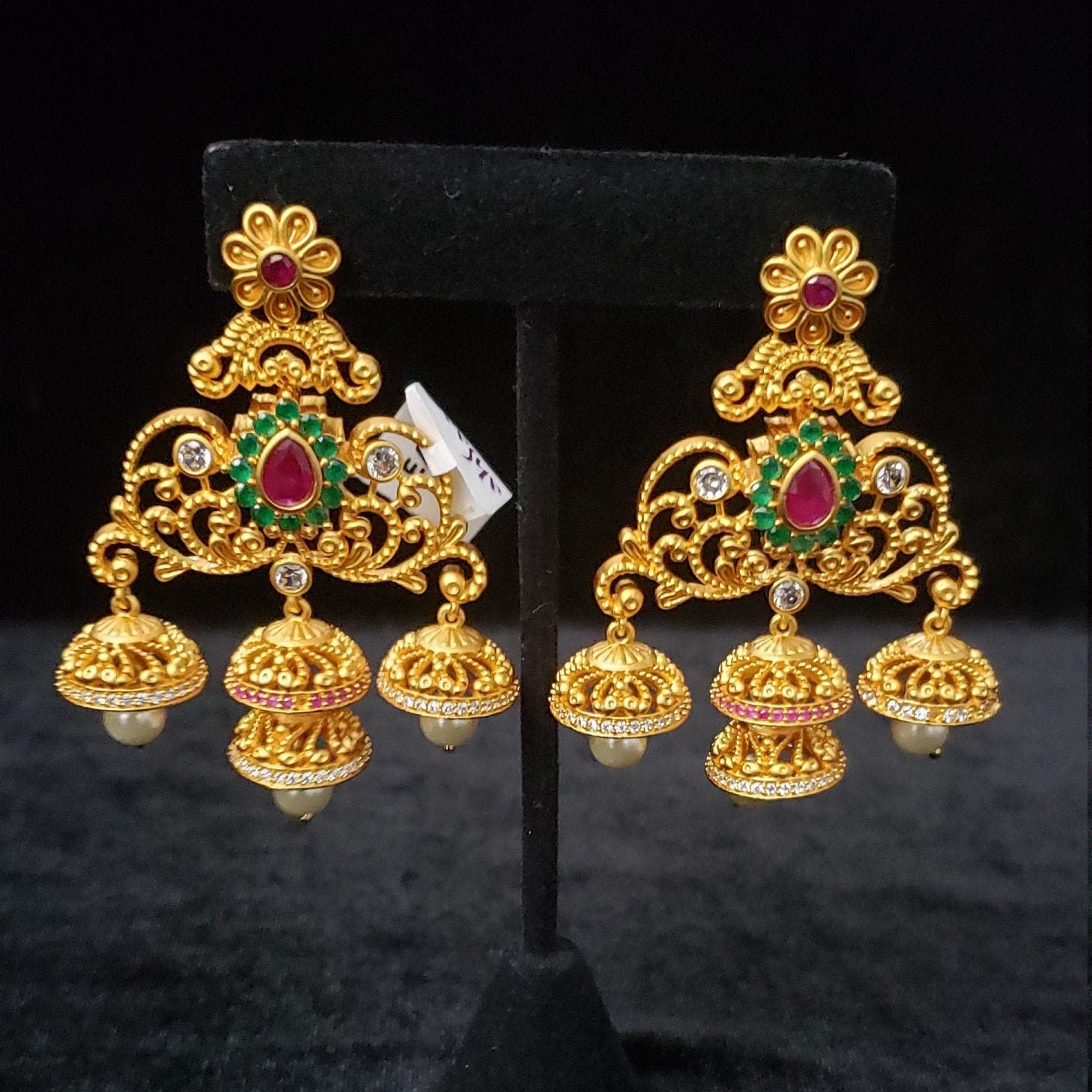 Handmade Indian Temple Jewelry, best to wear it for traditional ceremonies or Indian wedding. This bridal jewelry has an ethnic finish. It has Cubic Zircon stones with semi precious ruby and emeralds. It is a Bollywood style one gram jewelry. There are long and short patterns of Indian jewelry in Kundan, Pearls, CZ, American Diamond, ruby, emerald, Polki, kemp to suit every occasion of South Indian and North Indian weddings.