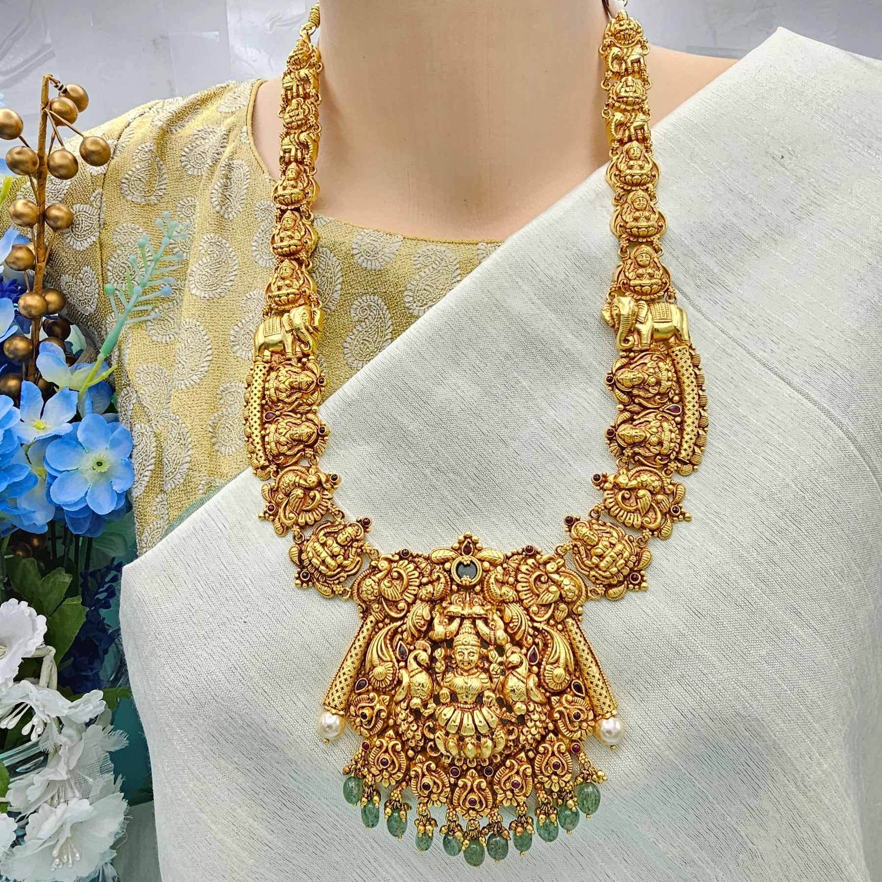 925 Silver nakshi necklace, Long nakshi Lakshmi necklace with green beads , long haram, bridal Indian jewelry with 92.5 Hallmark. Ships from Atlanta, USA.