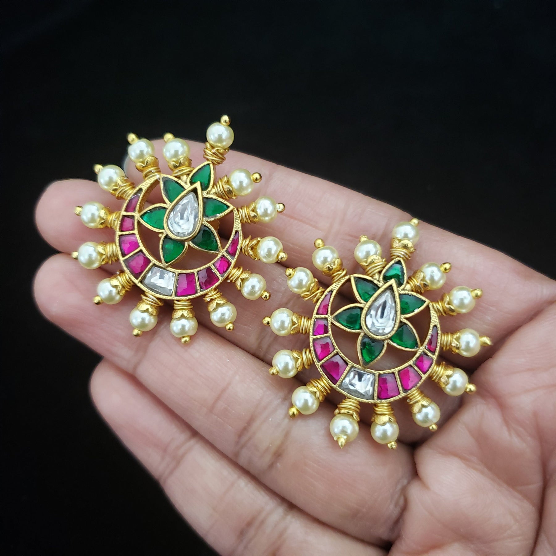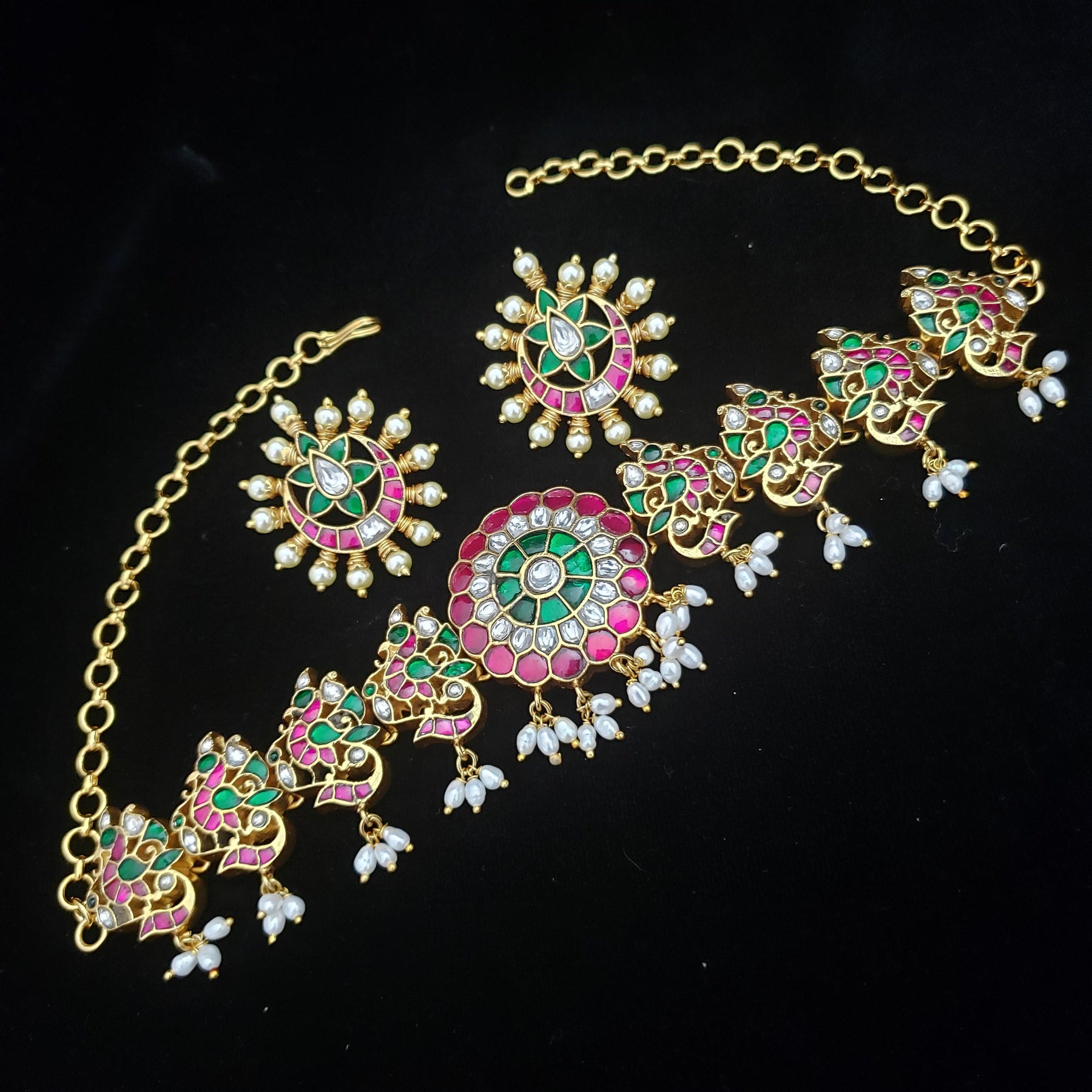 Handmade Indian Temple Jewelry, best to wear it for traditional ceremonies or Indian wedding. This bridal jewelry has ethnic finish. It has Cubic Zircon stones with ruby and emeralds. It is a Bollywood style one gram jewelry. There are long and short patterns of Indian jewelry in Kundan, Pearls, CZ, American Diamond , ruby, emerald, Polki, kemp to suit every occasion of South Indian and North Indian weddings.