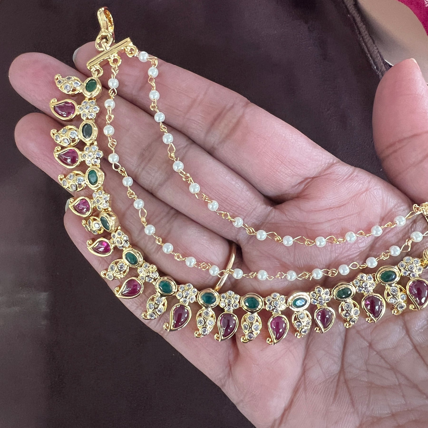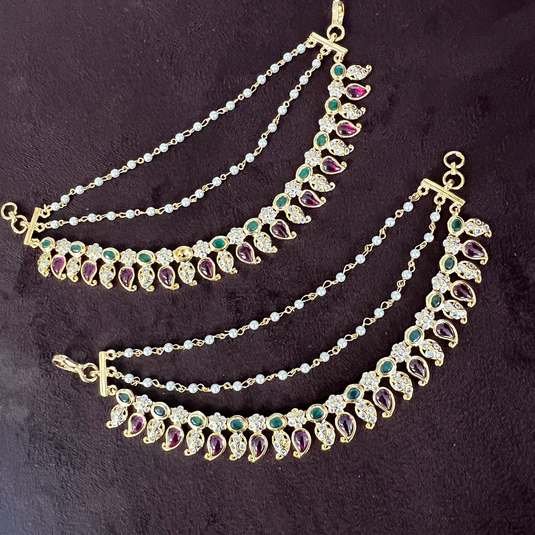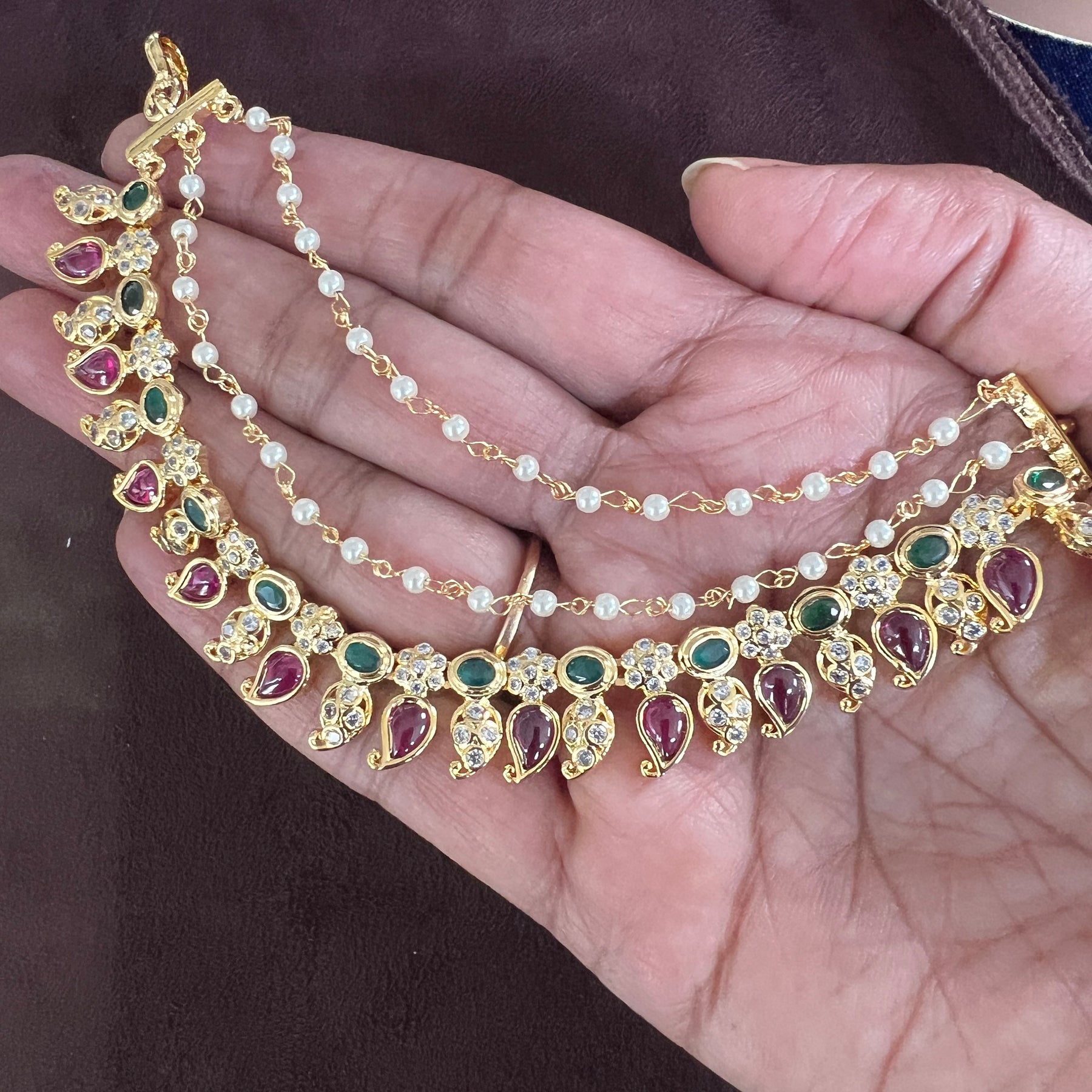 Handmade Indian Temple Jewelry, best to wear it for traditional ceremonies or Indian weddings. This bridal jewelry has an ethnic finish. It has Cubic Zircon stones with ruby and emeralds. It is a Bollywood style one gram jewelry. There are long and short patterns of Indian jewelry in Kundan, Pearls, CZ, American Diamond, ruby, emerald, Polki, kemp to suit every occasion of South Indian and North Indian weddings.