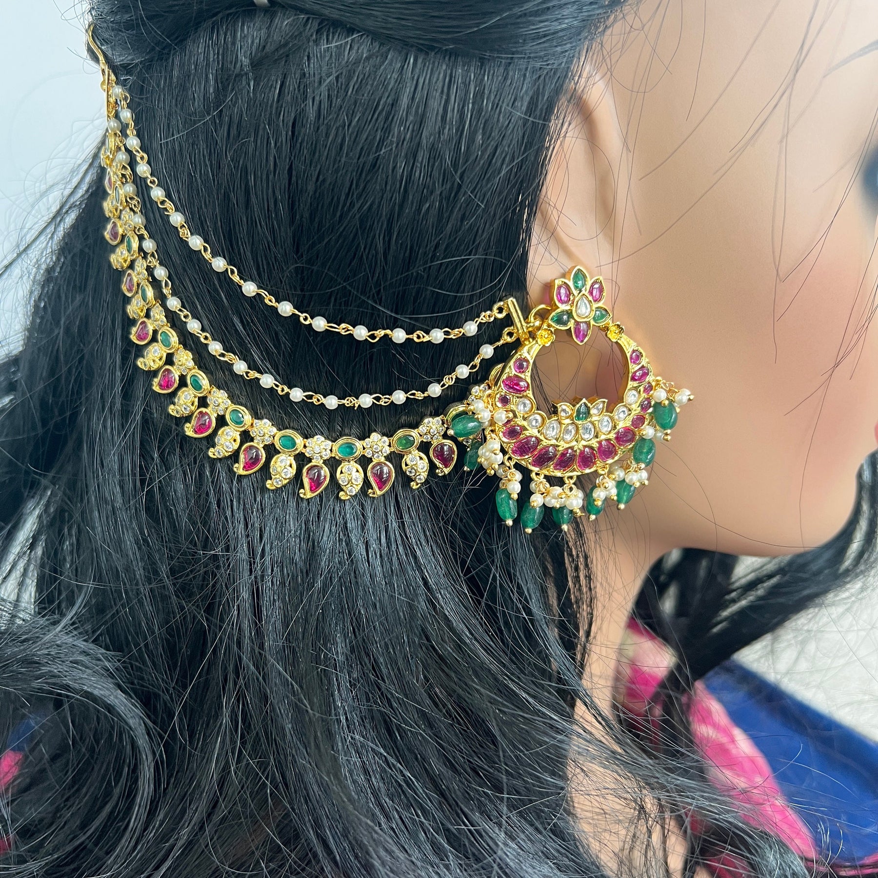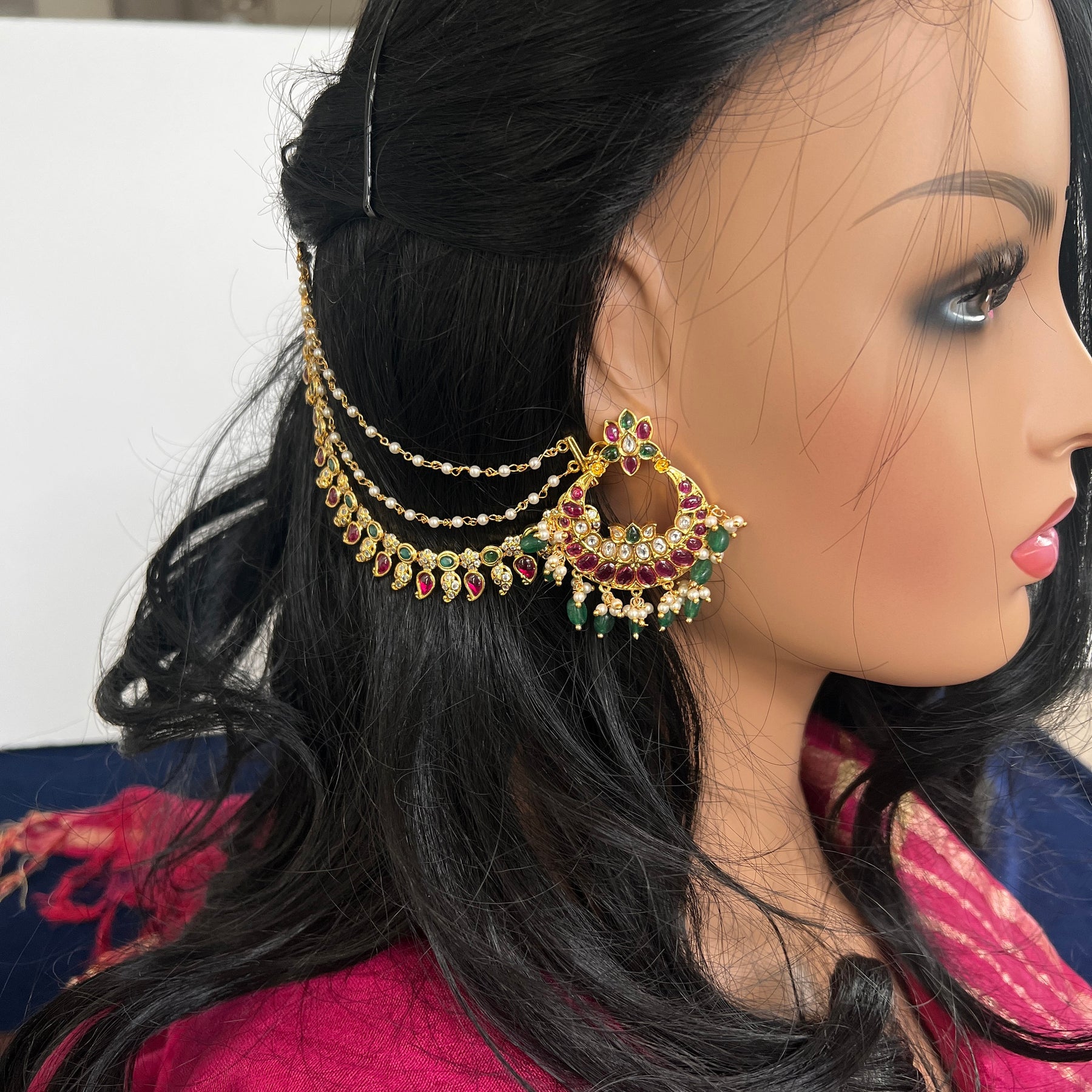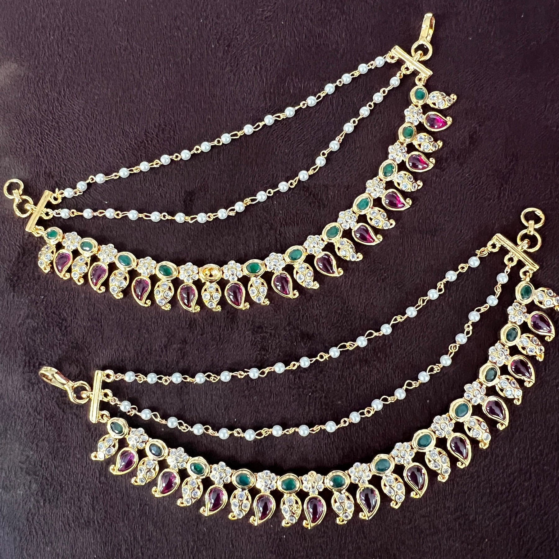 Handmade Indian Temple Jewelry, best to wear it for traditional ceremonies or Indian weddings. This bridal jewelry has an ethnic finish. It has Cubic Zircon stones with ruby and emeralds. It is a Bollywood style one gram jewelry. There are long and short patterns of Indian jewelry in Kundan, Pearls, CZ, American Diamond, ruby, emerald, Polki, kemp to suit every occasion of South Indian and North Indian weddings.