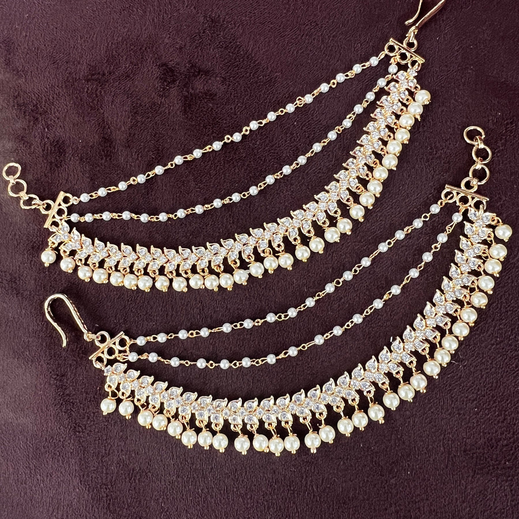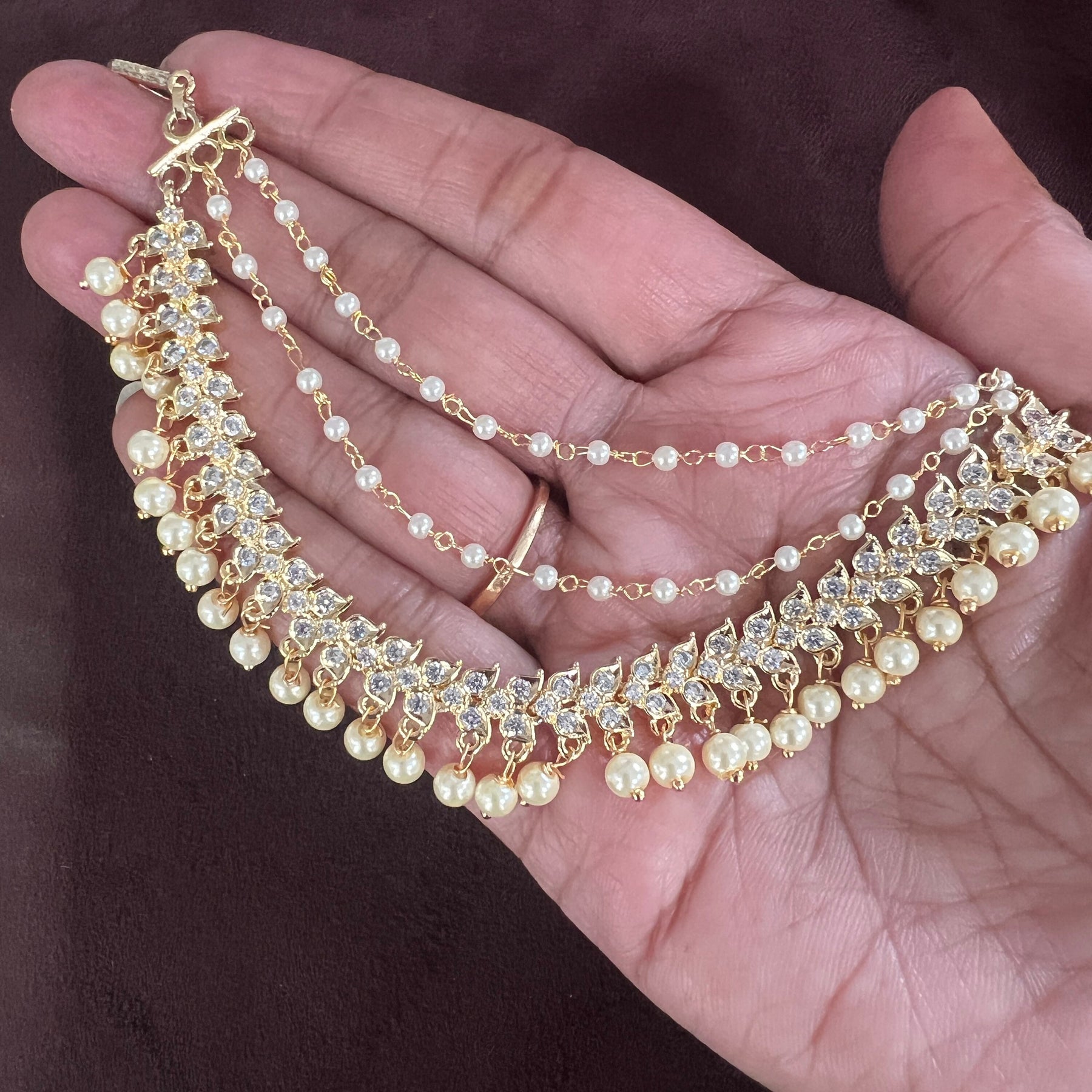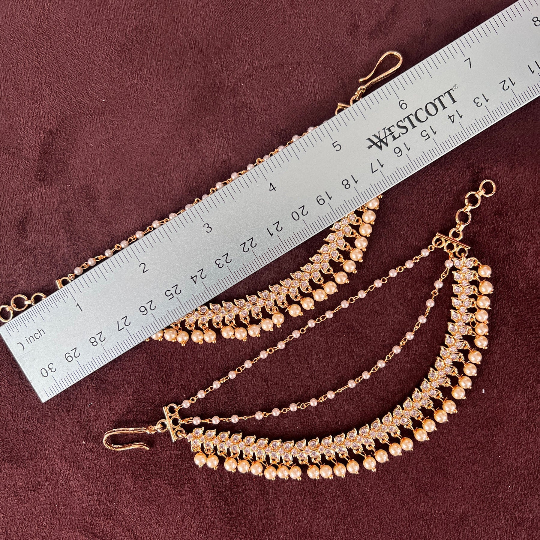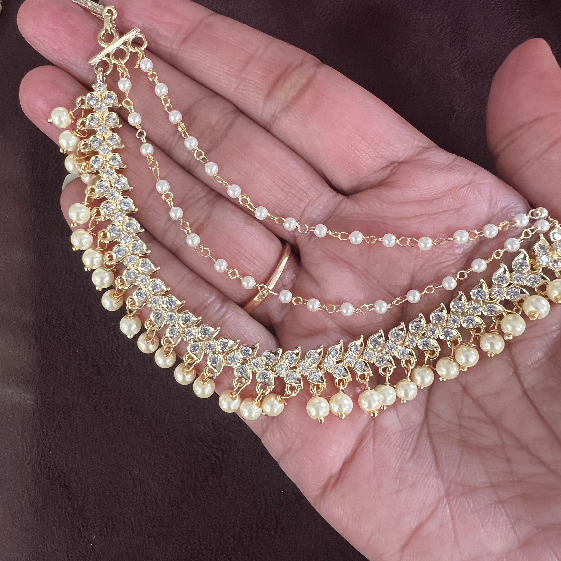 These Chempaswaralu are elegantly designed, from the house of glam to add a hint of ethnic beauty to any look. Representing a classic fusion and exquisite craftsmanship of feminine elegance, this set will definitely be a treasured inclusion in every woman's jewelry collection. The gold finish further enhances a long-lasting shine and sparkling sense.