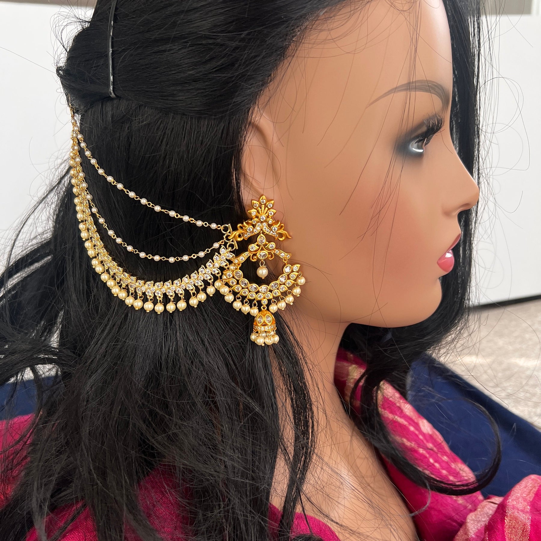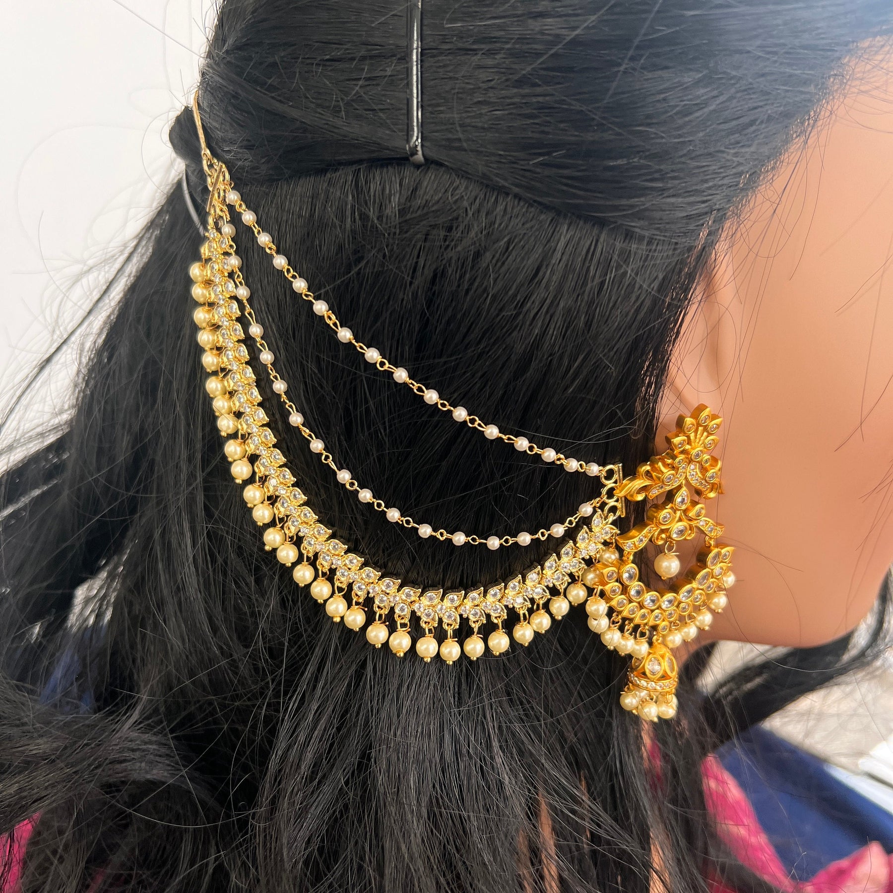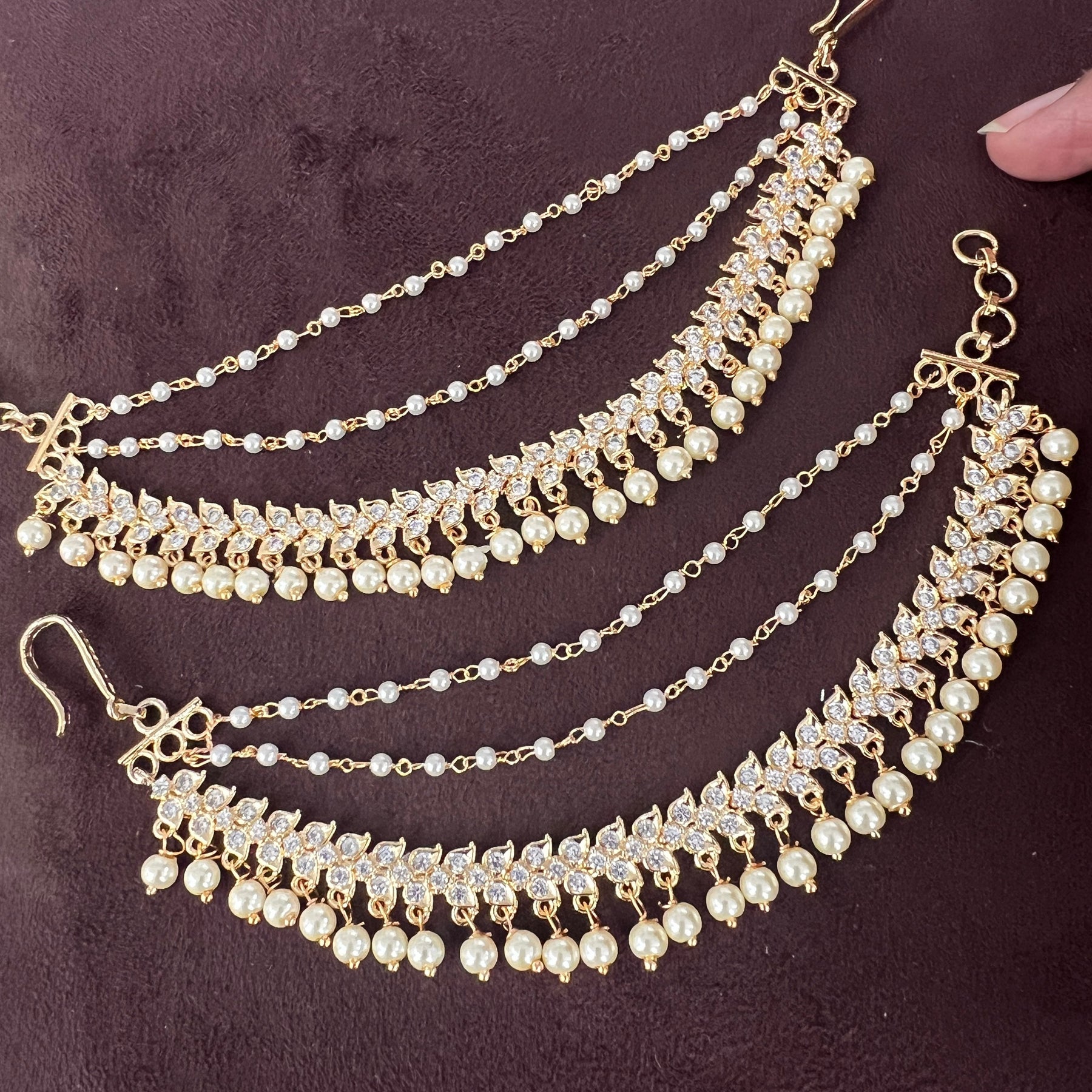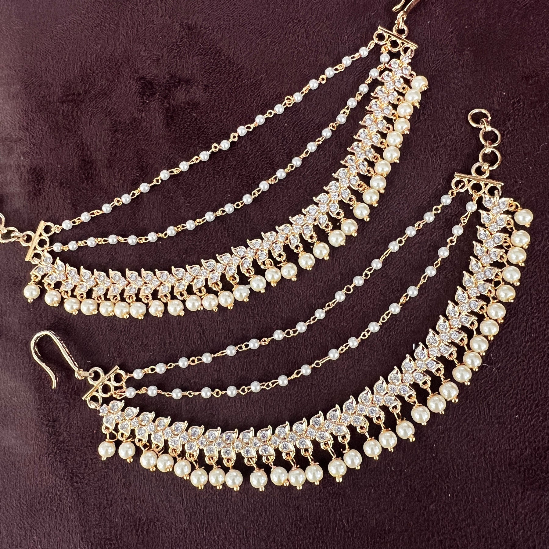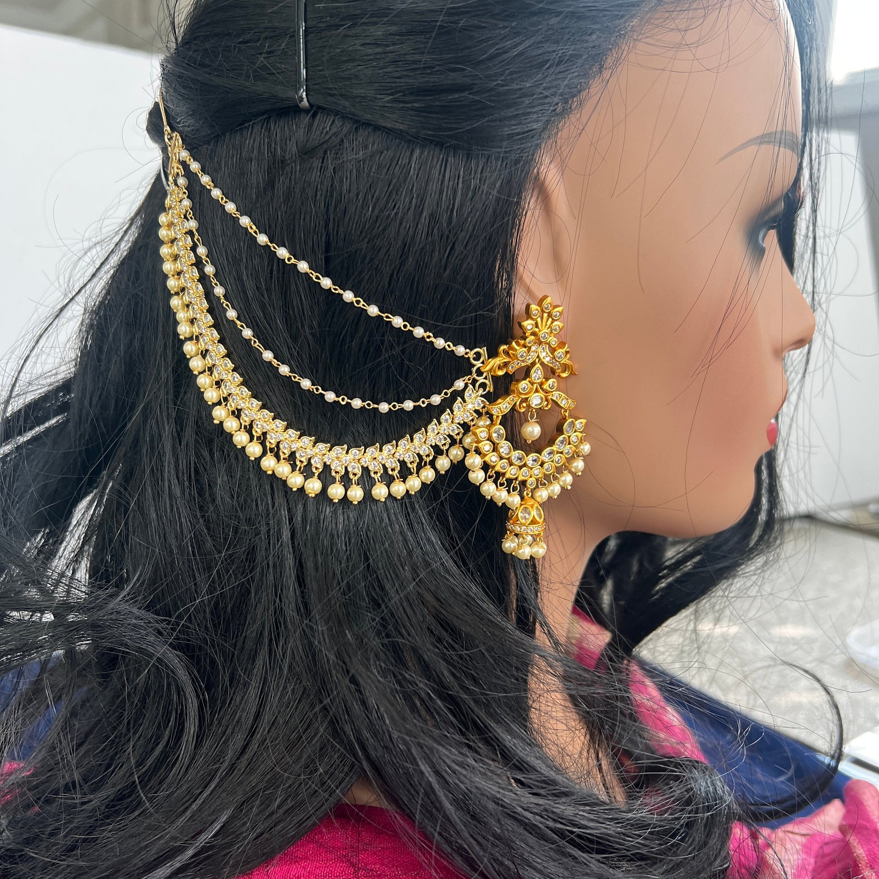 These Chempaswaralu are elegantly designed, from the house of glam to add a hint of ethnic beauty to any look. Representing a classic fusion and exquisite craftsmanship of feminine elegance, this set will definitely be a treasured inclusion in every woman's jewelry collection. The gold finish further enhances a long-lasting shine and sparkling sense.