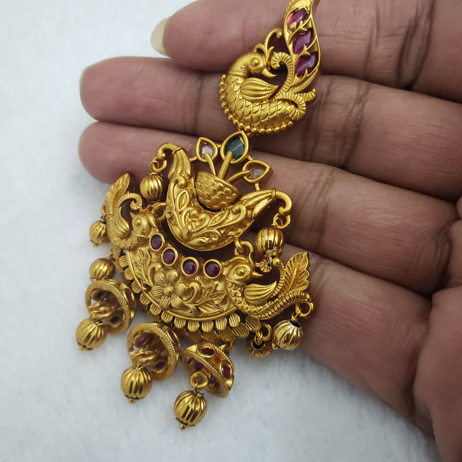 Handmade Indian Temple Jewelry, best to wear it for traditional ceremonies or Indian weddings. This bridal jewelry has ethnic finish. It has Cubic Zircon stones with ruby and emeralds. It is a Bollywood style one gram jewelry. There are long and short patterns of Indian jewelry in Kundan, Pearls, CZ, American Diamond , ruby, emerald, Polki, kemp to suit every occasion of South Indian and North Indian weddings.