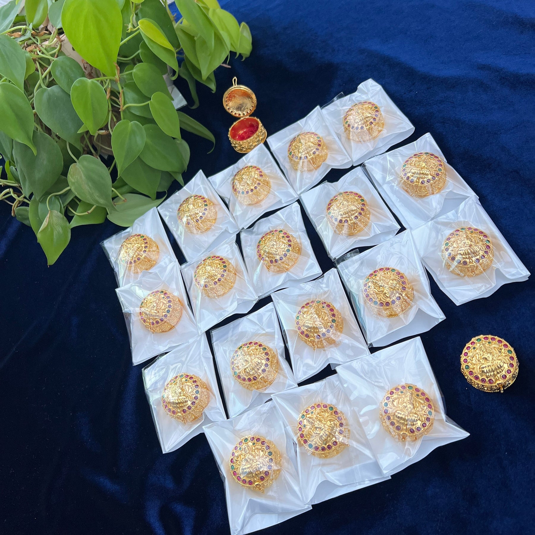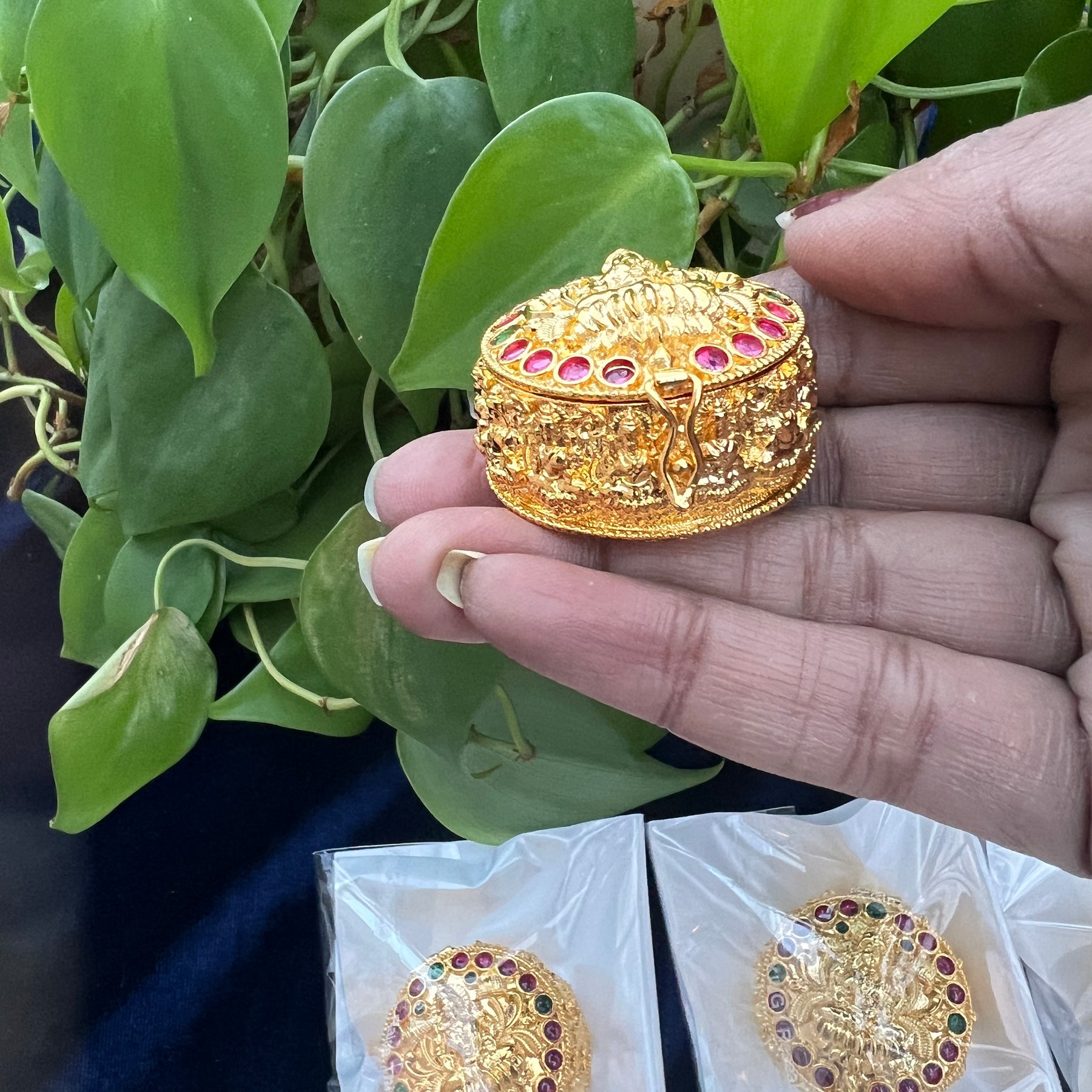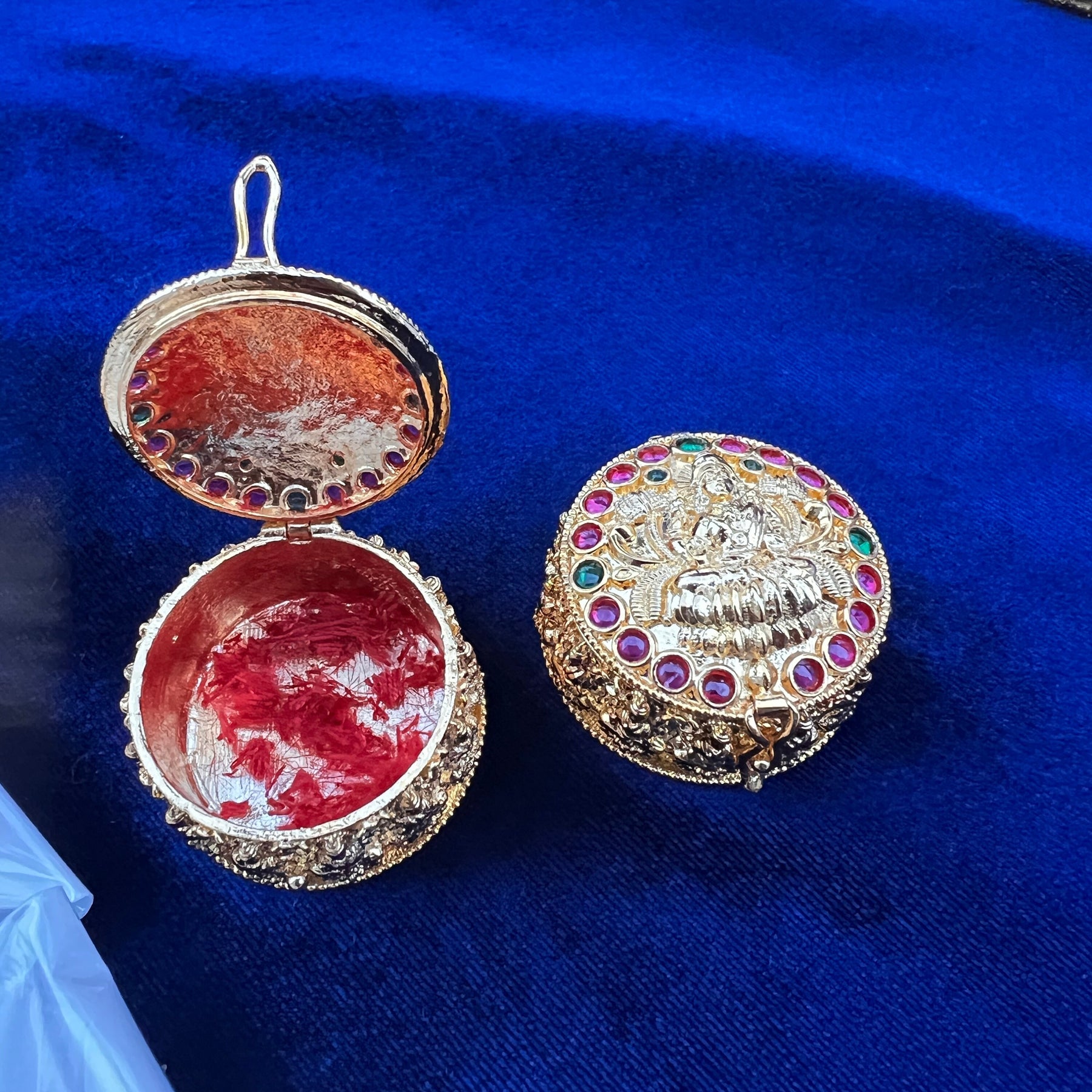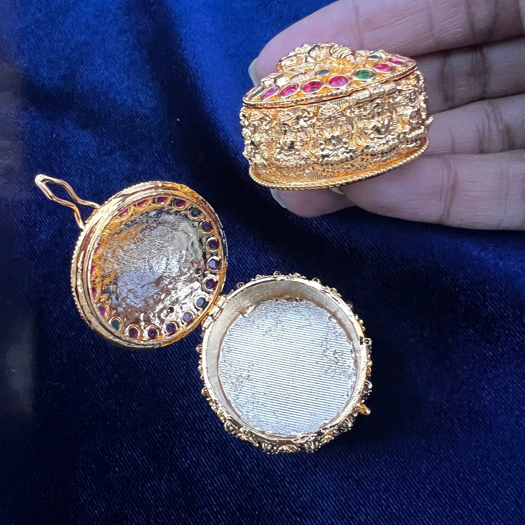 Antique matt finish haldi/ turmeric/ kumkum holder with aesthetically crafted peacock design and cute pearls embellished all over the kumkum box makes this an ideal gift or for decorating your pooja room. Has red stones studded all around. Can be used as ring holder or trinket box to hold your small sized precious gifts. This kumkum box comes with free shipping offer.