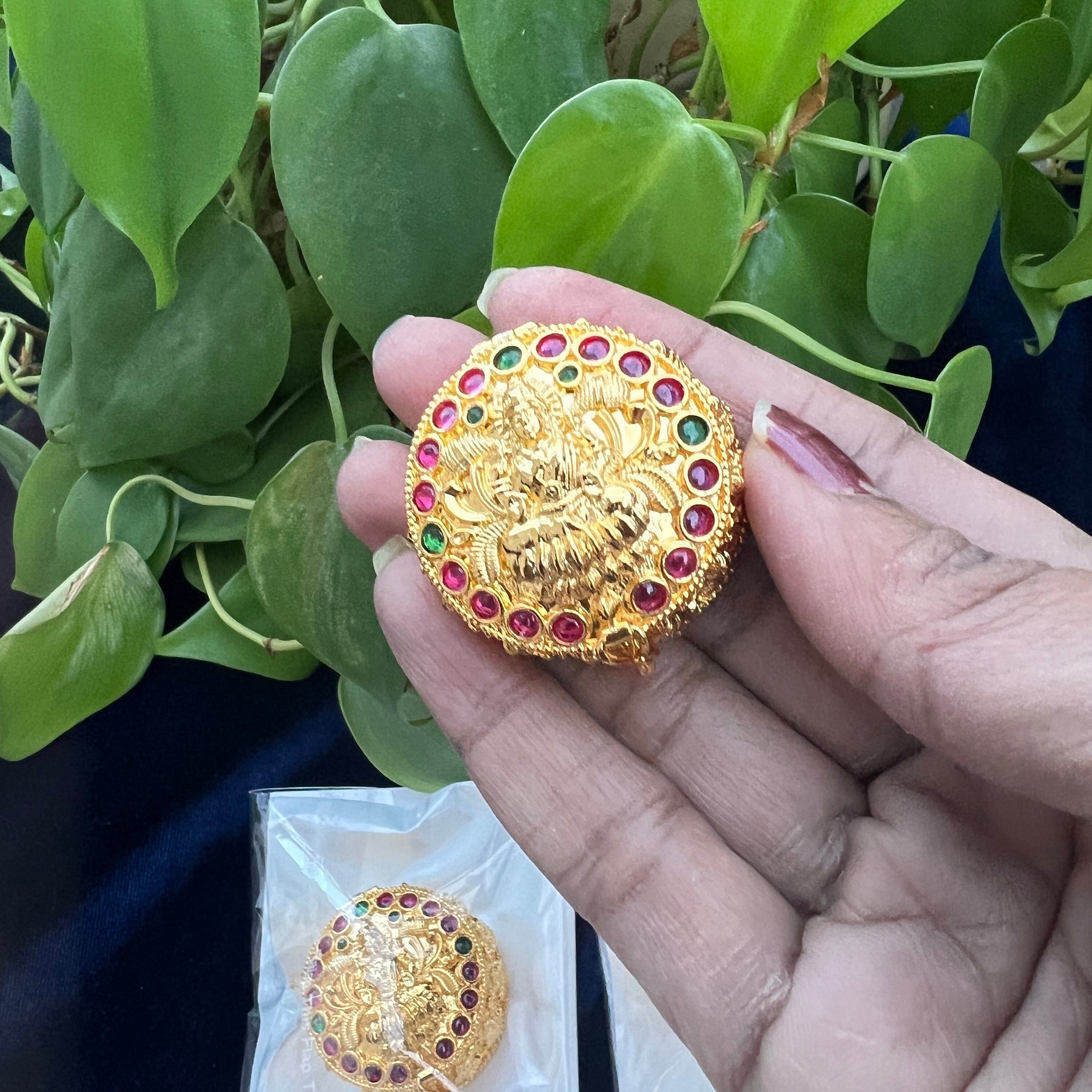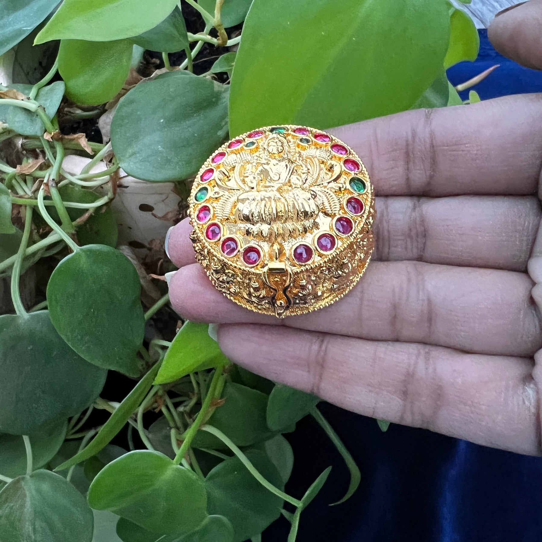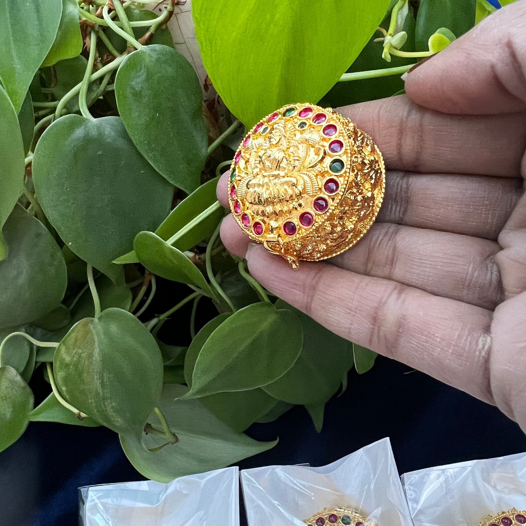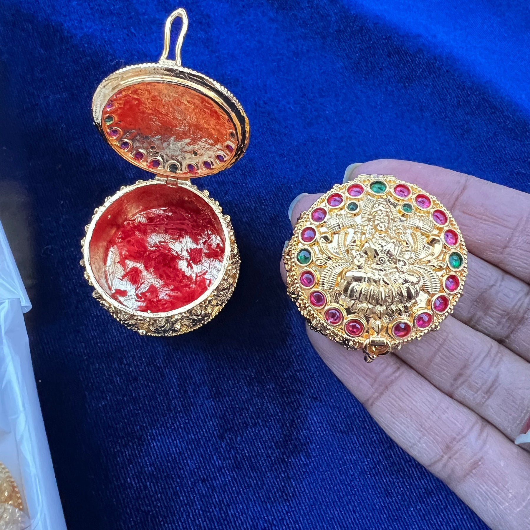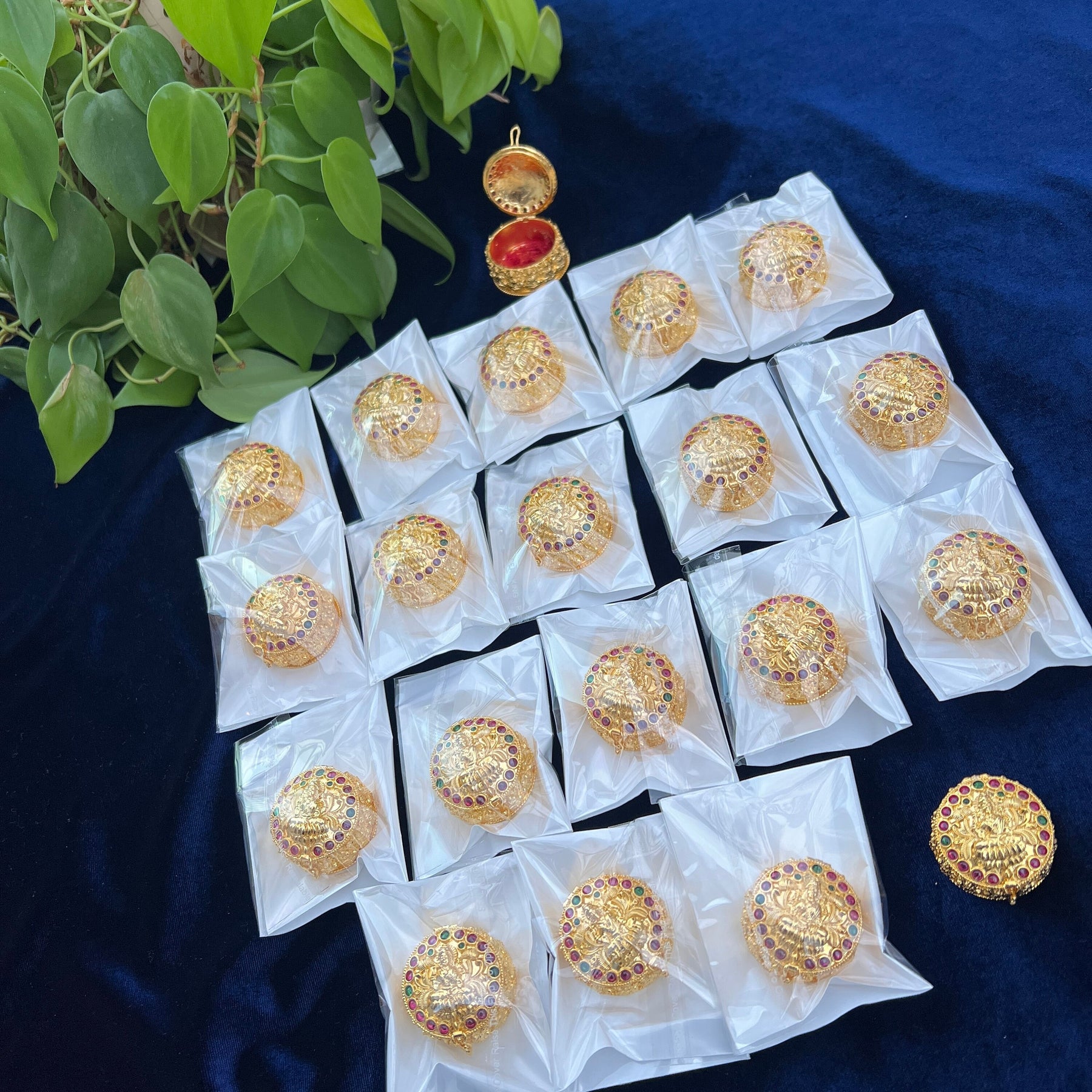 Antique matt finish haldi/ turmeric/ kumkum holder with aesthetically crafted peacock design and cute pearls embellished all over the kumkum box makes this an ideal gift or for decorating your pooja room. Has red stones studded all around. Can be used as ring holder or trinket box to hold your small sized precious gifts. This kumkum box comes with free shipping offer.