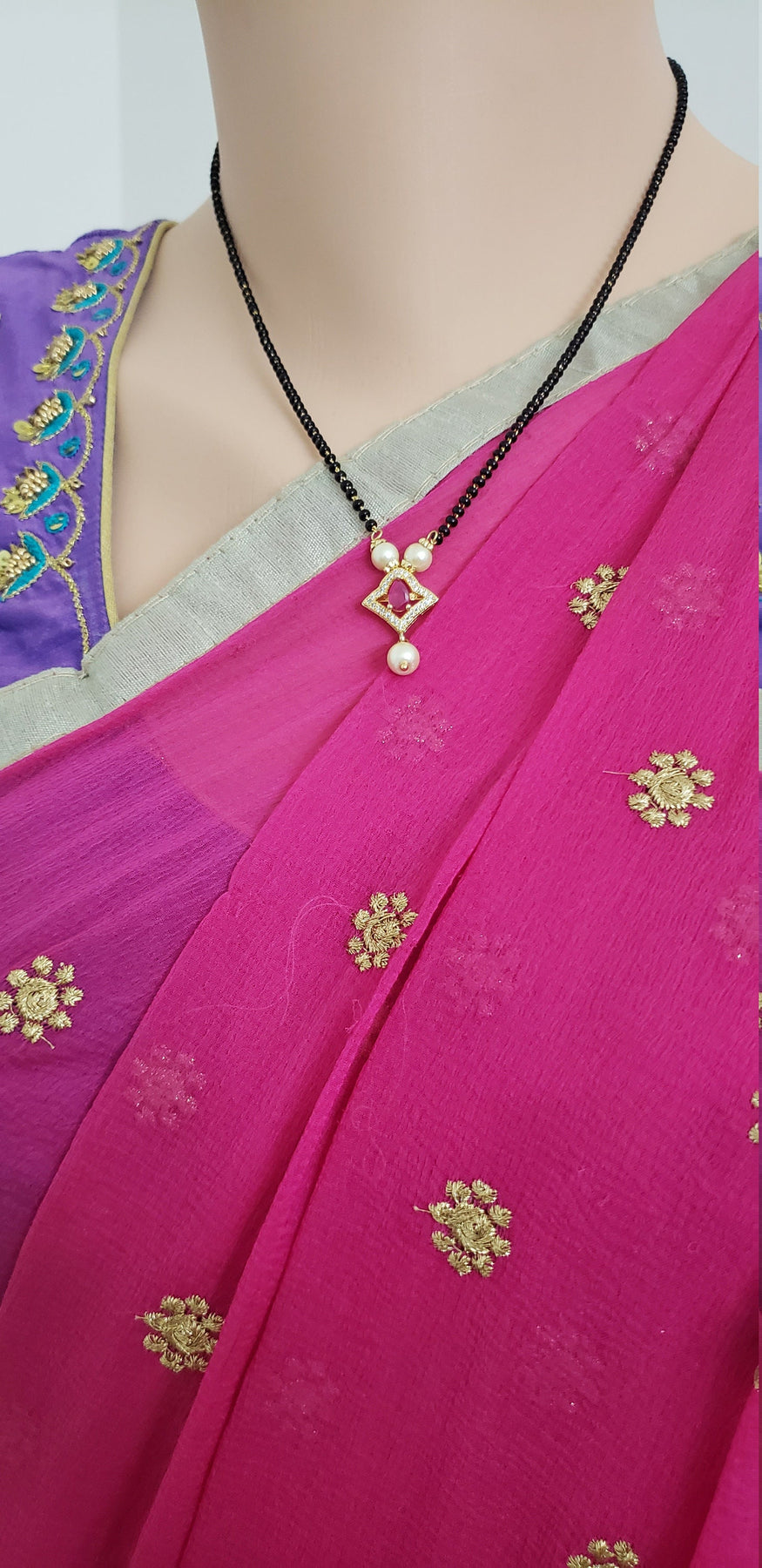 This Beautiful traditional Indian necklace with black beads are handmade antique pendants studded with ruby/emerald stones. It goes very well with ethnic outfits. Makes a gorgeous gift as well.