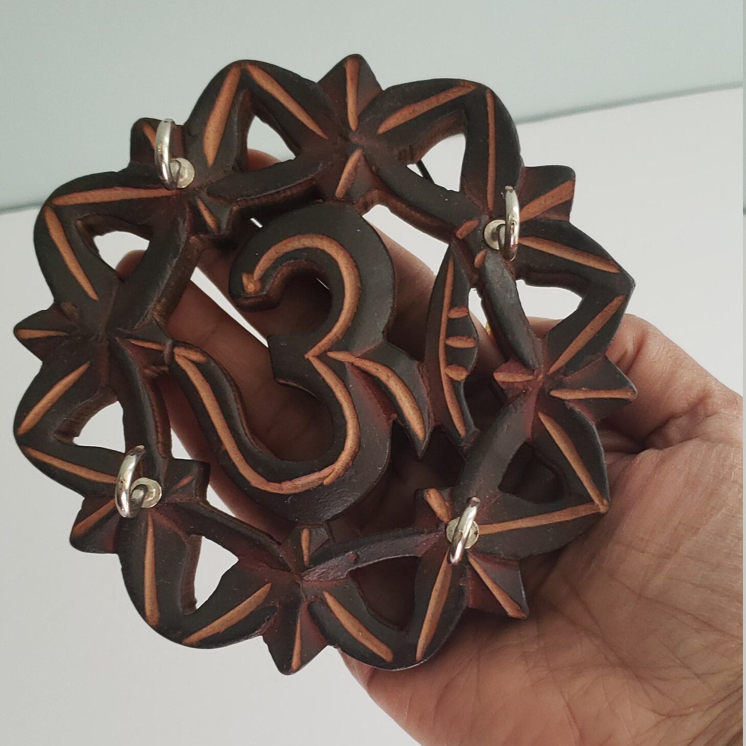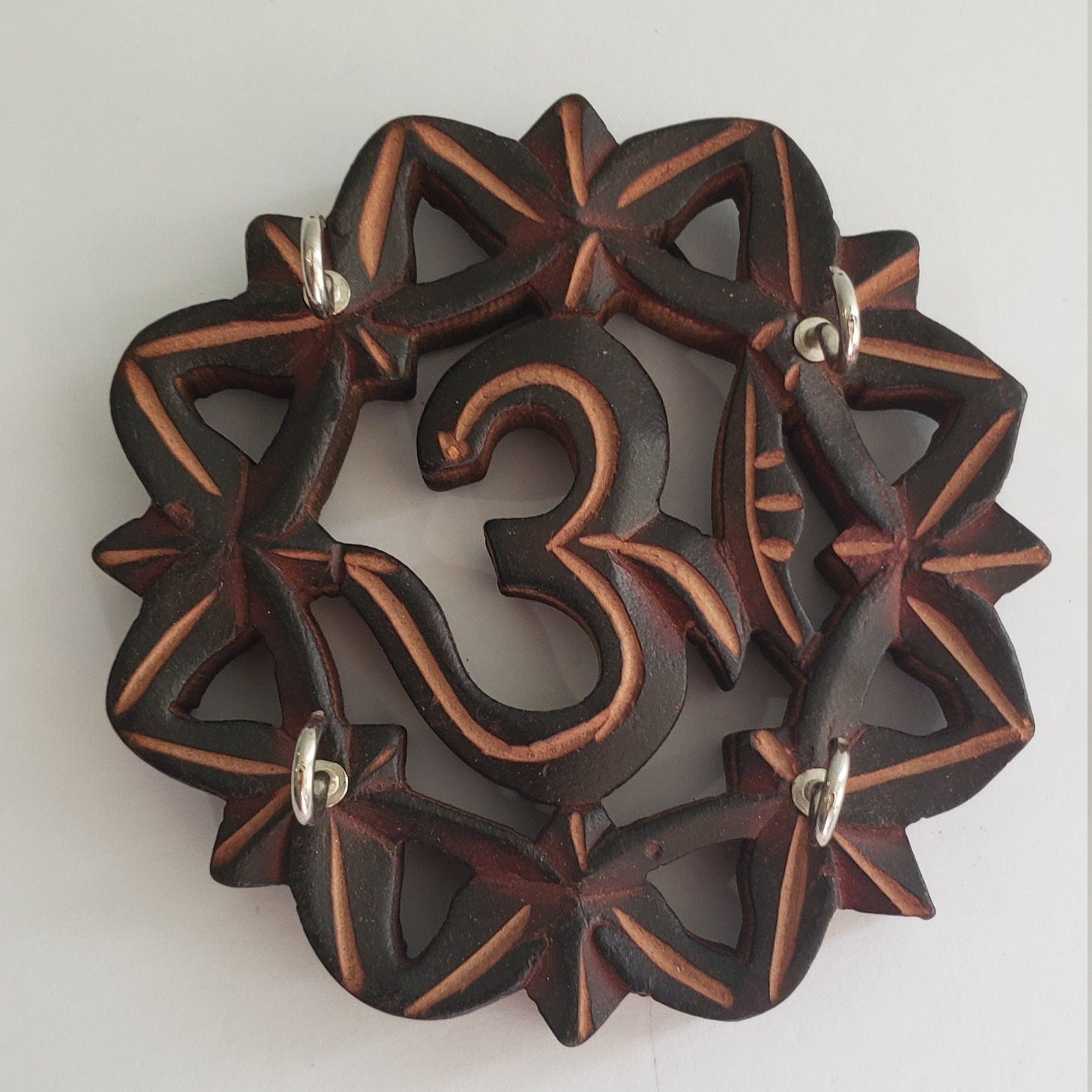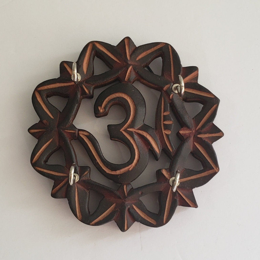 This lovely wood carving in the shape of a mandala OM sign , the symbol of OM signifies grace and blessings to your family members, It is both decorative a functional and decorative piece. It's a nice warm wood and has 4 hooks to hold keys.