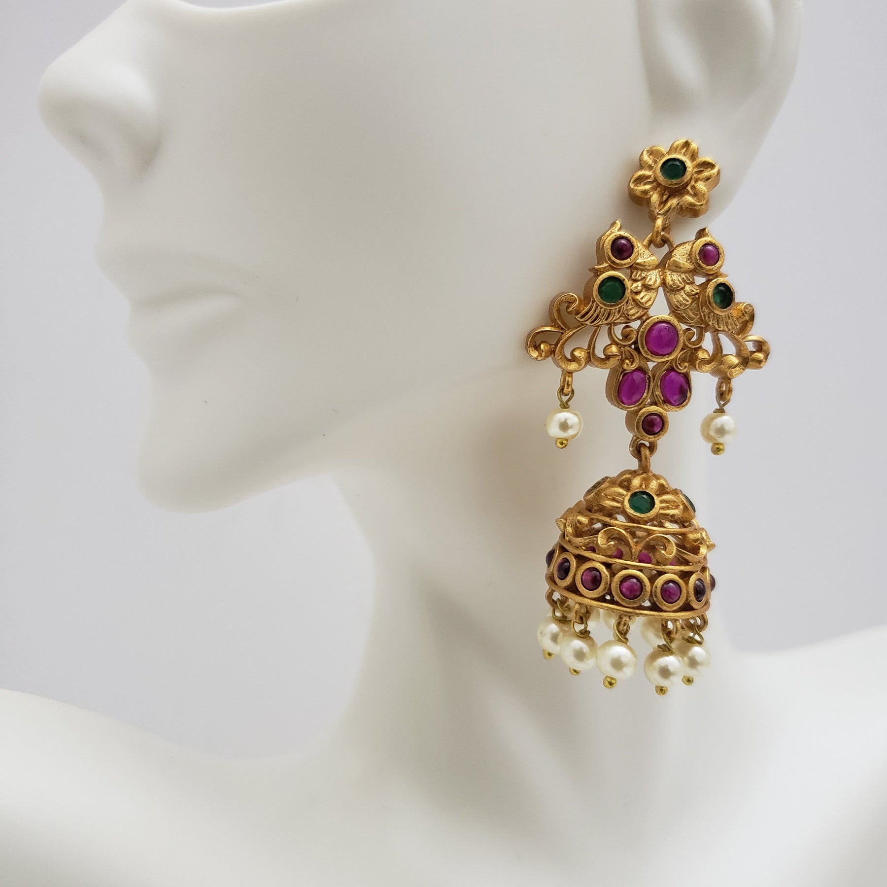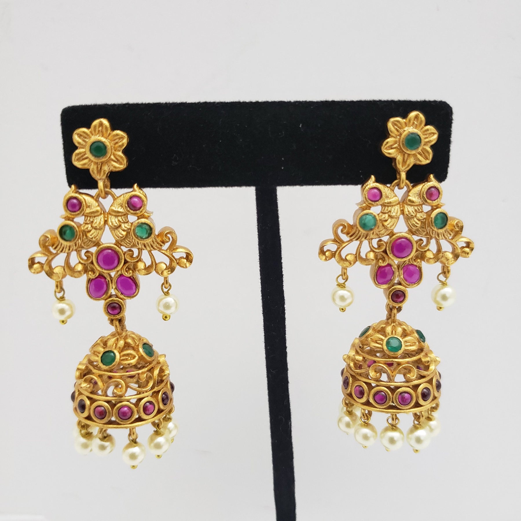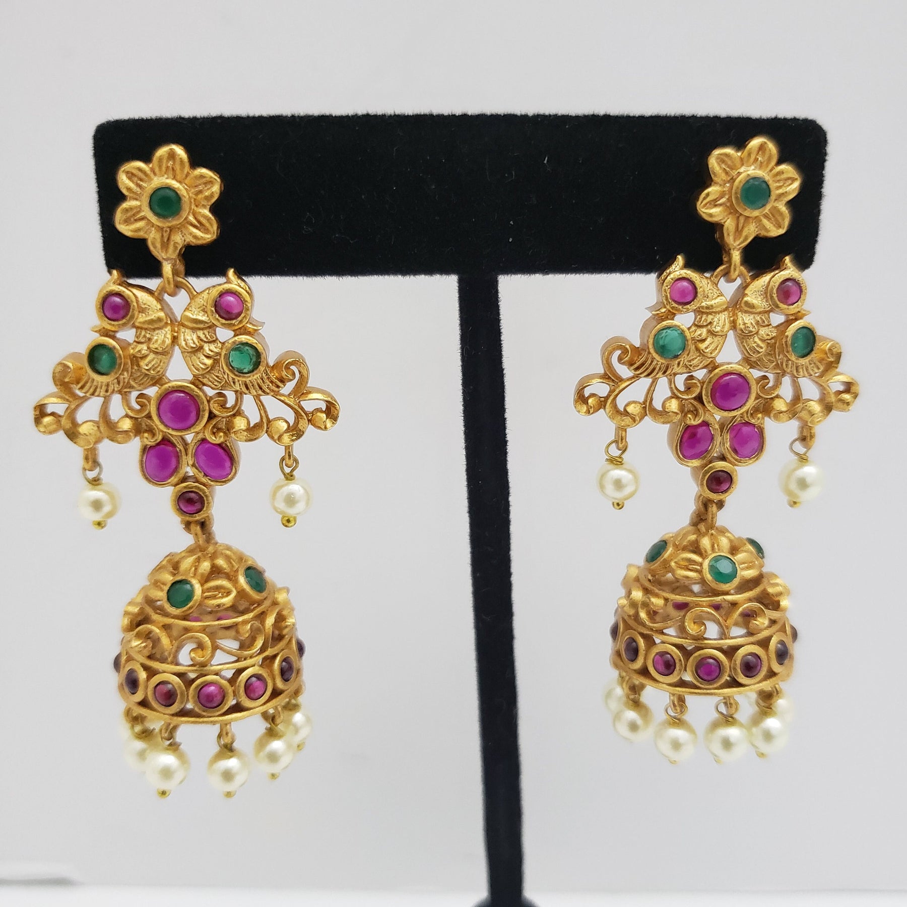 Handmade Indian Temple Jewelry, best to wear it for traditional ceremonies or Indian wedding. This bridal jewelry has an ethnic finish. It has Cubic Zircon stones with semi-precious ruby and emeralds. It is a Bollywood style one gram jewelry. There are long and short patterns of Indian jewelry in Kundan, Pearls, CZ, American Diamond, ruby, emerald, Polki, kemp to suit every occasion of South Indian and North Indian weddings.