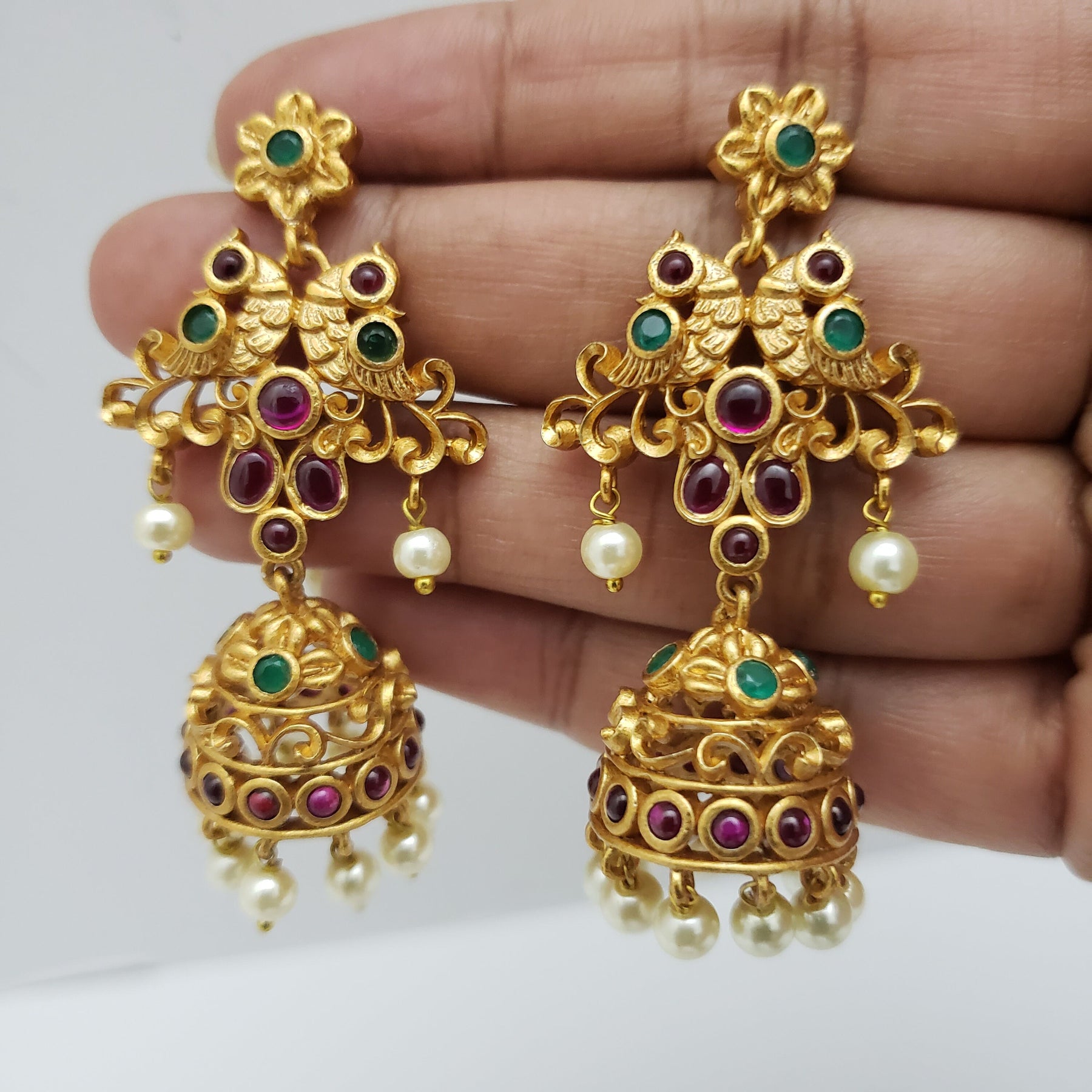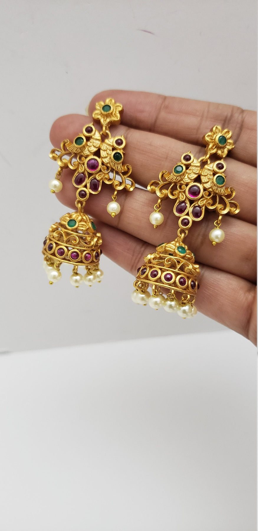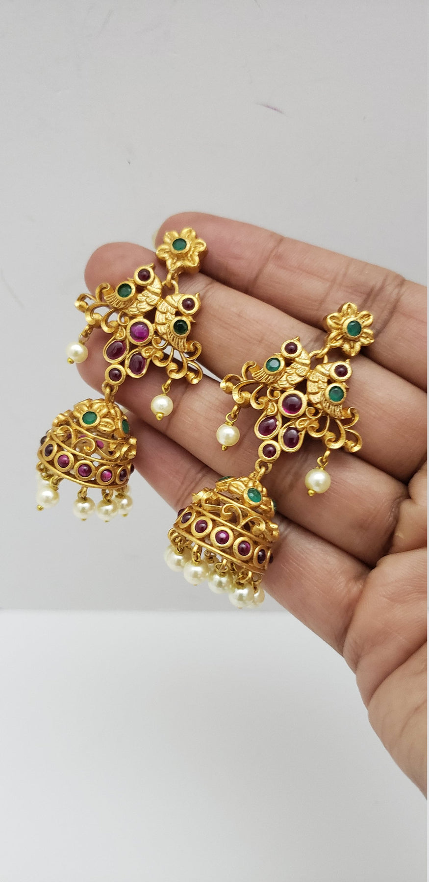 Handmade Indian Temple Jewelry, best to wear it for traditional ceremonies or Indian wedding. This bridal jewelry has an ethnic finish. It has Cubic Zircon stones with semi-precious ruby and emeralds. It is a Bollywood style one gram jewelry. There are long and short patterns of Indian jewelry in Kundan, Pearls, CZ, American Diamond, ruby, emerald, Polki, kemp to suit every occasion of South Indian and North Indian weddings.
