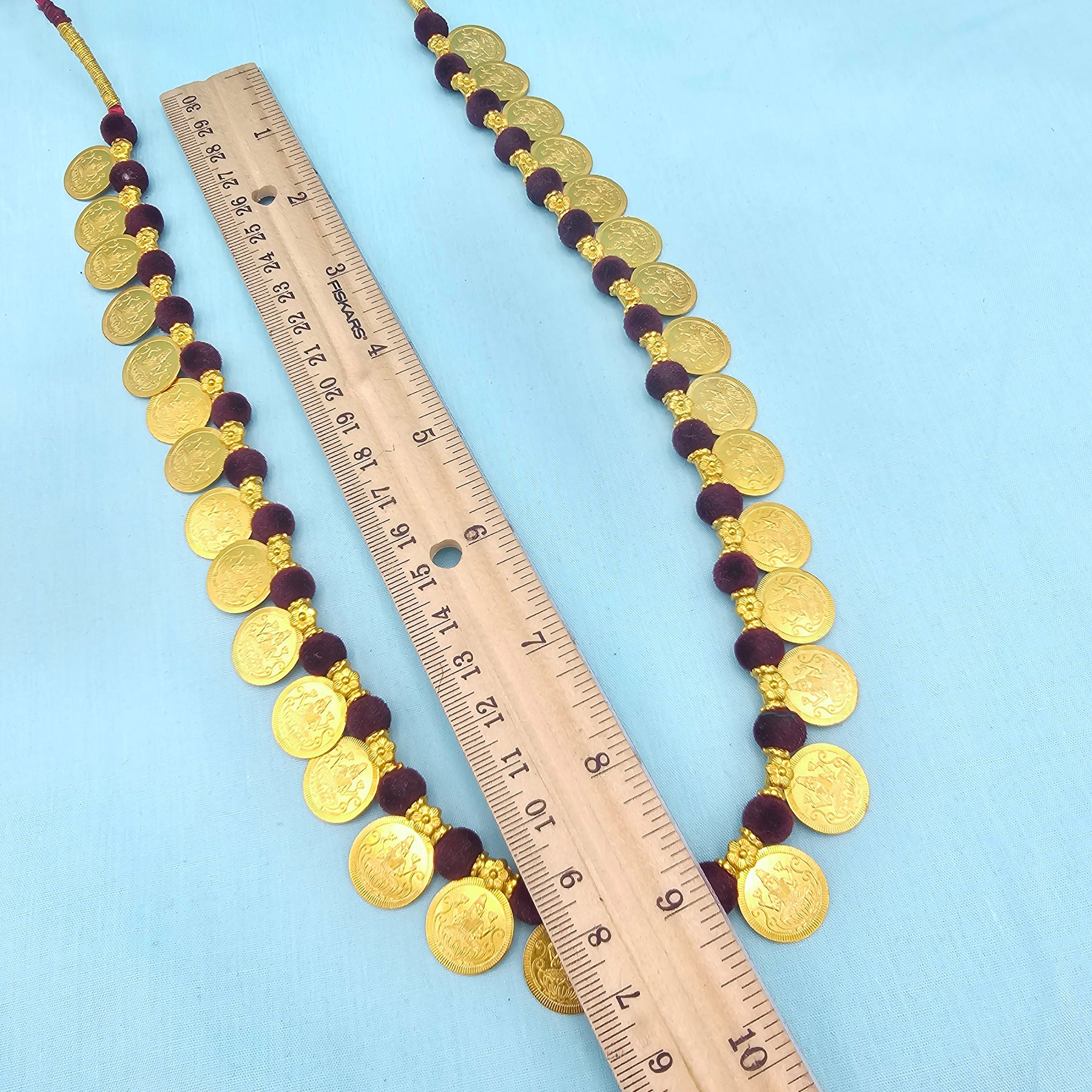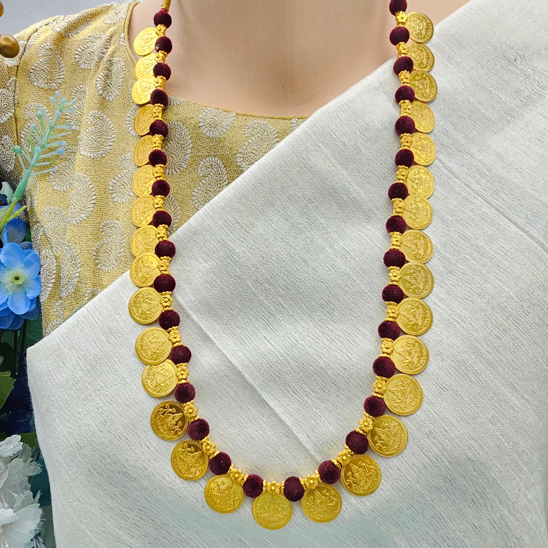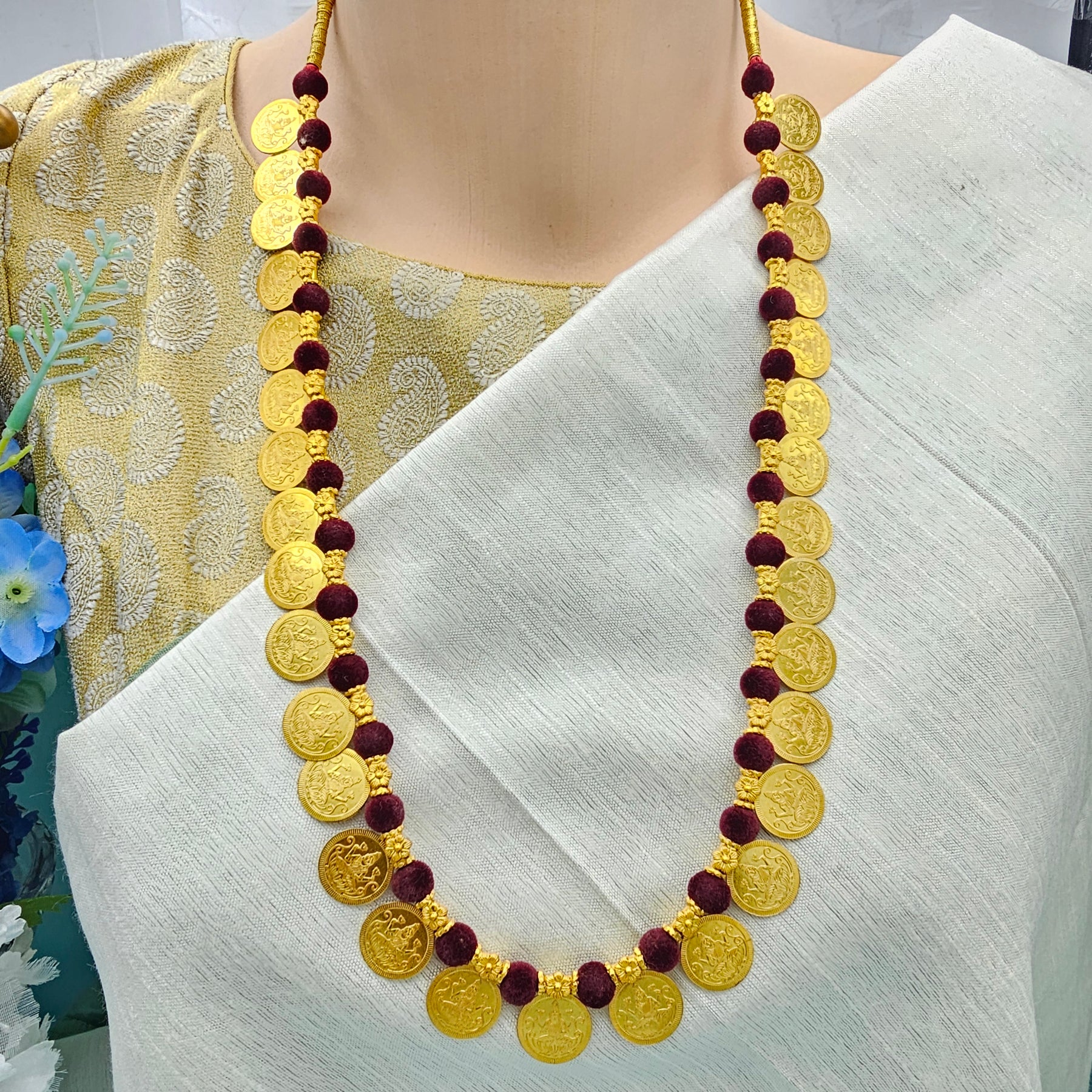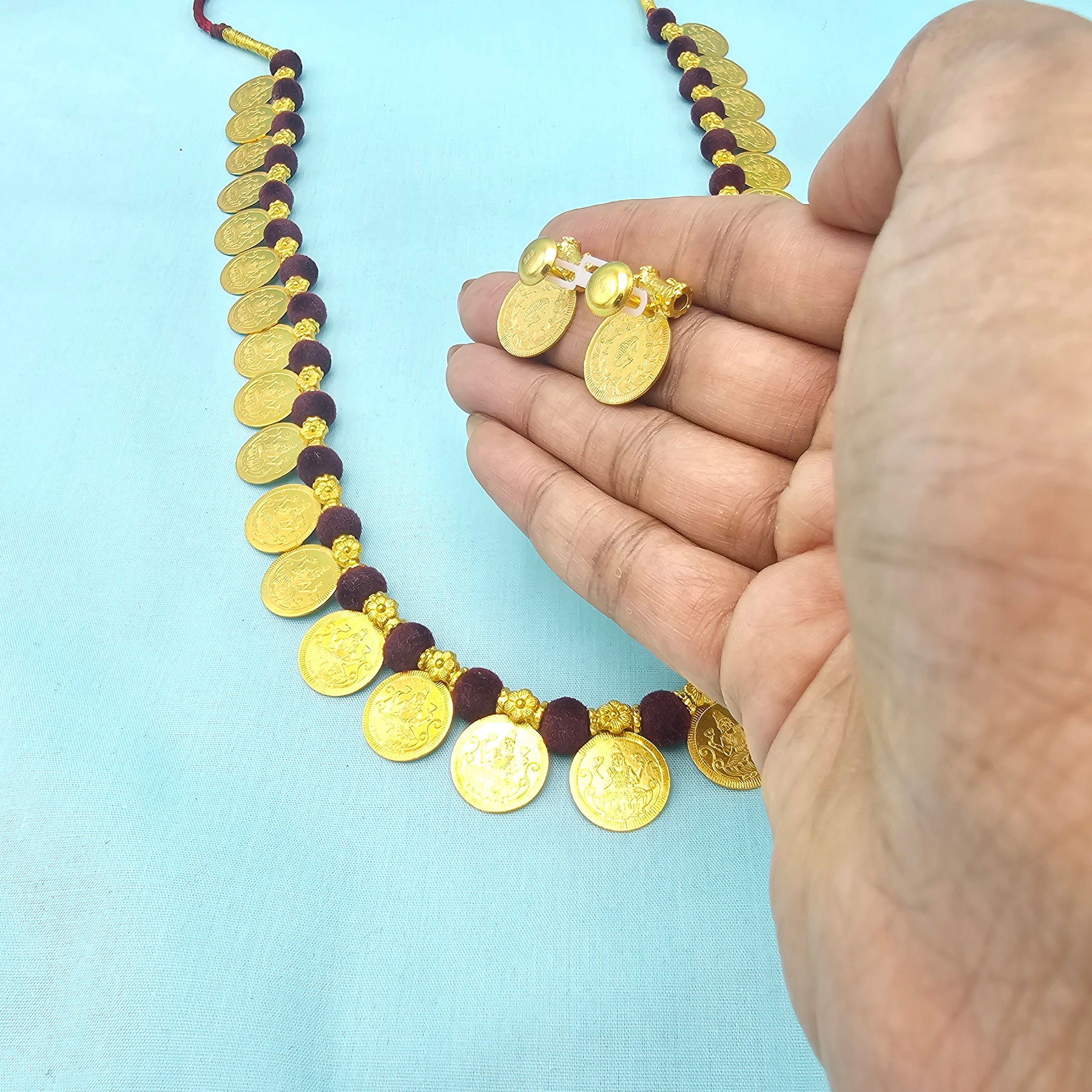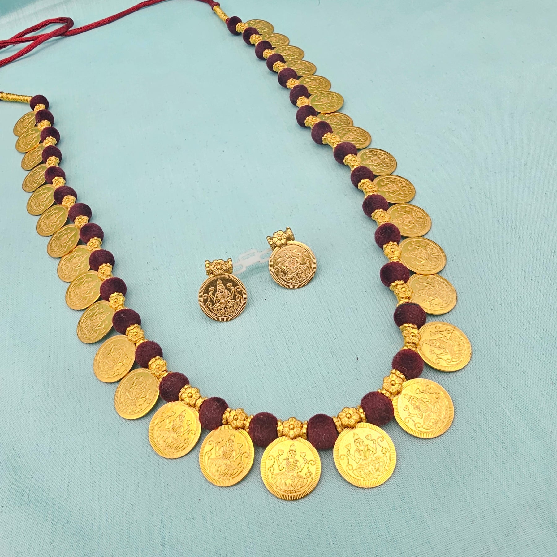 925 Silver Marron thread Kasu necklace, Lakshmi Coin long necklace set with studs, Bright gold coin silver jewelry, 92.5 Hallmark Indian jewelry