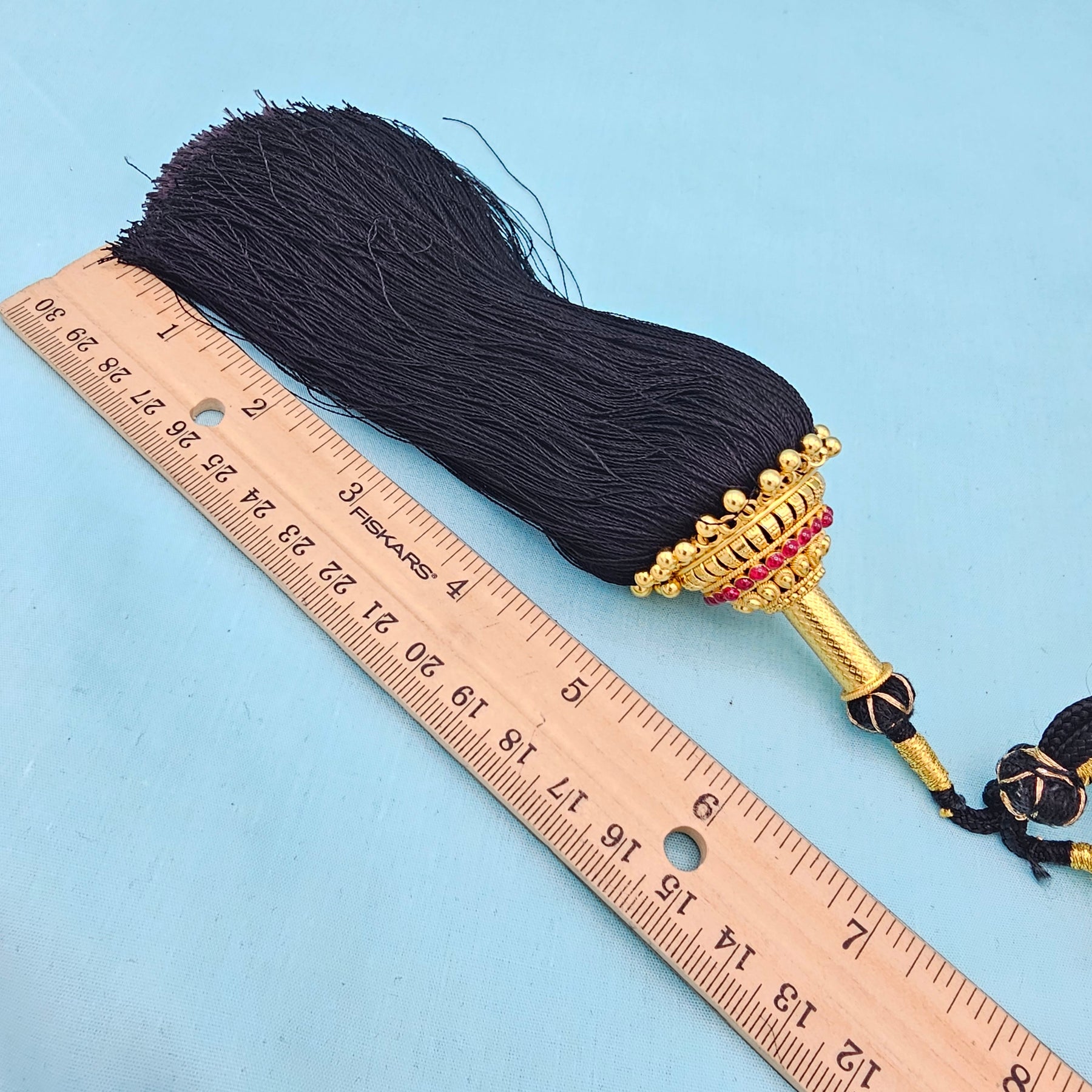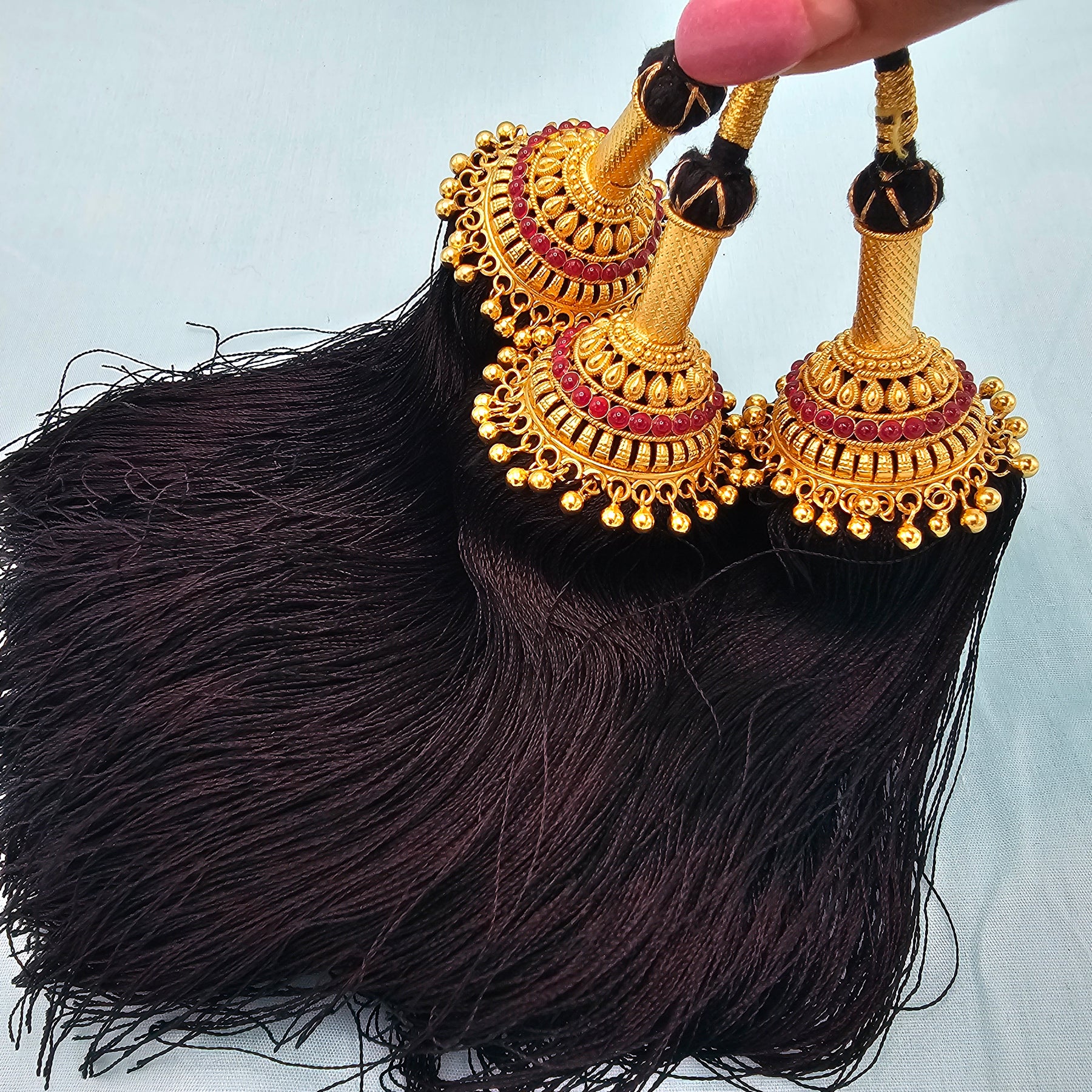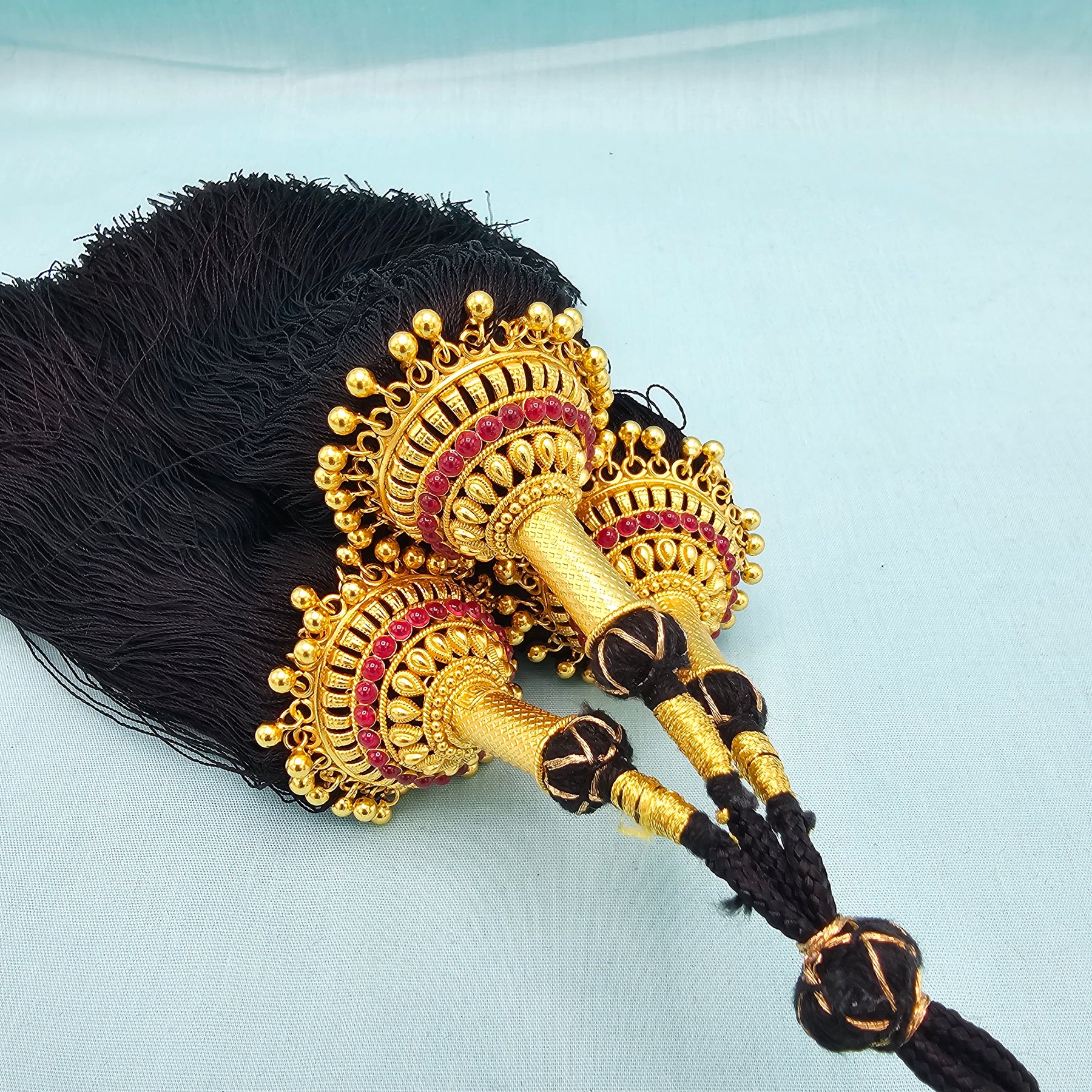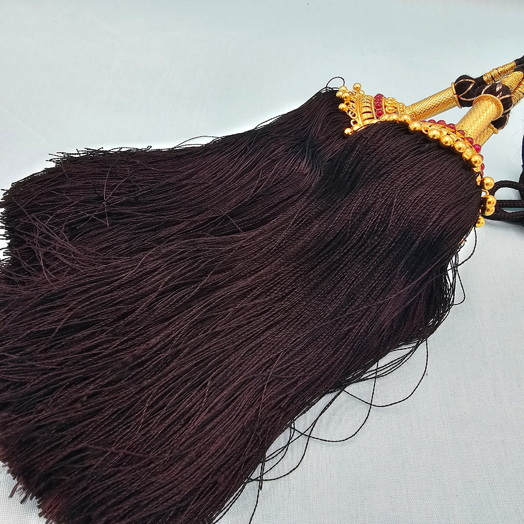 The hanging portion of the jada kunjalam would be straight while the knot is removed. This is the way the Hair Kuppulu is made.