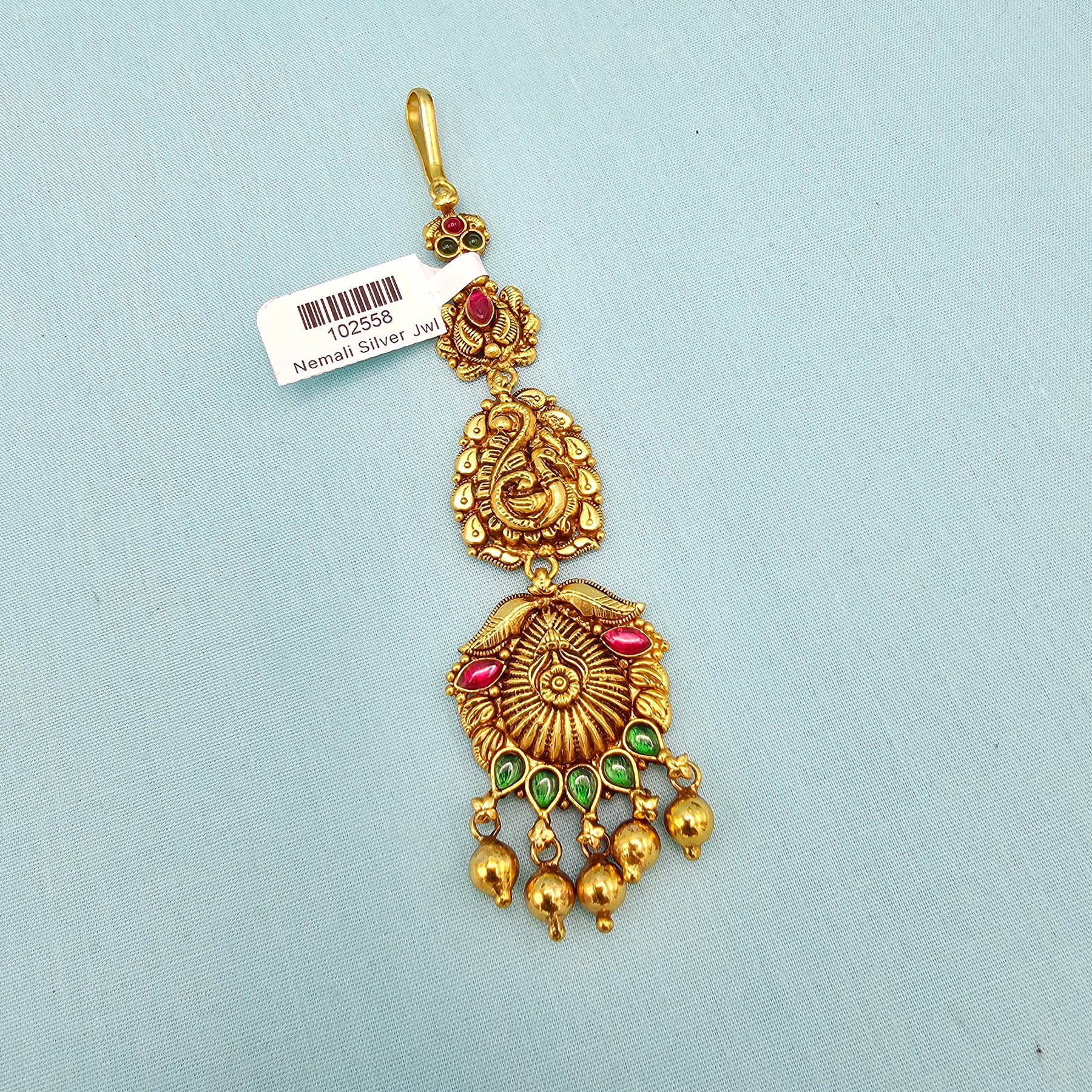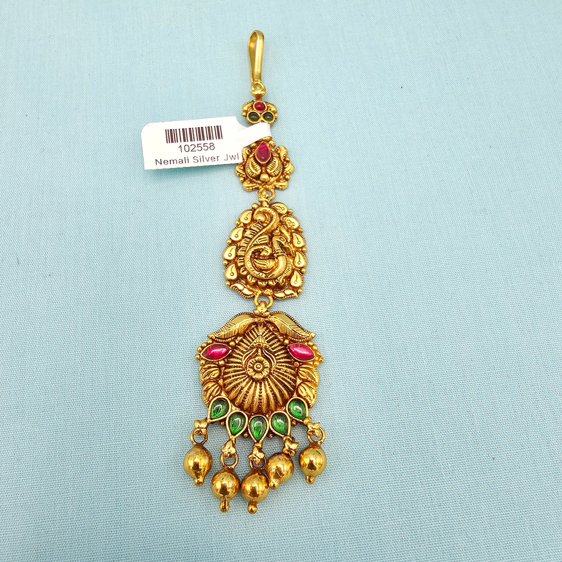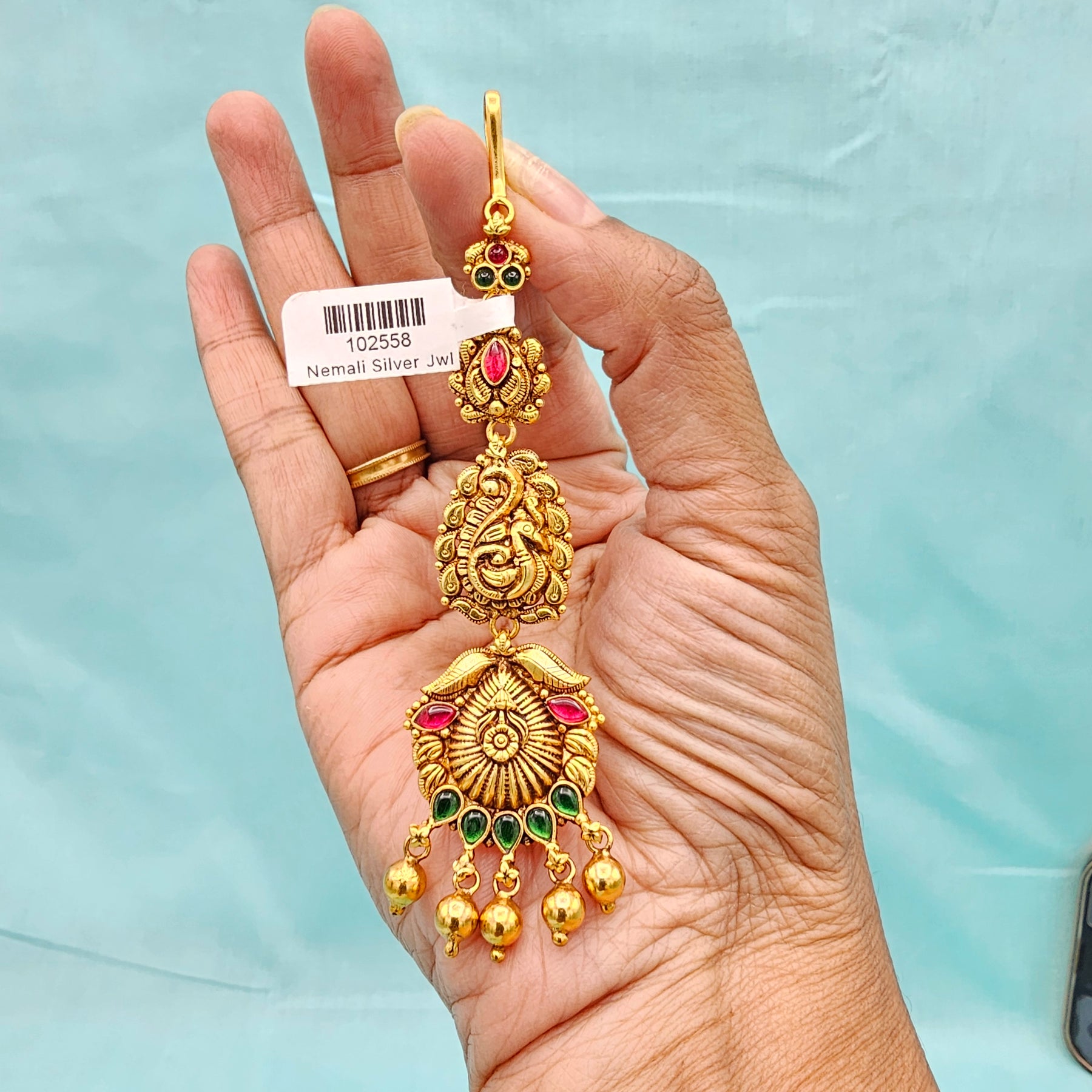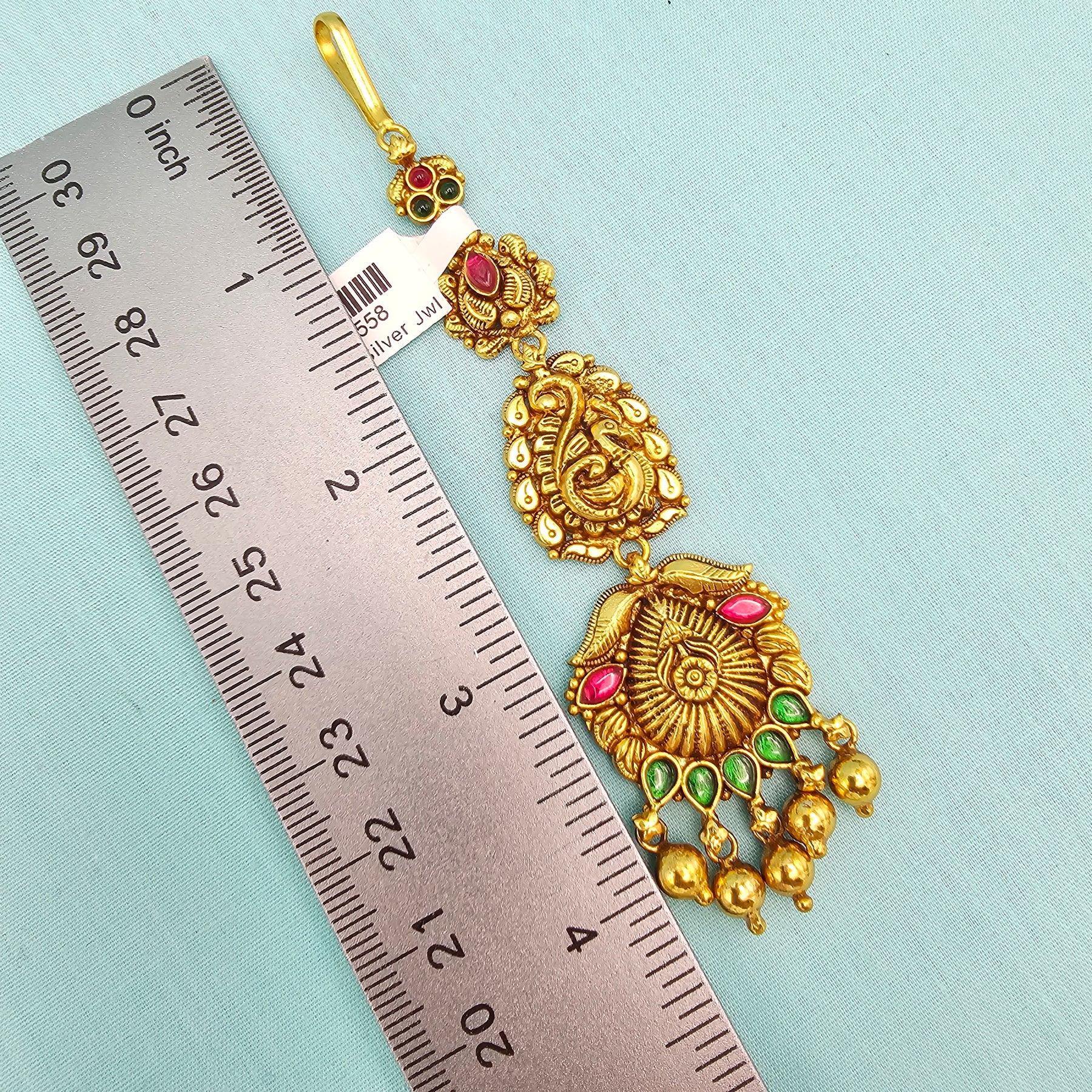 When you adorn maang tikka on your forehead and it will steel the show. This silver Mang Tikka has pink, green and white kundans. This intricately designed " tikka" would surely glamorize any occasion. They give a glamorous outlook to the traditional outfits.