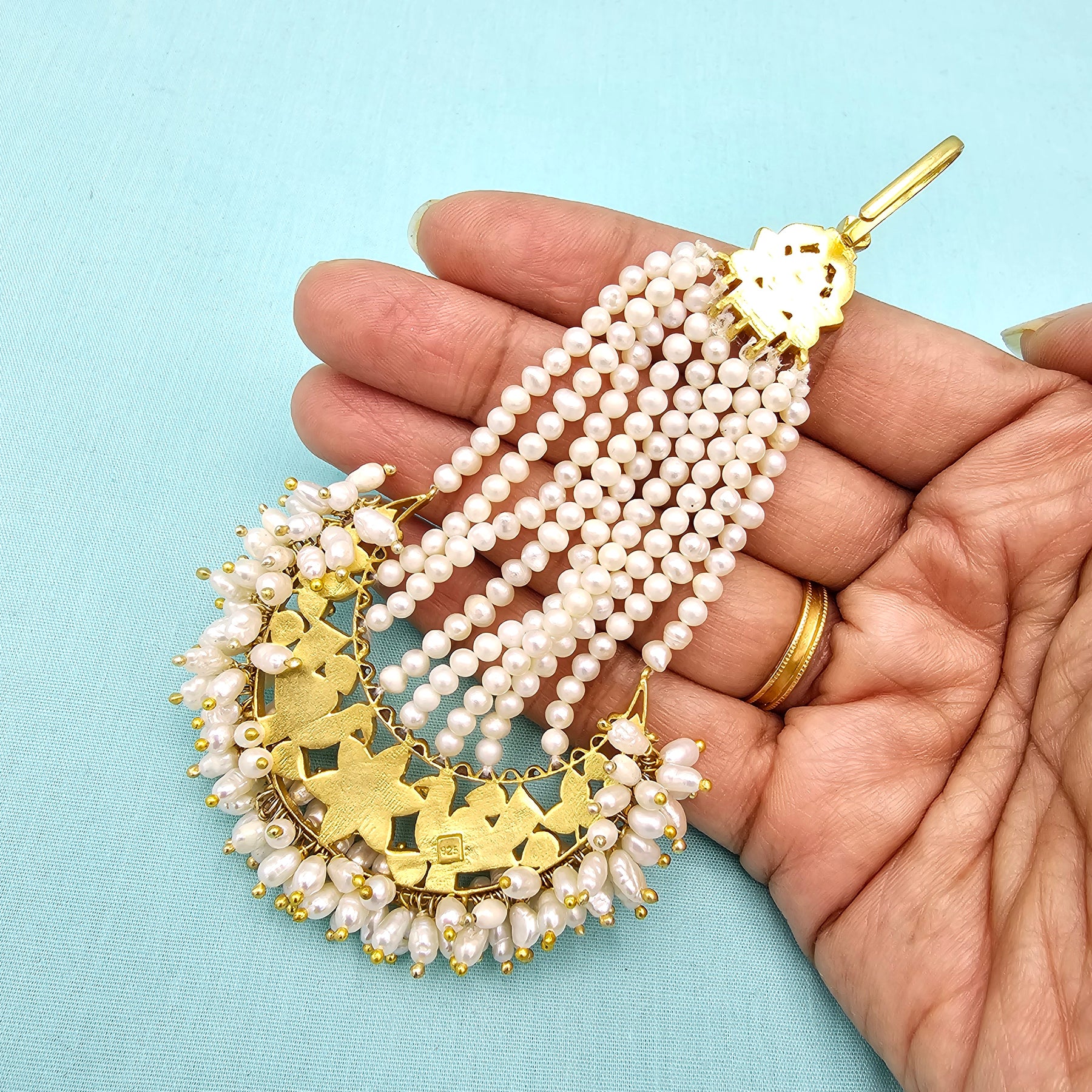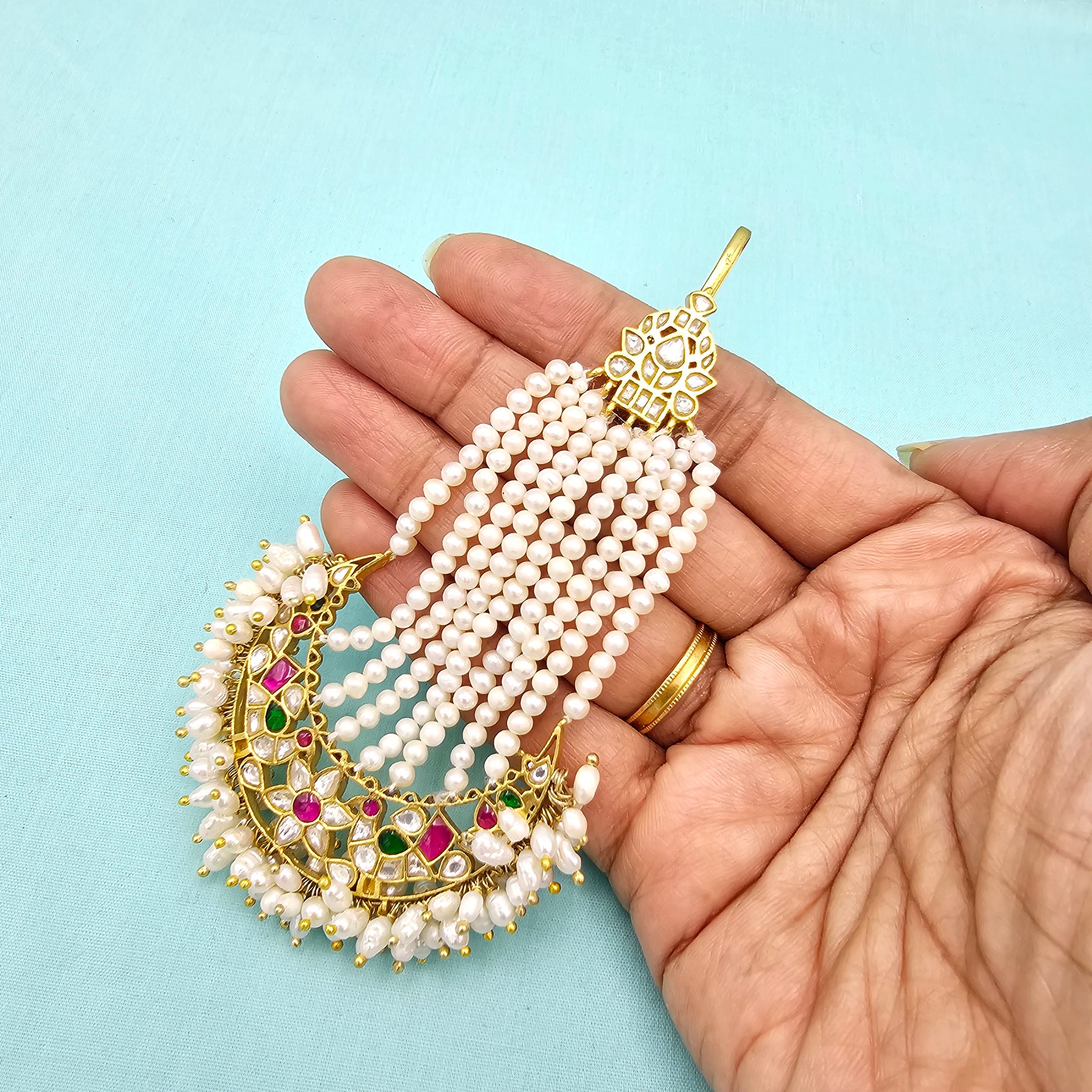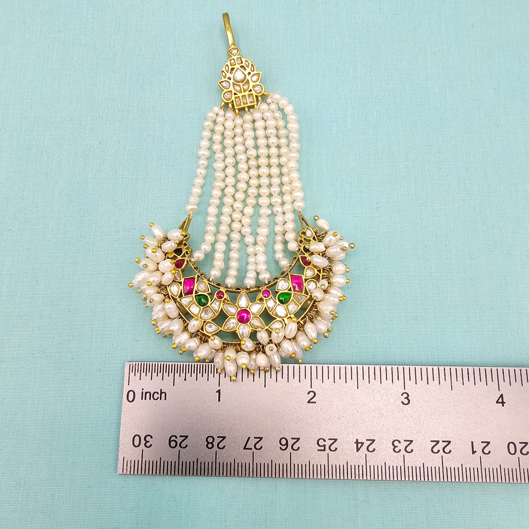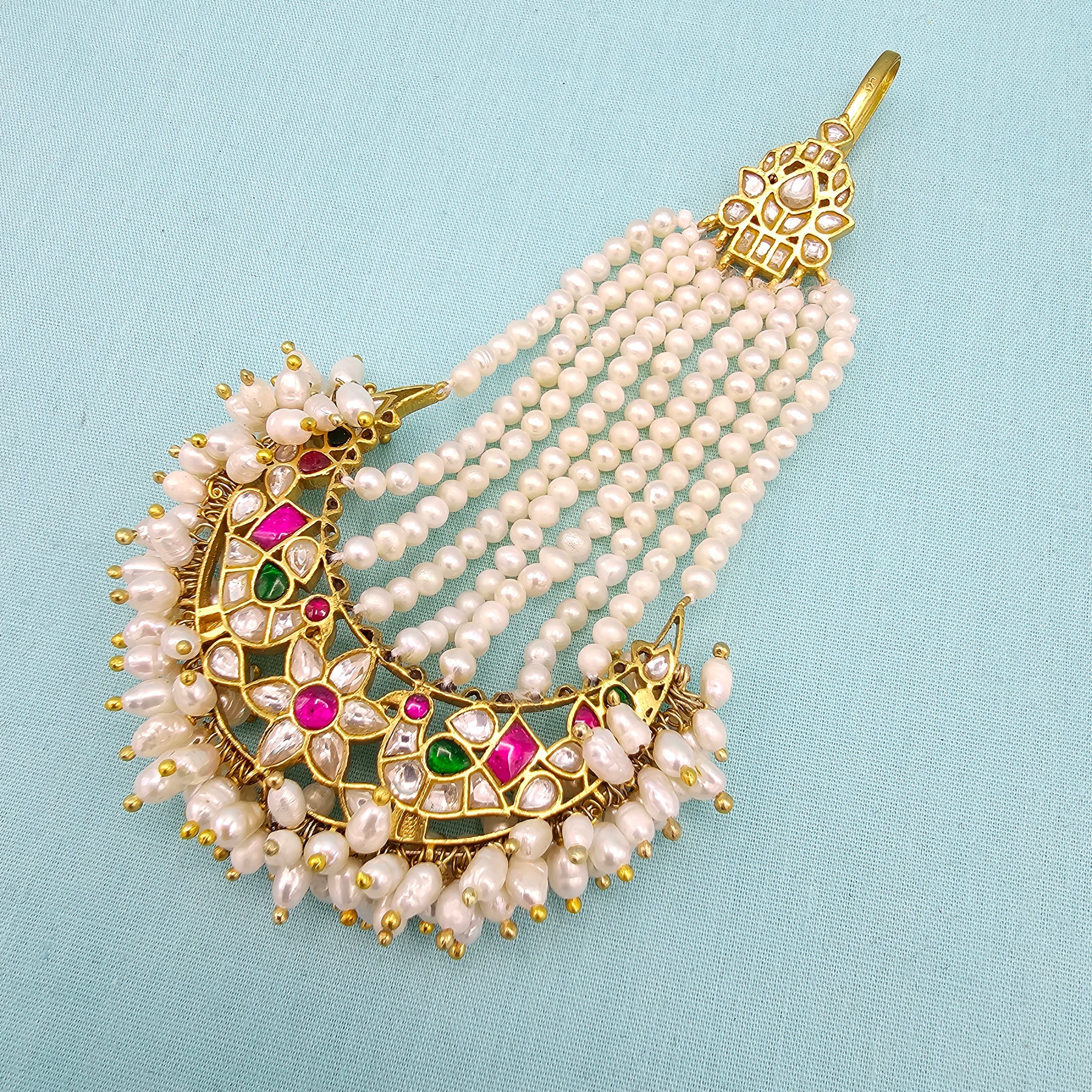 Add a royal touch to your hairstyle with this elegant silver Passa. Perfect for weddings, festive occasions, or traditional events, this timeless piece beautifully adorns the side of your hair, giving you a regal Mughal-inspired look.
